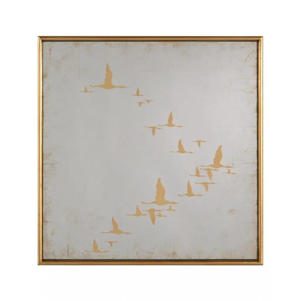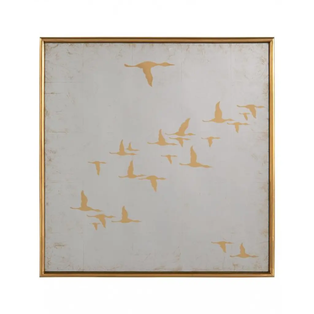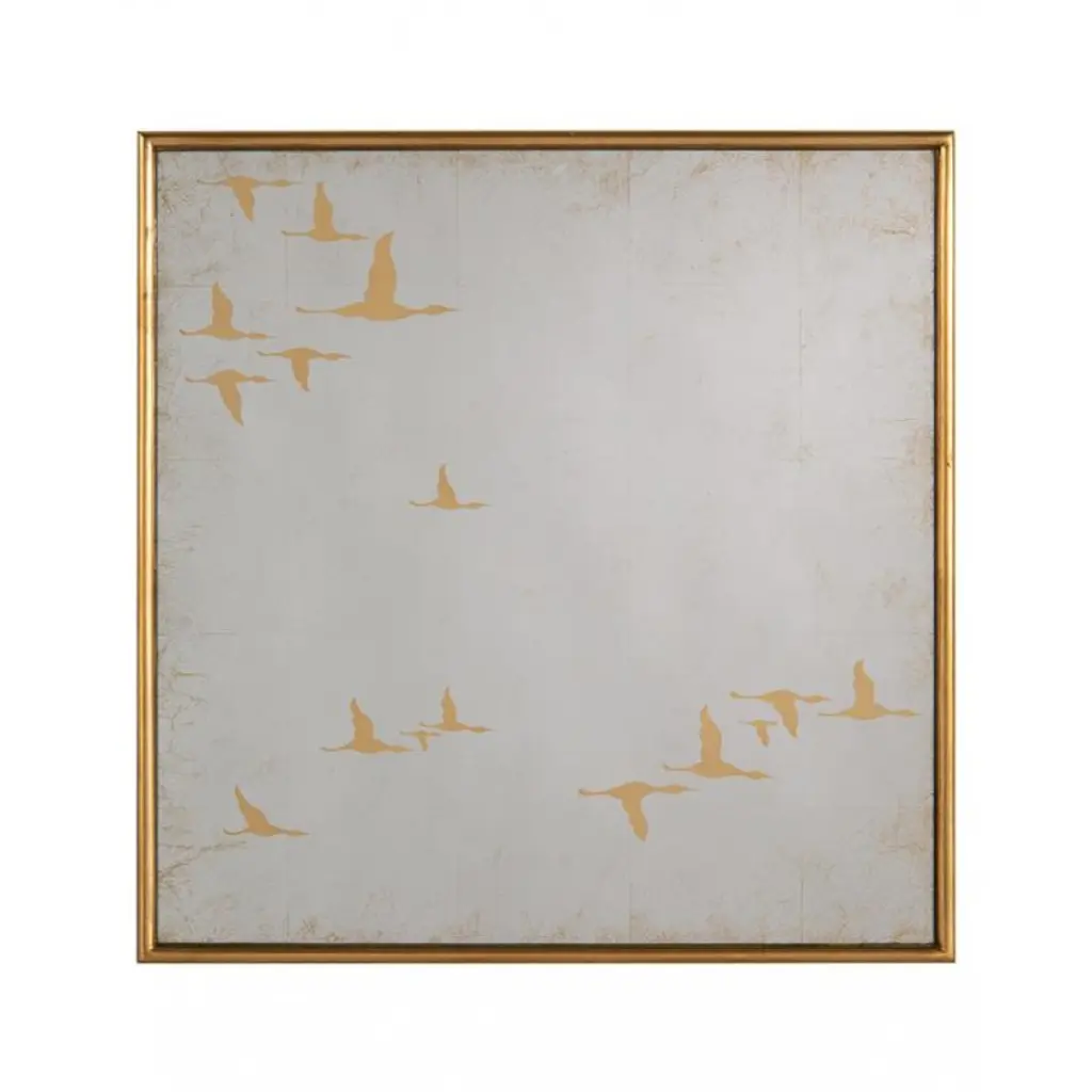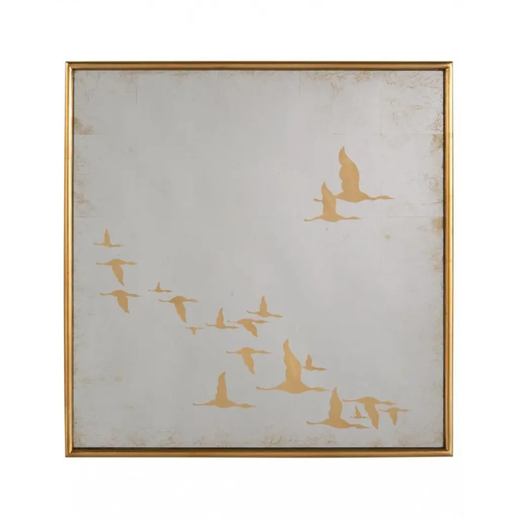 19"W X 19"H X 1"D (each) This set of nine framed églomisé panels features a pattern of migratory birds in gold spanning the set. A cockbead frame in exotic gold surrounds each panel. Steel hangers are fitted for hanging, and the set is hung three by th