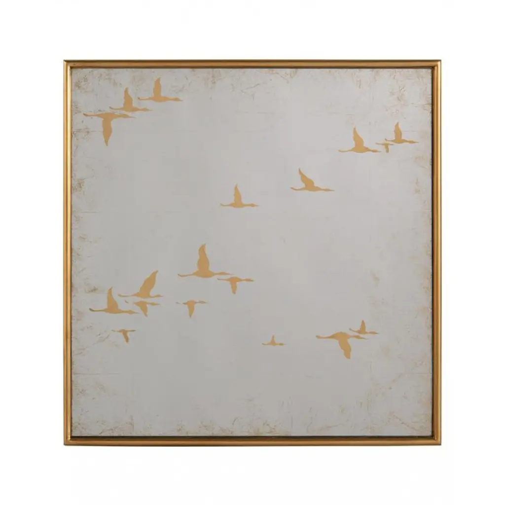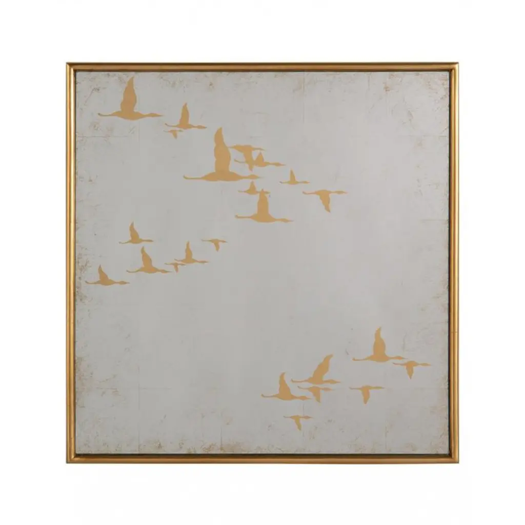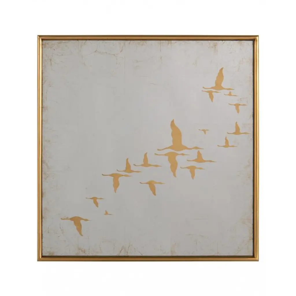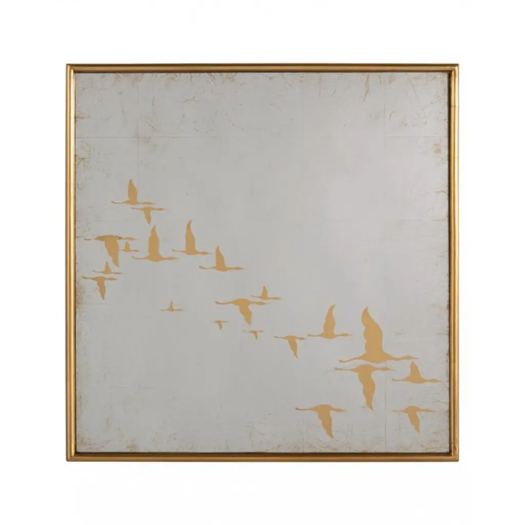 19"W X 19"H X 1"D (each) This set of nine framed églomisé panels features a pattern of migratory birds in gold spanning the set. A cockbead frame in exotic gold surrounds each panel. Steel hangers are fitted for hanging, and the set is hung three by th