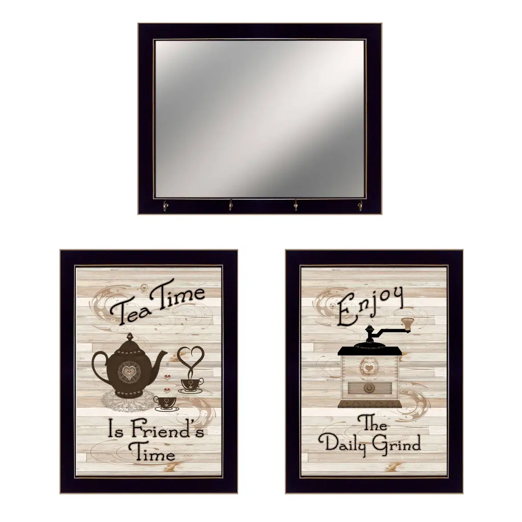 Set Of Three Enjoy Tea Time 8 Black Framed Prints And Mirror With Hooks - Black
