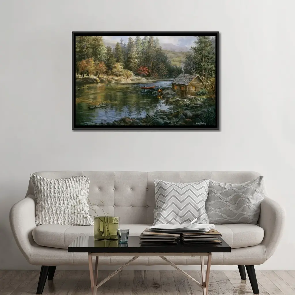 Set Of Three Lakefront Camping 2 Black Framed Print Wall Art With Mirror - Black