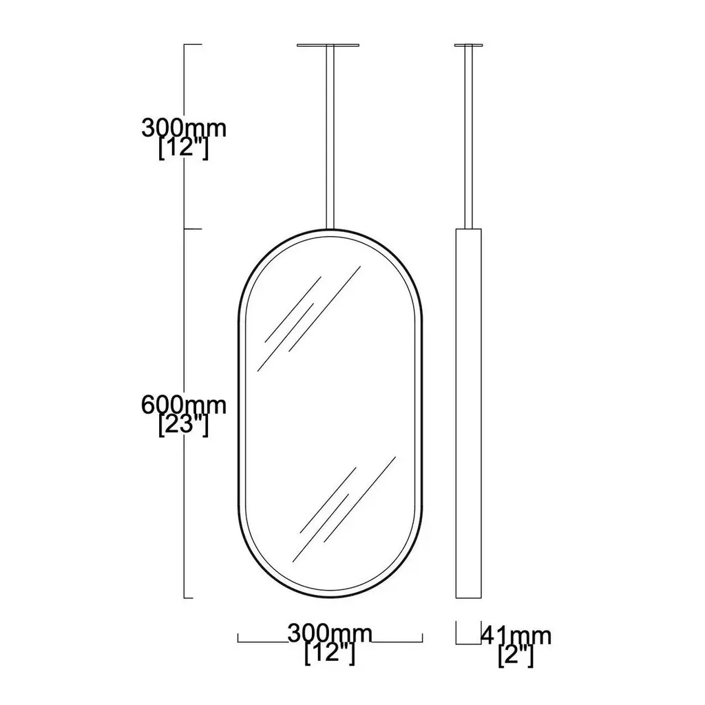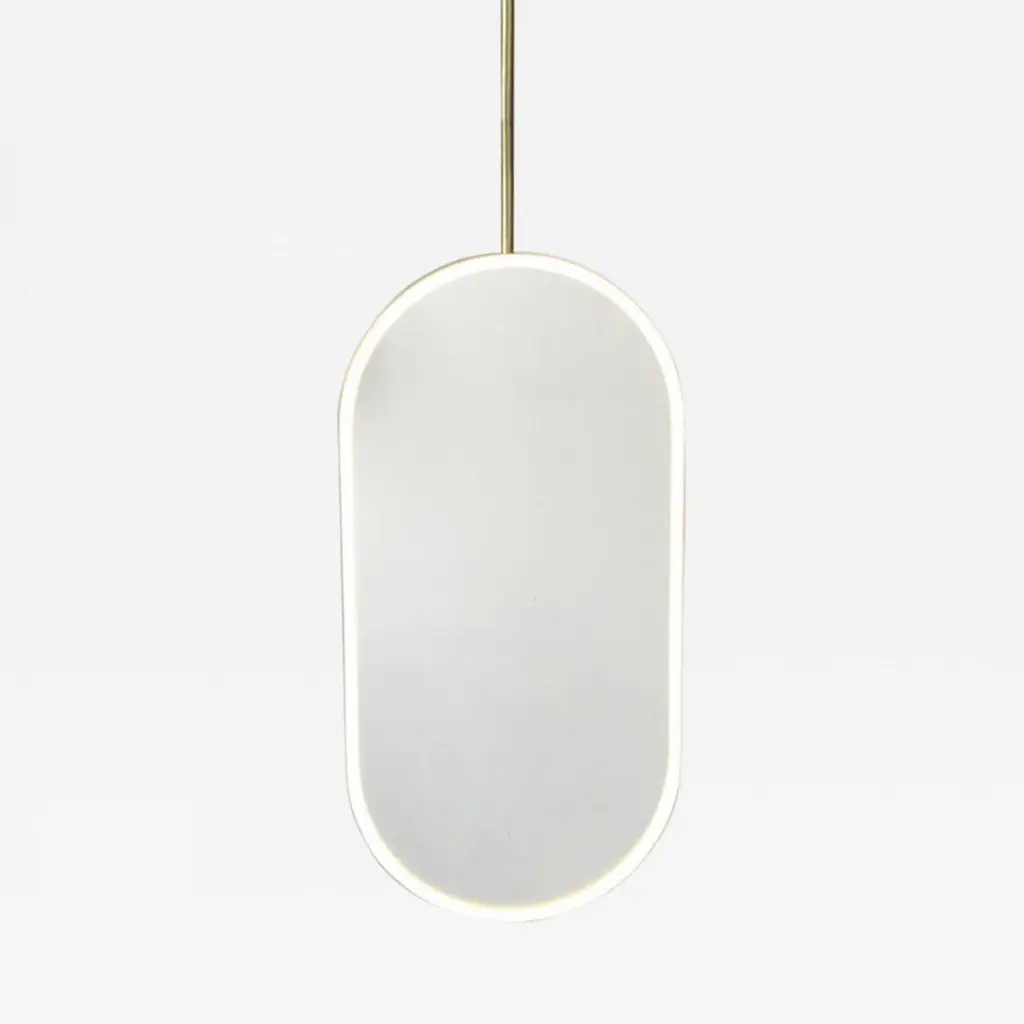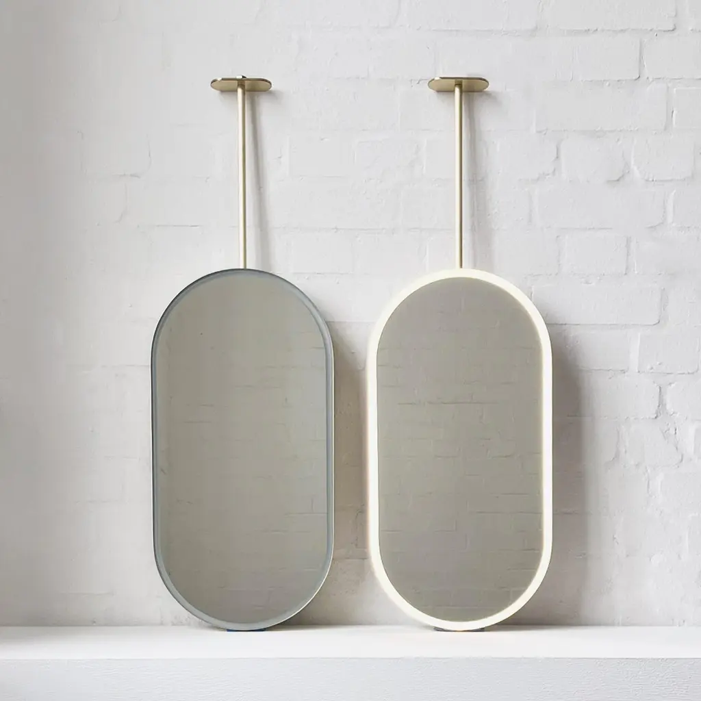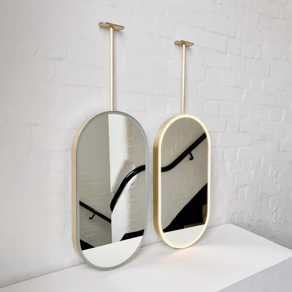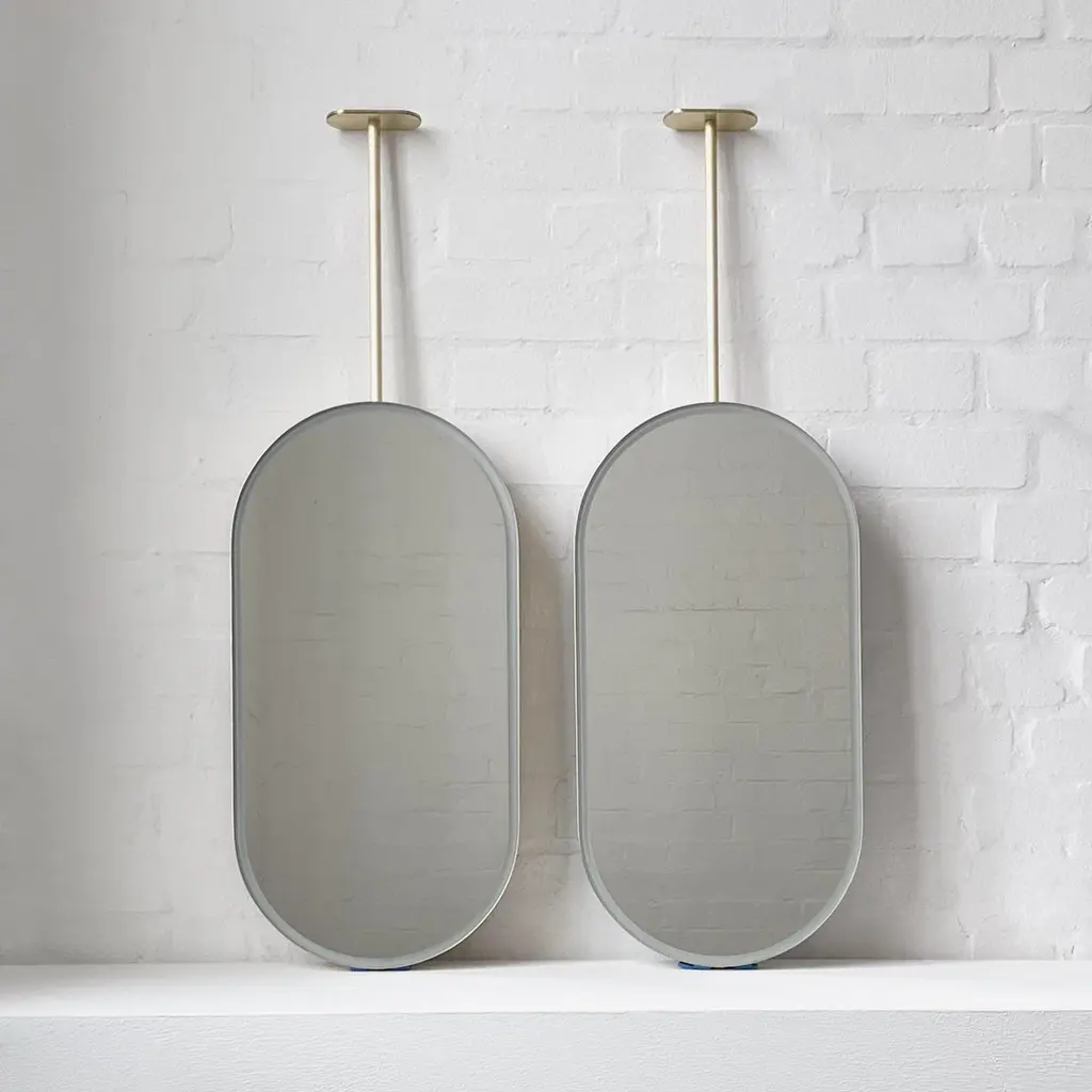 Set of two modern front illuminated Capsula™ ceiling suspended pill shaped mirrors with a minimalist brushed brass frame. Designed and handcrafted in London, UK. This mirror is fully customisable to suit the specific requirements of each interior.Mirror backing. The quality finish of our suspended mirrors extends to their backings, which are made from a powder coated panel available in black or white. The mirror backings can also be upgraded to a finish that matches the frame or they can be substituted by a second mirror, making your mirror double sided.Cover plates. The ceiling plates are supplied with a cover hiding the screws to complete the minimalist design of the mirror.Standard Illumination. The mirror features warm white LED lighting with a colour temperature of 2800–3300K and a power consumption of 14.4W per meter. It has an IP67 rating.Driver. A non-dimmable driver compatible with local voltage is supplied as standard. Alternative drivers — including dimmable versions or different colour temperature options — are available upon request.Shipped safely and insured worldwide. All our mirrors are made on demand. Fabrication lead time for this mirror is approximately 6 to 7 weeks. Our mirrors are always shipped by courier express. Shipping via courier express typically requires 1 to 2 days to the UK, or 2 to 7 days outside the UK depending on the destination.Dimensions (customisable):60 cm x 30 cm x 4.1 cm / 23.6 in x 11.8 in x 1.6 inThe mirror is illustrated with a drop of 30cm (11.81in) but it can be made in a bespoke length. Please contact our team for further information. Available options:- frame finishes: brass (brushed, polished or with a bronze patina), copper, stainless steel, blackened metal, powder coated aluminium in a range of standard or bespoke colours- full frame- backing with a finish that matches the frame- double-sided mirror- mirror tints: standard silver, black, bronze, blue, rose gold / peach- back-illumination creating a halo effect- ON/OFF sensor switch- dimmable driver- demister pad- bevelA presentation illustrating the options above is also available on demand. Please contact us for a quote for any bespoke specification or added options.IMPORTANT NOTES:This suspended mirror is intended to be mounted onto the ceiling and cannot be installed onto a countertop. Countertop mounted mirrors are available on demand.ORDERS OF MULTIPLE MIRRORS OF THE SAME TYPE: Please contact us to receive a Packing and Shipping quote when ordering multiple mirrors of the same type. An order for multiple mirrors of the same type may not be accepted without extra packing and shipping fees. Thank you.