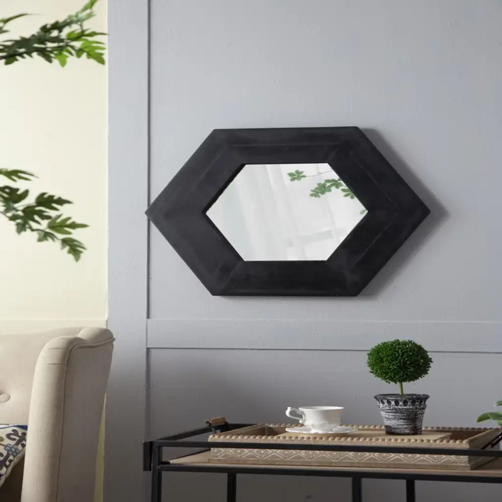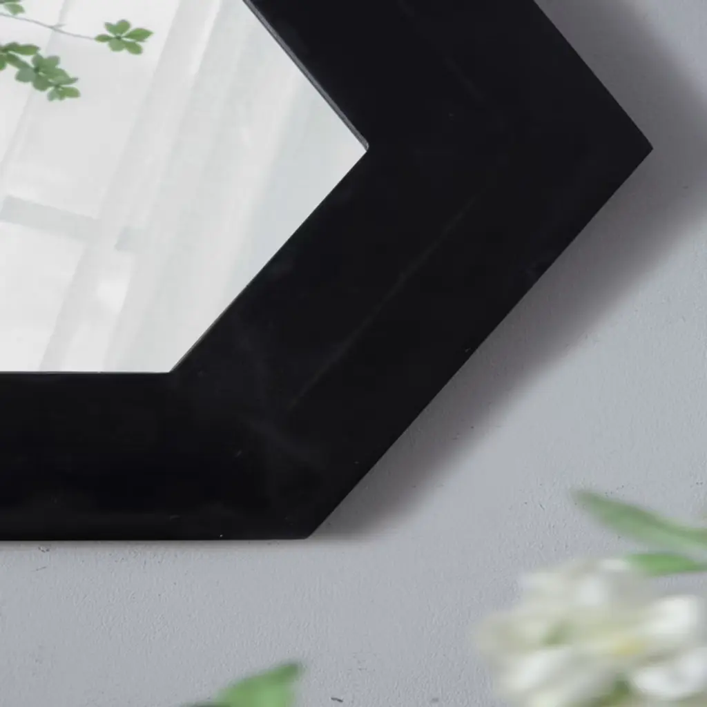 SEVOBAL Bathroom Vanity Mirrors Modern Hexagon Mirror with Durable Solid Wood Frame Scratch-Resistant Glass SEVOBAL's hexagon mirror brings a modern touch to any space with its unique shape and solid teak wood frame. The durable teak wood provides natural warmth and long-lasting beauty. Perfect for compact areas, this mirror reflects light to brighten your home and adds a sleek focal point with its minimalist, contemporary design that enhances any decor.