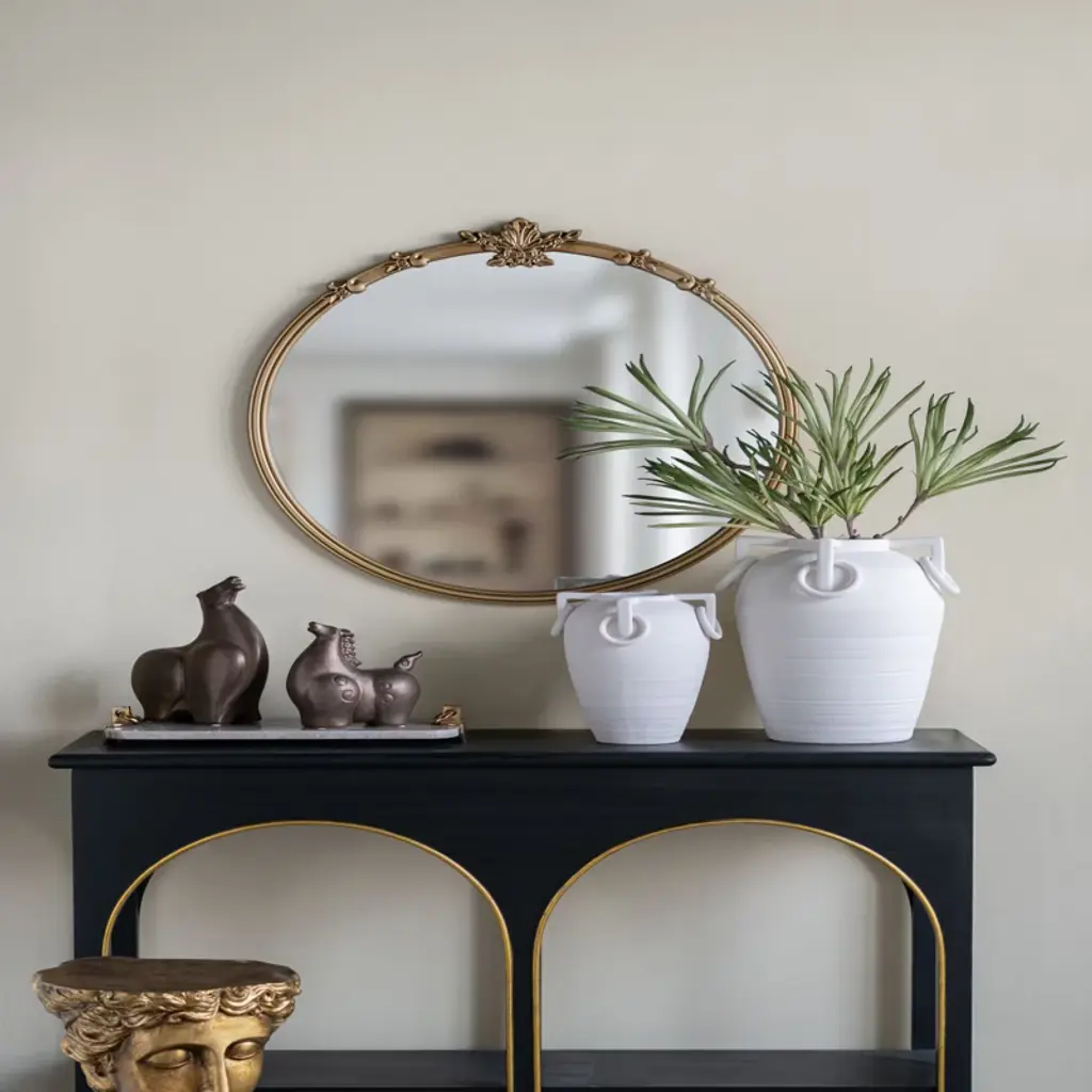 SEVOBAL Bathroom Vanity Mirrors add timeless elegance and artistic charm to any room with a round frame featuring a detailed leaf crest and clear reflective surface. Crafted from durable lightweight materials this mirror is easy to hang and ideal for hallways bedrooms living areas or entryways. It enhances space with depth and sophistication while offering versatile placement and simple maintenance for everyday use.