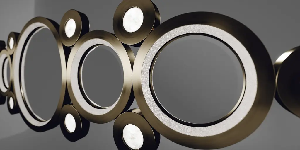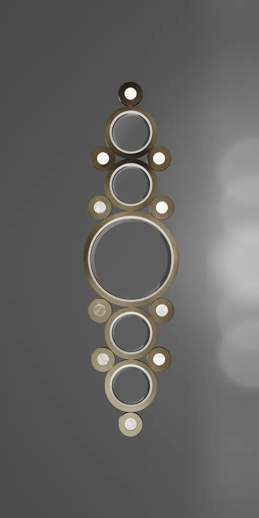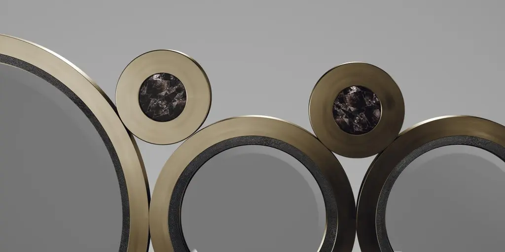 The Paris based label has distinguished themselves since their launch, with their iconic use of shagreen mixed with brass and other exotic materials. All furniture is handcrafted by skilled artisans, ultimately making each piece unique, designed in Paris and produced in the Philippines.The circle mirror by R&Y Augousti in cream shagreen, white quartz and dark bronze-patina brass, is an archive piece of theirs from the 1990s. The statement wall piece adds drama and flair to any space and shows the richness of their incredible artisan work. This mirror can be hung on the horizontal or the vertical. Available in other finishes, see images at end of slide.All shagreen is hand-dyed by our artisans. This finish is called "antique natural" shagreenThe dimensions of this piece are 60" x 15.75" x 1" All R&Y Augousti pieces are handmade by artisans, ultimately making each piece unique. Wipe clean with soft dry cloth.Acclaimed design duo Ria & Yiouri Augousti have established themselves since the 1990s as pioneers of modern-vintage style through their luxurious Art Deco inspired collections.The Paris based label has distinguished themselves since their launch, with their iconic use of shagreen mixed with brass and other exotic materials. All furniture is handcrafted by skilled artisans, ultimately making each piece unique. All shagreen-covered items should be kept out of direct sunlight, color variants may occur on the stingray and other exotic finishes, but this showcases the Parisian label's commitment to creating authentic luxurious products using natural components.