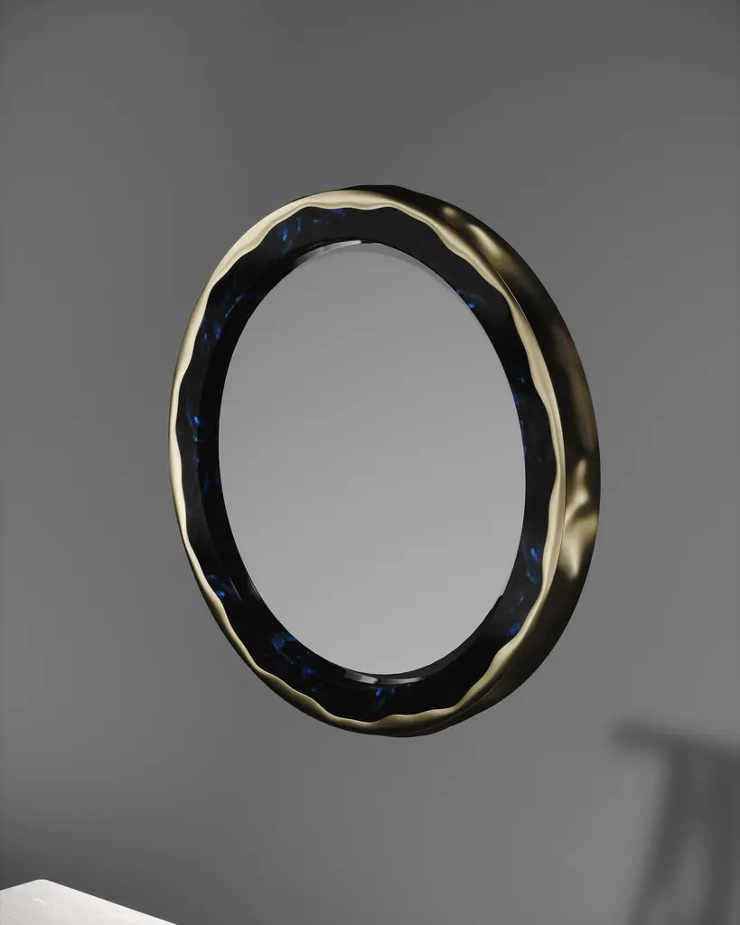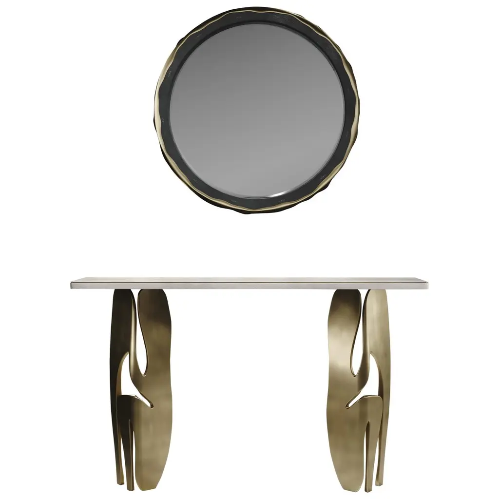 The Paris based label has distinguished themselves since their launch, with their iconic use of shagreen mixed with brass and other exotic materials. All furniture is handcrafted by skilled artisans, ultimately making each piece unique, designed in Paris and produced in the Philippines.The melting mirror by R&Y Augousti in coal black shagreen and bronze-patina brass, is an iconic piece of theirs with their signature "melting" metal detail. Available in other finishes and a large size, as well as a "cut out" version, see images at end of slide. Custom color and sizing available on request. All shagreen is hand-dyed by our artisans. This finish is called "coal black" shagreenThe dimensions of this piece are 70 diameter cm x 4 cmAll R&Y Augousti pieces are handmade by artisans, ultimately making each piece unique. Wipe clean with soft dry cloth.Acclaimed design duo Ria & Yiouri Augousti have established themselves since the 1990s as pioneers of modern-vintage style through their luxurious Art Deco inspired collections.The Paris based label has distinguished themselves since their launch, with their iconic use of shagreen mixed with brass and other exotic materials. All furniture is handcrafted by skilled artisans, ultimately making each piece unique.All shagreen-covered items should be kept out of direct sunlight, color variants may occur on the stingray and other exotic finishes, but this showcases the Parisian label's commitment to creating authentic luxurious products using natural components.