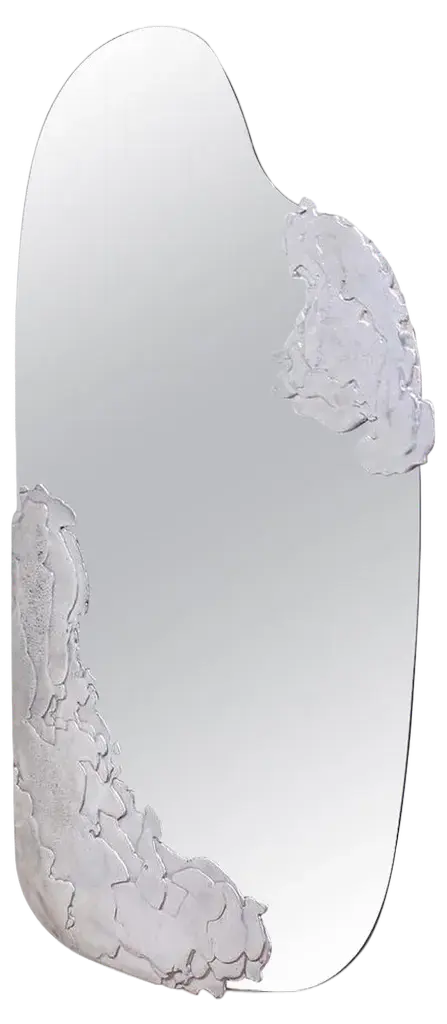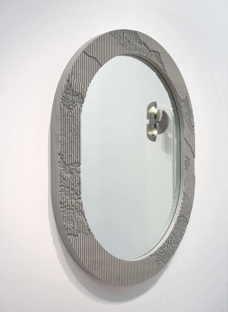 Bringing the serenity of the outdoors into the home, the Shale mirror has a distinct texture carved across the frames surface that seems to reach beyond it's limits. The solid ash surface is scored vertically across the grain, and the drawing of Simon Johns’ textures of a crumbling cliff's facade is delicately carved into it. Patterns within the carving and the wood's grain create optical illusions depending on the lights orientation, making it as striking from afar as from up close. Due to the hand-carved facade, no two pieces are quite the same.Available in Blackened or in Natural Ash. Also available in other sizes: - Small Shale Mirror // 40" x 28" x 2"- Giant Shale Mirror // 72" x 48" x 2"The Shale Collection's name was inspired by the cliffs outside Simon Johns' studio, in the Missisquoi Valley in Quebec. Shale is a type of rock formation that tends to split and erode in layers, leaving behind a layered and random composition of textures. The mapping of the composition of this cliff was sketched on to the pieces of the collection, and carved out in layers, with a router and a chisel.