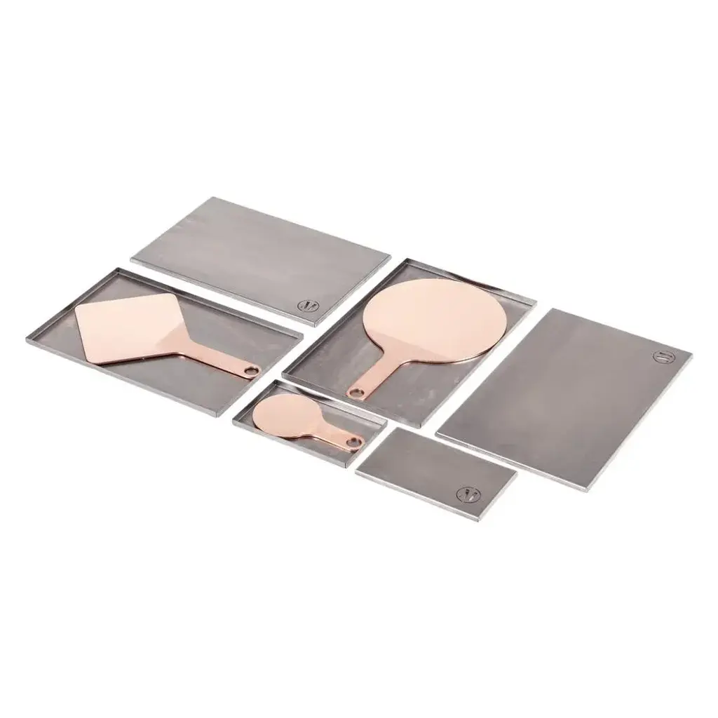 Set of 3 shapes mirrors by mingardo dimensions: d19 x h30 cm // d20 x h32 cm // d9 x h16 cm materials: polished natural copper with handle in satin natural copper. Box in satin natural iron. Weight: 1-3 kg also available in different finishes. The study of the ancient mirrors and their methods of use creates the concept of shapes mirrors. Built on traditional gestures but with an outline completely new and contemporary: the division mirror-handle is minimized without variations in the surface but with a polished-brushed finish that highlights the craftsmanship. Shapes mirrors are meant to be used within the domestic environment due to the natural weight of the metal, as a decorative object. Smaller sized pieces can fit and be carried inside a purse, handbag or pocket, and become a portable everyday luxury feature. Mingardo ilario founded mingardo blacksmith workshop in 1970, after over twenty years’ experience in the metal processing field. The production was initially focused on simple blacksmith works for the construction industry. Over the time, it has become more refined, enabling the company to collaborate with internationally renowned companies and architects: from the first collaborations with architect carlo scarpa to the more recent commissions for museo del novecento in milan, parco della musica in florence, and teatro petruzzelli in bari. Over the years, the workshop has achieved great results, with the production of unique metal products, all hand-wrought by a highly skilled team of specialized artisans. Nowadays, it is highly regarded in the local artisan field for its high-end refined finishing touches and details, and for its know-how.