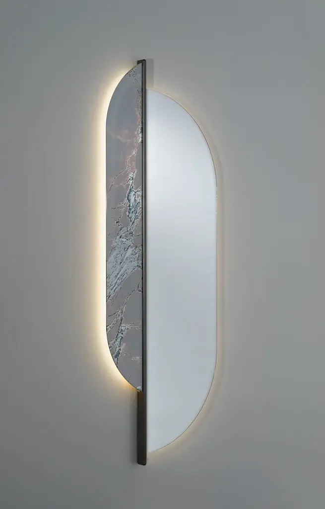 Shared is a mirror with solid wood structure, coated lacquer finish. Decorative strip in foam glass and extra-clear mirror. LED backlight. Divided at the centre into two unequal halves: one in Vetrite glass and the other in glass. Just like two heterogeneous elements that blend in a unique, charming object.