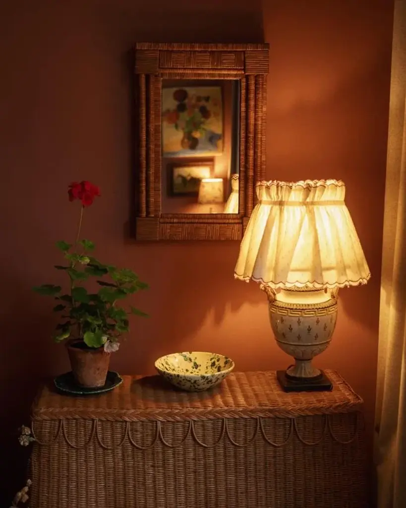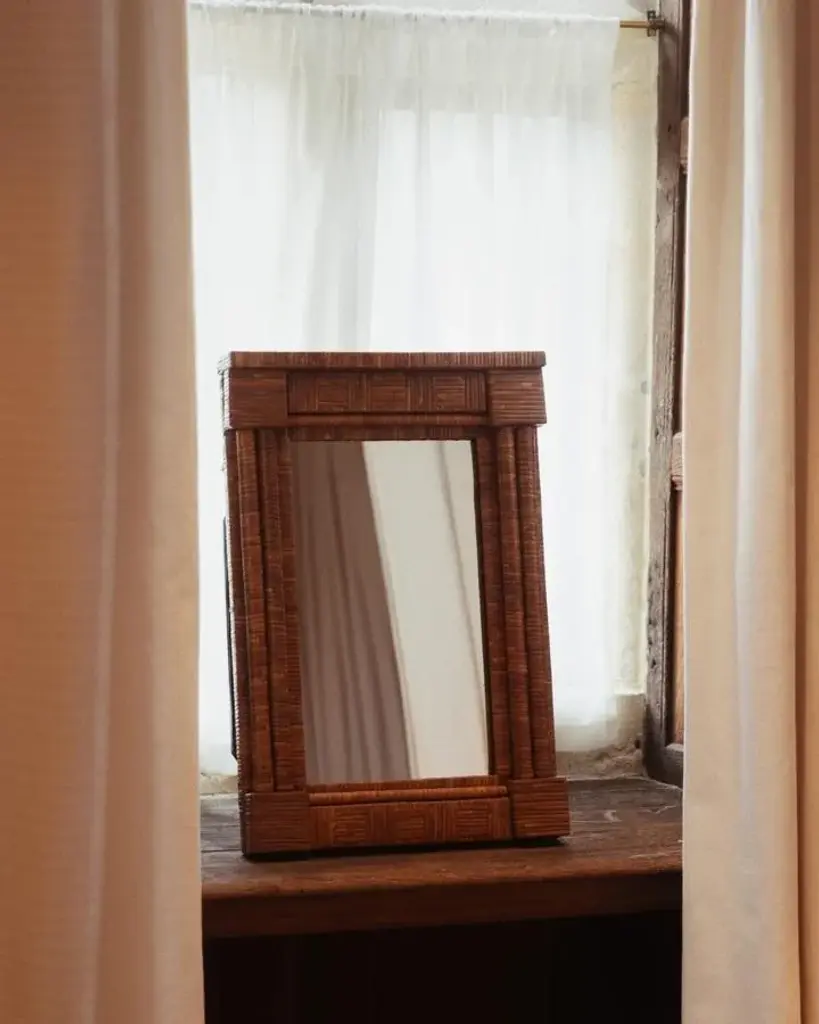 An elegant handmade mirror featuring rattan columns, this piece would look beautiful in the every room at home, from the entryway to the bedroom, bathroom or dressing room. Installation: Metal loop attachments on the rear. Care Instructions: