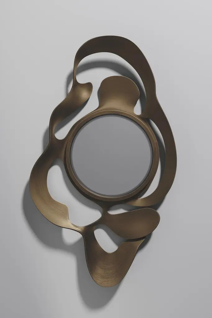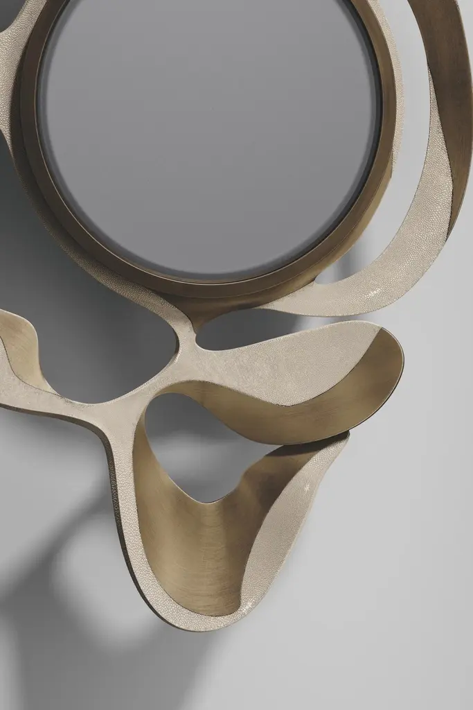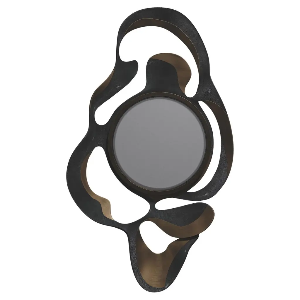 The Paris based label has distinguished themselves since their launch, with their iconic use of shagreen mixed with brass and other exotic materials. All furniture is handcrafted by skilled artisans, ultimately making each piece unique, designed in Paris and produced in the Philippines.The Leaf Mirror by Kifu Paris is a dramatic and organic piece. The black pen shell and bronze-patina bass inlay mixture creates a striking appearance as it emulates a whimsical interpretation of intertwining branches. This piece is designed by Kifu Augousti the daughter of Ria and Yiouri Augousti. Available in other finishes The finish of the shagreen is authentic as it is hand-dyed The dimensions of this piece are 69.0 x 115.0 x 8.2 cmAll Kifu Paris pieces are handmade by artisans, ultimately making each piece unique.Custom color/sizing available on request.Wipe clean with soft dry cloth.Although inspired by her parents, her collection of Home Accessories and Furniture is a distinct identity of its own. Kifu uses handmade techniques of elaborate inlay patterns of shagreen, shells, semi-precious stones, materials she experienced as a child growing up in her parent’s studio, but interpreted in a younger quirkier way reflecting her youth. From her "jewelry inspired knobs" on decorative boxes, gold bar boxes and an extravagant inlay pattern mix of shagreen and shell inspired by galactic constellations, as seen on her enormous round mirror, is refreshing to see. Kifu embodies whimsical elements throughout her collection and is not afraid to be daring and unexpected in her approach to design.All shagreen-covered items should be kept out of direct sunlight, color variants may occur on the stingray and other exotic finishes, but this showcases the Parisian label's commitment to creating authentic luxurious products using natural components.