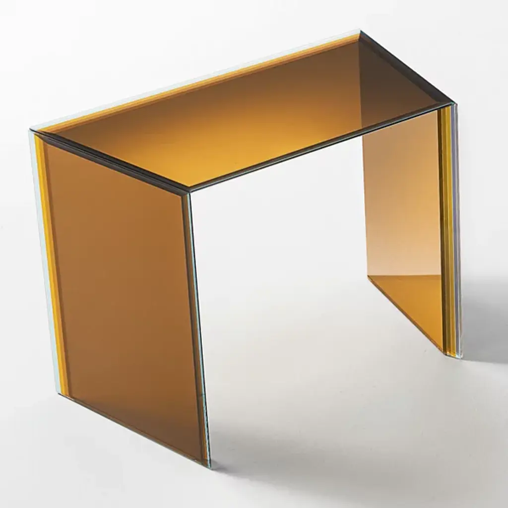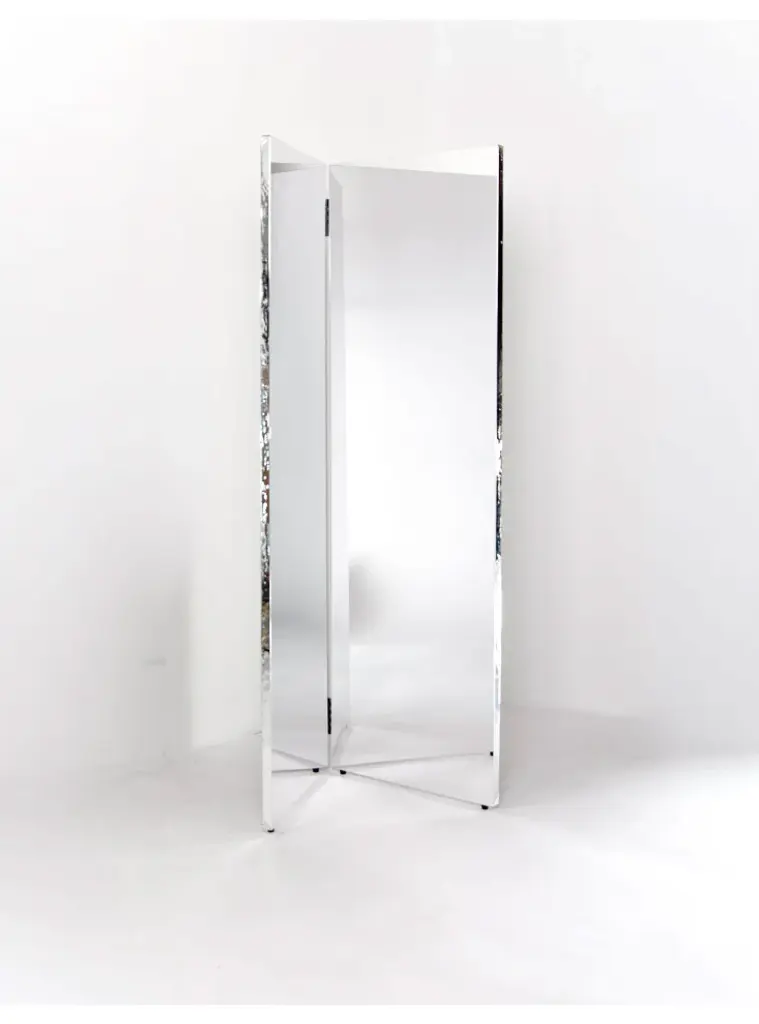 Shibam is a totem mirror with red and white bulbs or with object holder shelf. The lateral and frontal sides are in mirror partially decorated with thin white engravings going around the whole perimeter. The base is in matt polished absolute black granite.Attention, to avoid that the cleaning detergent seeps between the mirror slabs causing the oxidation of this one, it is recommended not to spray it directly on the mirror but to dampen the cloth used.
