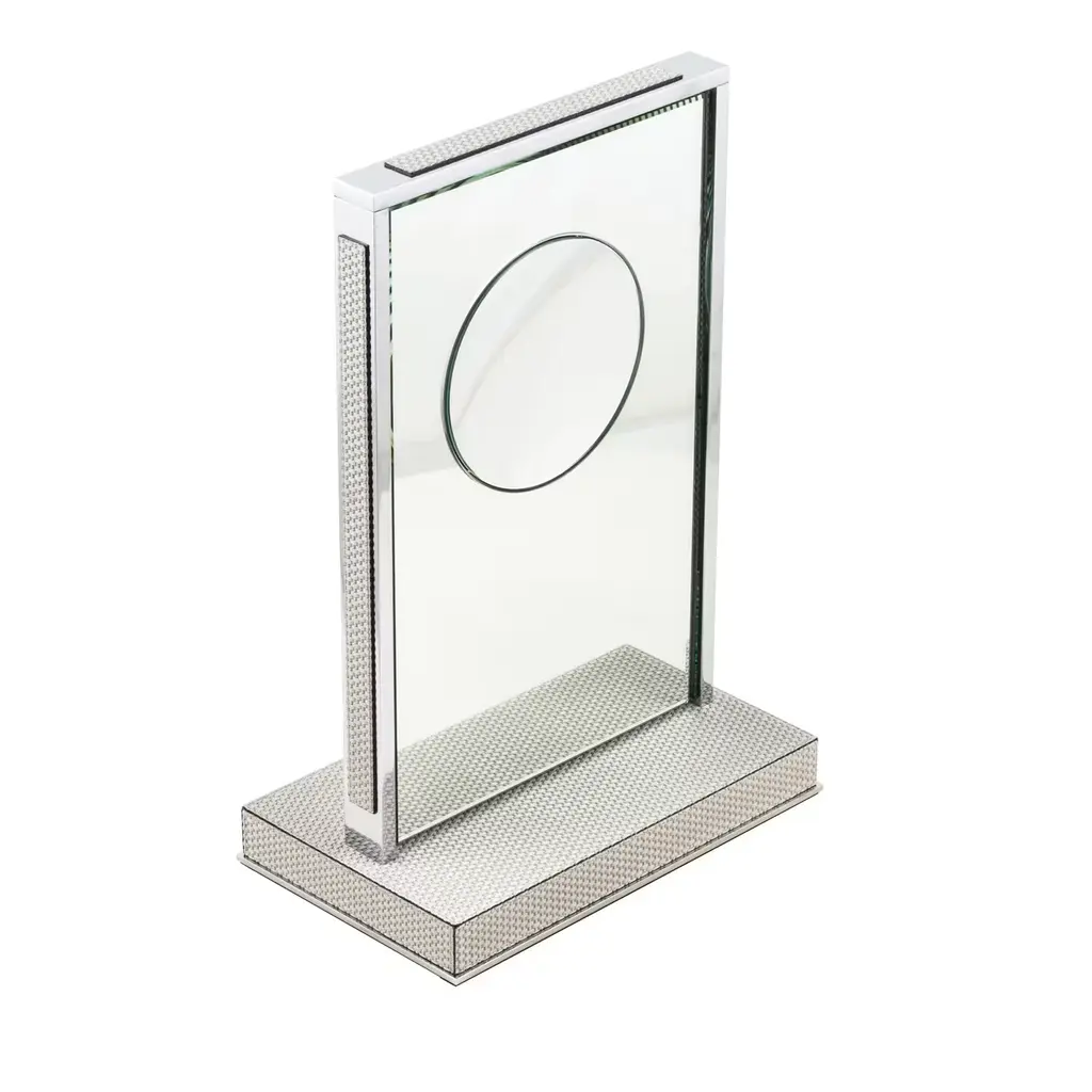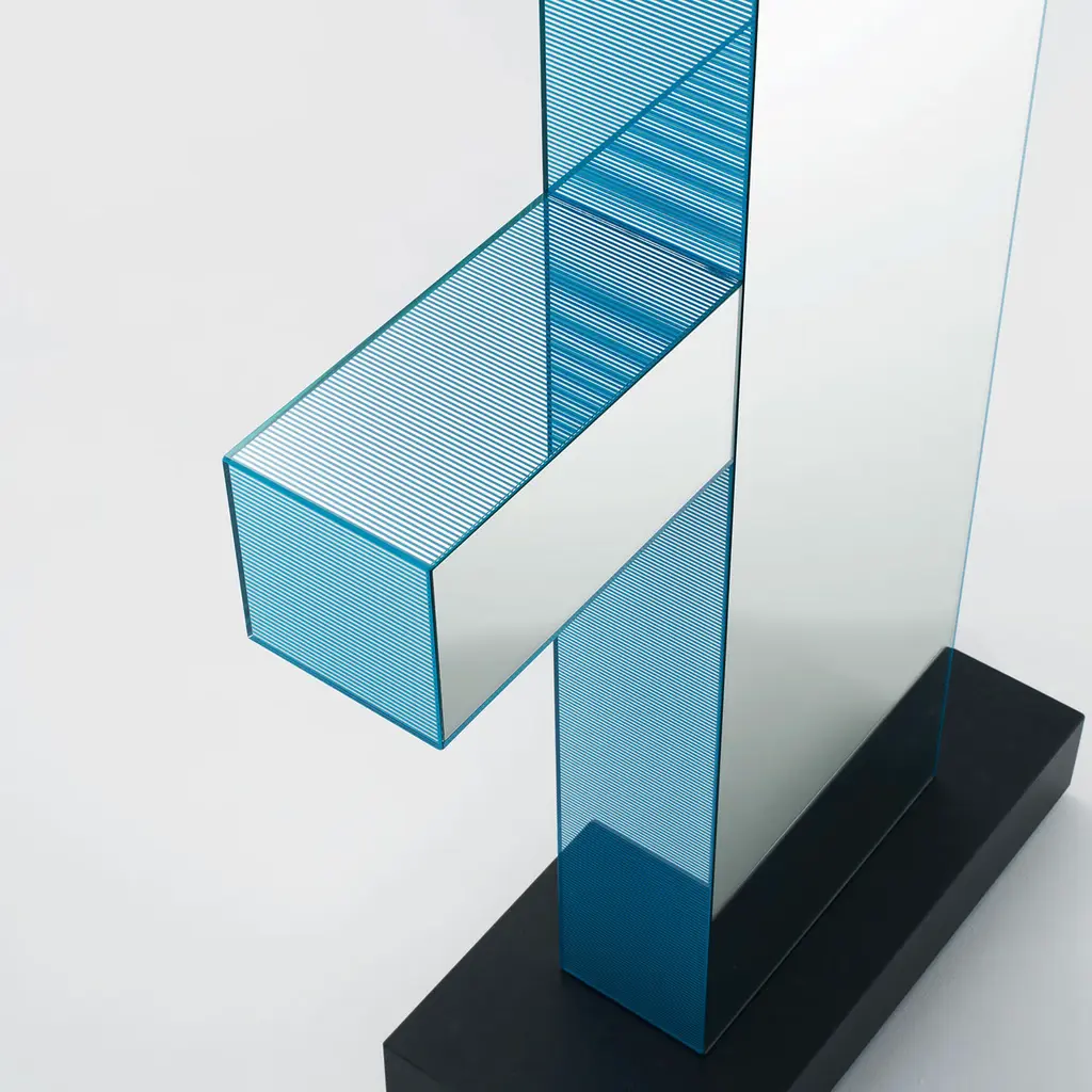This ethereal and otherworldly totem mirror from Ettore Sottsass features an object holder shelf and a matte polished absolute black granite base. The two frontal sides are in white mirror and the lateral ones feature a decorated mirror with thin, colored engravings (available in the colors pink and light blue).