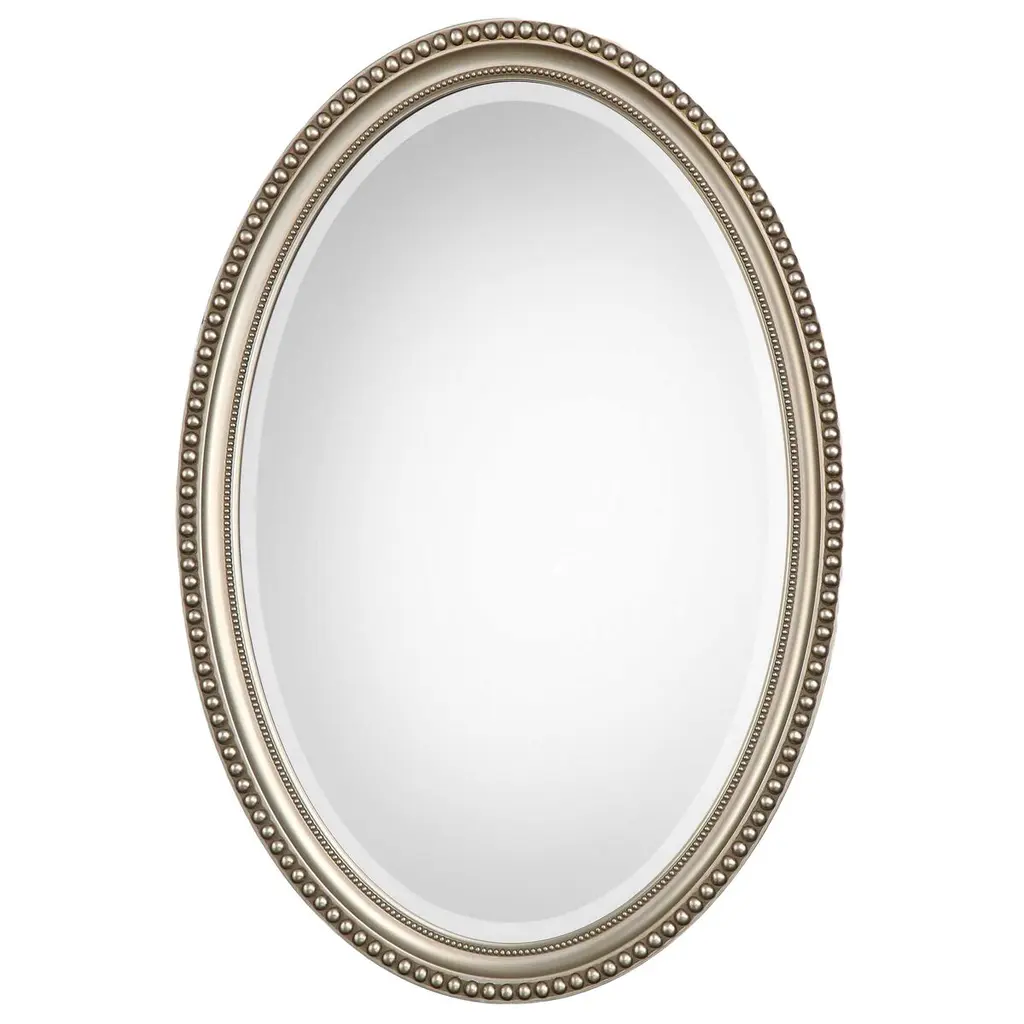 The Shielded Wall Mirror has a shield like silhouette with repetitive pear-like strands. The mirror frame is finished in an antique silver. Includes two "D" ring attachment points for ease of access for hanging.Features:This wall mirror features glam stylingFeatures a silver frame constructed of polyurethaneEquipped with D ring hangers for easy wall mountingFor over a century, Bassett Mirror has been synonymous with style and quality, transforming homes with its sophisticated and timeless designs. With a wide-ranging collection of furniture, lighting, mirrors, and art, Bassett Mirror seamlessly blends modern style with classic appeal. From rustic modern to luxe glam, each piece is thoughtfully crafted to inspire and elevate any space. Committed to exceptional value and customer care, Bassett Mirror makes it easy for homeowners to create beautiful, personalized interiors with confidence.