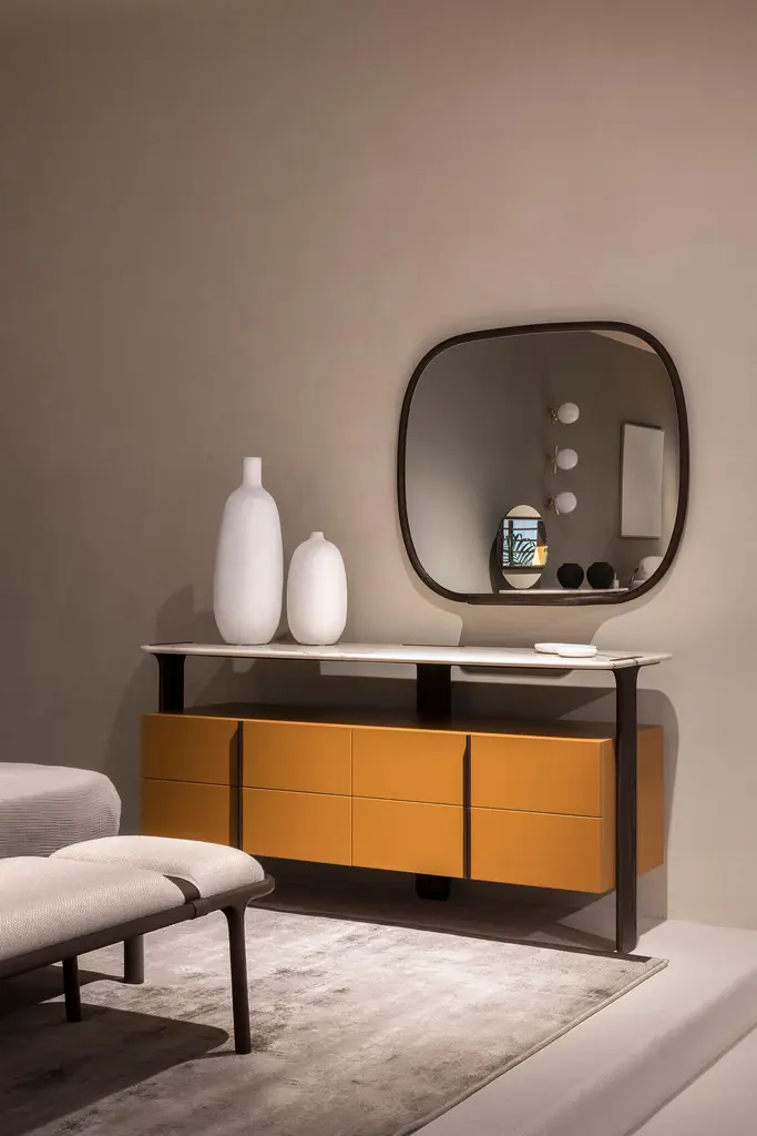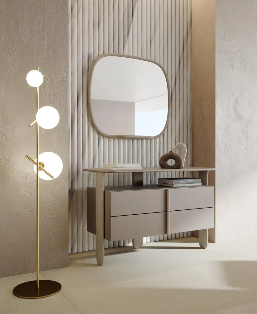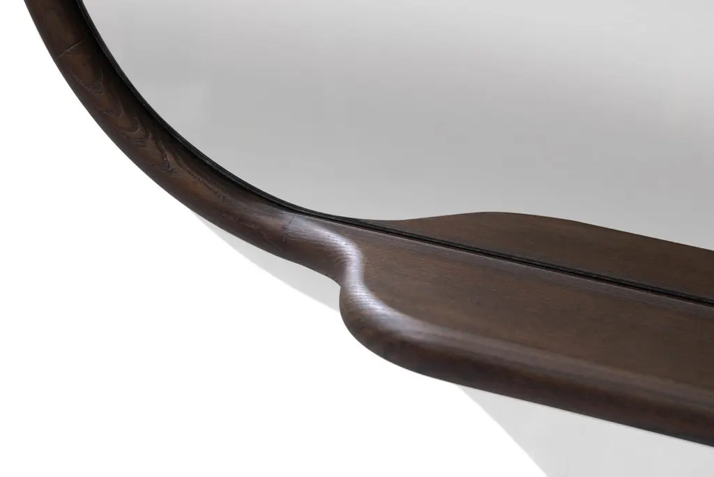 With its sinuous design, this mirror highlights the beautiful ash woodwork that surrounds it. This awesome mirror also has a small shelf on which you can lay your belongings.Finishing cod. 32 Moka (5 gloss)Other finishings are available.The item can be customized.