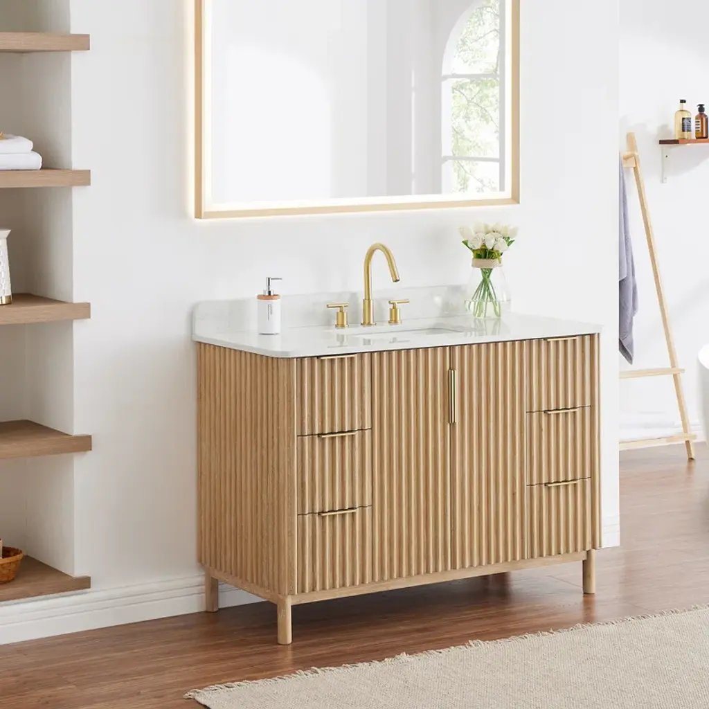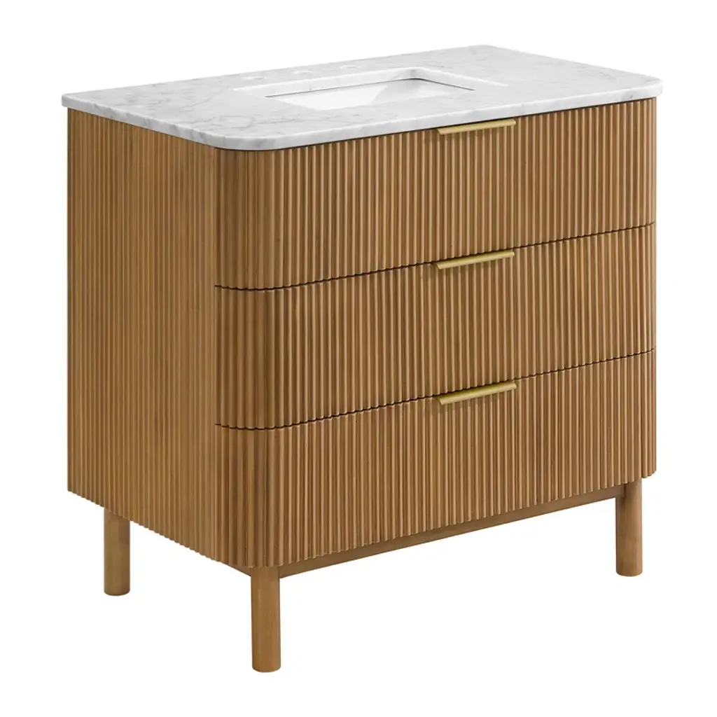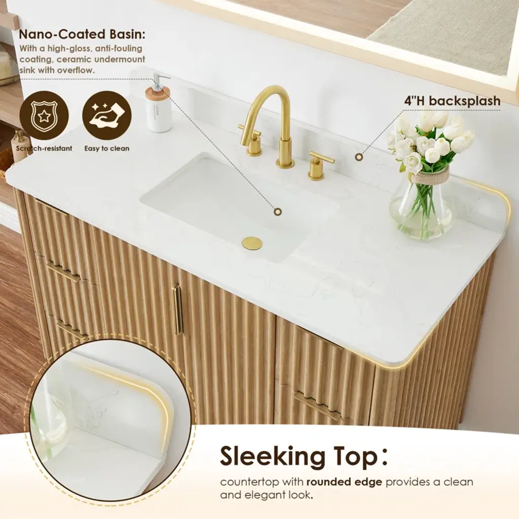 Balancing sophisticated accents with natural tones and textures, our elegant Sierra Series Bathroom Vanity is a striking style upgrade for your bathroom space. The captivating reeded design of the cabinet and door panels lends a unique, artisanal aesthetic that catches the eye. Rounded corners on the composite stone top provide a fluid, uninterrupted silhouette, while gold ergonomic door handles and drawer pulls lend sleek contrast to the finished wood grain. The cabinet includes built-in UL-Listed power and USB outlets as well as a convenient hair dryer organizer. Supported by thick, sturdy legs crafted from premium hardwood, the durable Sierra promises years of enduring beauty and functionality.