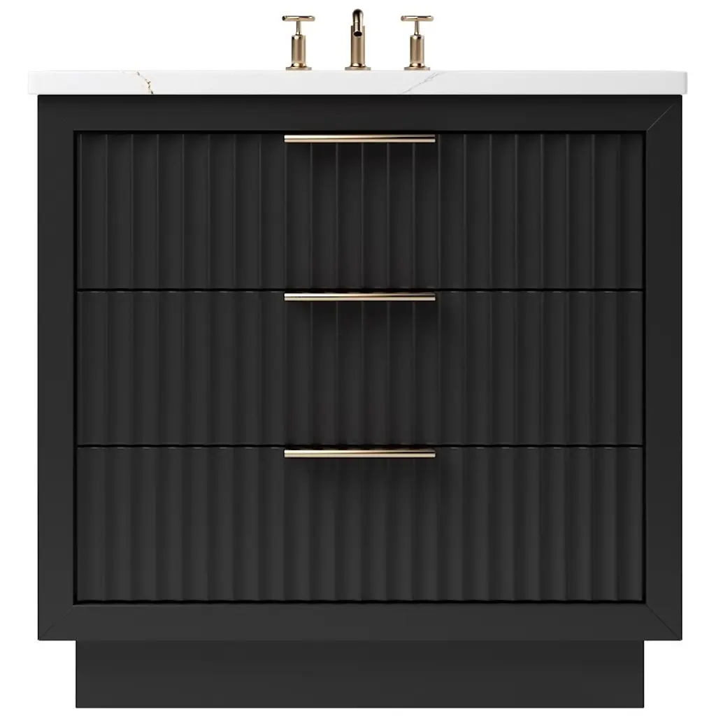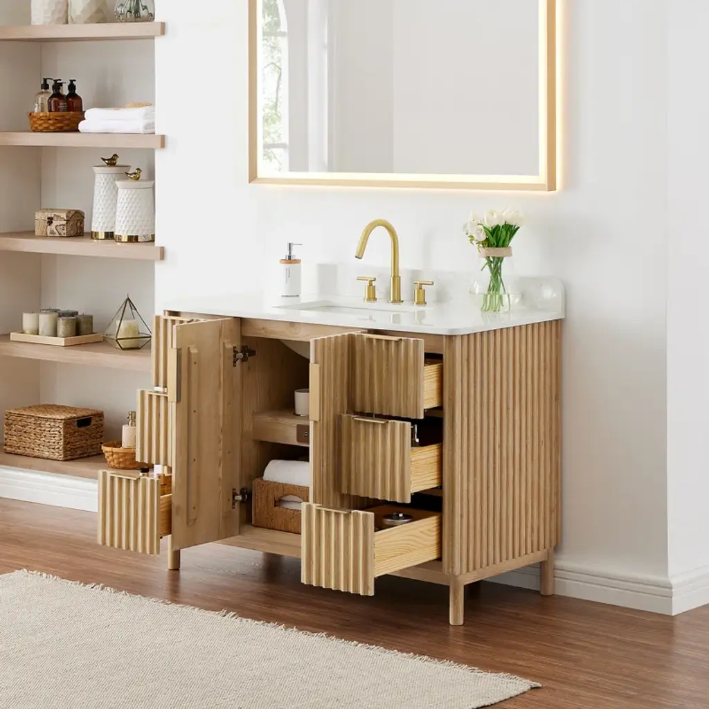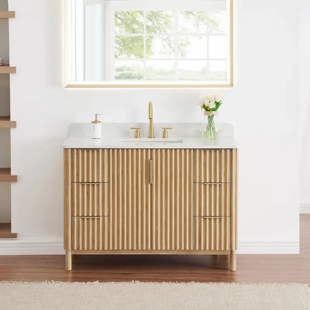 Balancing sophisticated accents with natural tones and textures, our elegant Sierra Series Bathroom Vanity is a striking style upgrade for your bathroom space. The captivating reeded design of the cabinet and door panels lends a unique, artisanal aesthetic that catches the eye. Rounded corners on the composite stone top provide a fluid, uninterrupted silhouette, while gold ergonomic door handles and drawer pulls lend sleek contrast to the finished wood grain. The cabinet includes built-in UL-Listed power and USB outlets as well as a convenient hair dryer organizer. Supported by thick, sturdy legs crafted from premium hardwood, the durable Sierra promises years of enduring beauty and functionality.