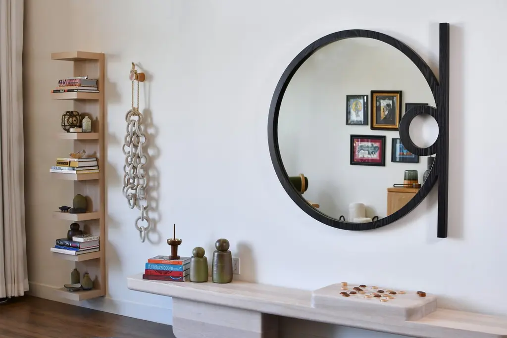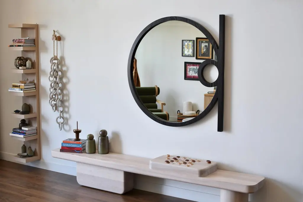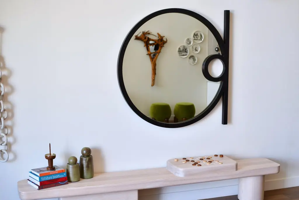 The Silas Wall Mirror is an elegant, minimalist form, inspired by the playful use of shape and geometry throughout the Mid-Century Modern Movement. The handcrafted warmth of the solid wood frame along with creative use of negative space and linear elements within the circular form conveys a uniquely artistic contemporary design. All these subtly blended details will provide a strong visual statement in any classic or modern home design style. Standard sizes available in 36", 42" and 48" Diameter.FSC certified solid wood construction. Made to Order. Available in three wood types and seven standard finishes. Customization available per approval.Handcrafted in Los Angeles