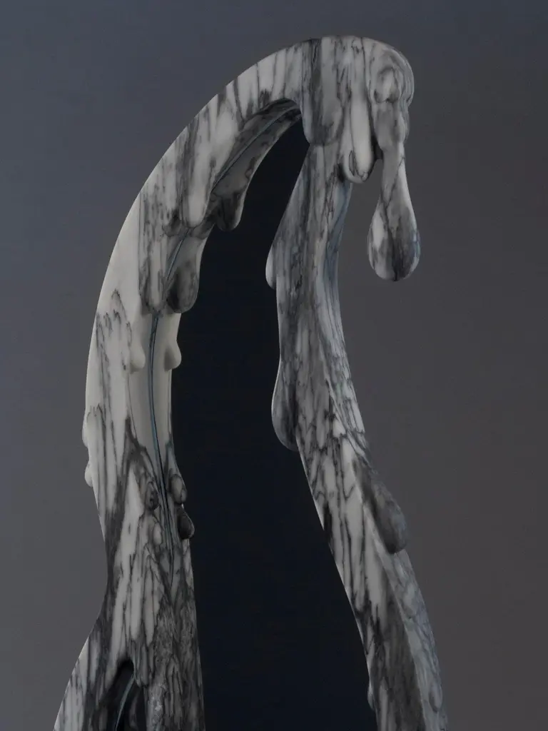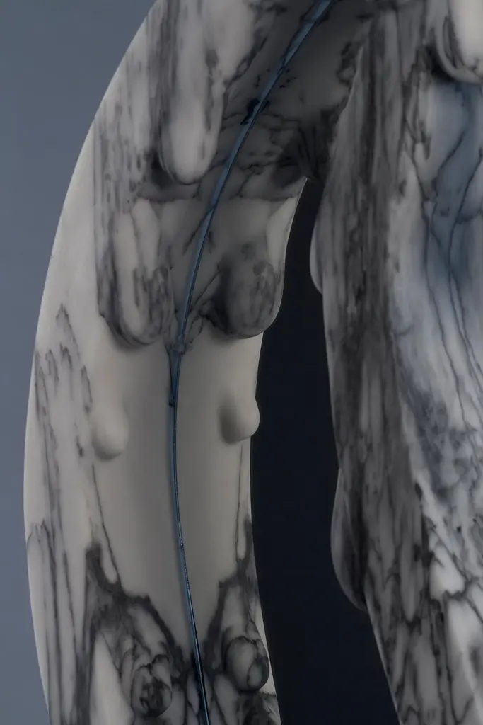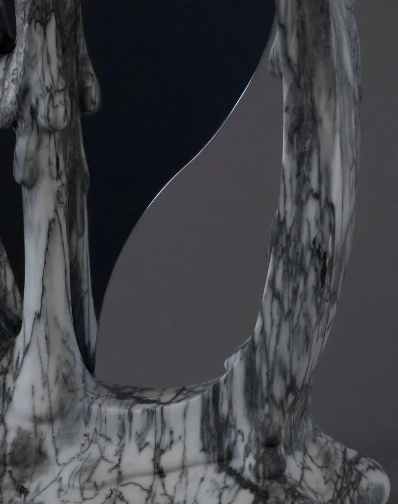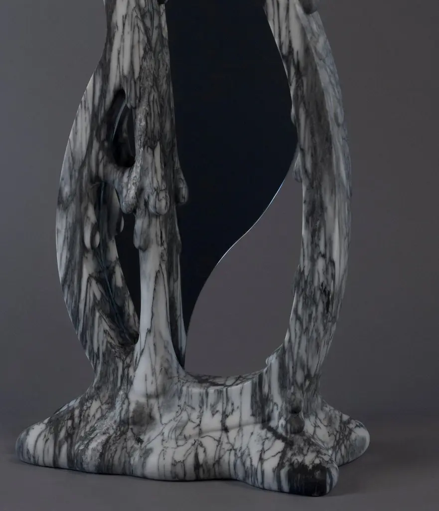 Silhouette Mirror in Pele de Tigre Marble by MANTA Handmade Stone DesignLimited Edition of 5 Pieces.Dimensions: D 70 x W 50 x H 185 cm. Materials: Pele de Tigre marble and mirror.MANTA is the design brand of Gargula Gótica, based in Portugal.Anchored in over 25 years of masterful craftsmanship, it combines the expertise of international stonemasons and sculptors with the vision of renowned designers and architects, which results in extraordinary art objects and distinctive pieces of furniture that transcend function.MANTA follows a consistently curated design philosophy - sensual, timeless, and deeply connected to the power of nature.Organic forms, curved lines, and an exceptional material aesthetic mergeinto sculptural, unique compositions that not only furnish a space but transform it, lending every room a subtle tension between refined sensuality and playful lightness.MANTA understands furniture as poetry made of stone, as silent protagonists in the interplay of light, structure, and emotion.Between sculpture and function, an aesthetic emerges that touches - subtle, elegant, and full of meaning.The collections have been presented at international exhibitions, design fairs, and galleries, and have received numerous awards for their sustainable choice of materials, precise craftsmanship, and the harmonious interplay of lightness, depth, and texture.MANTA - the power of natural processes, transformed into sculptural design.