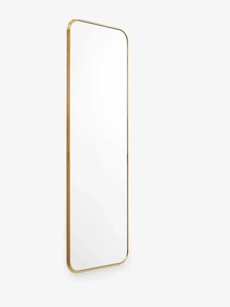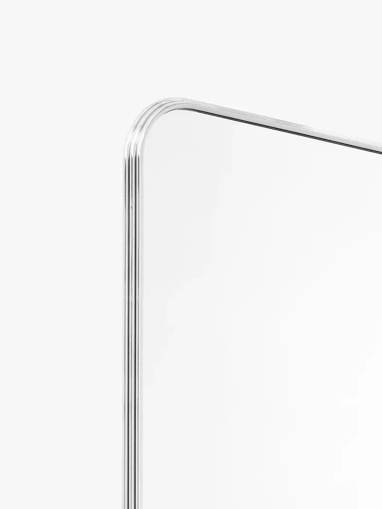 The Sillon series of mirrors, designed by Sebastian Herkner for &Tradition, takes its cue from the French Art Deco movement. Named after the French word for ‘groove,’ the Sillon series of mirrors is punctuated with a corrugated frame that contrasts beautifully with the smooth, reflective glass. Hang at different heights, alone or in decorative configurations in a hallway, bathroom or bedroom.Production processThe frame is made of Ø10mm solid steel rods that are welded together, polished and then electroplated. A high-quality silver-coloured mirror is subsequently installed in the frameEnvironmentIndoorMaterialPlated steel and silver coloured mirrorColoursStainless SteelBrass