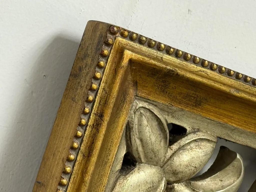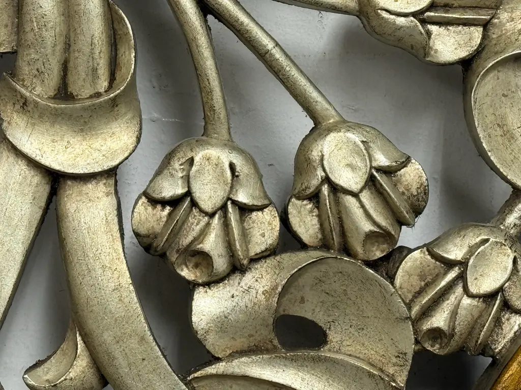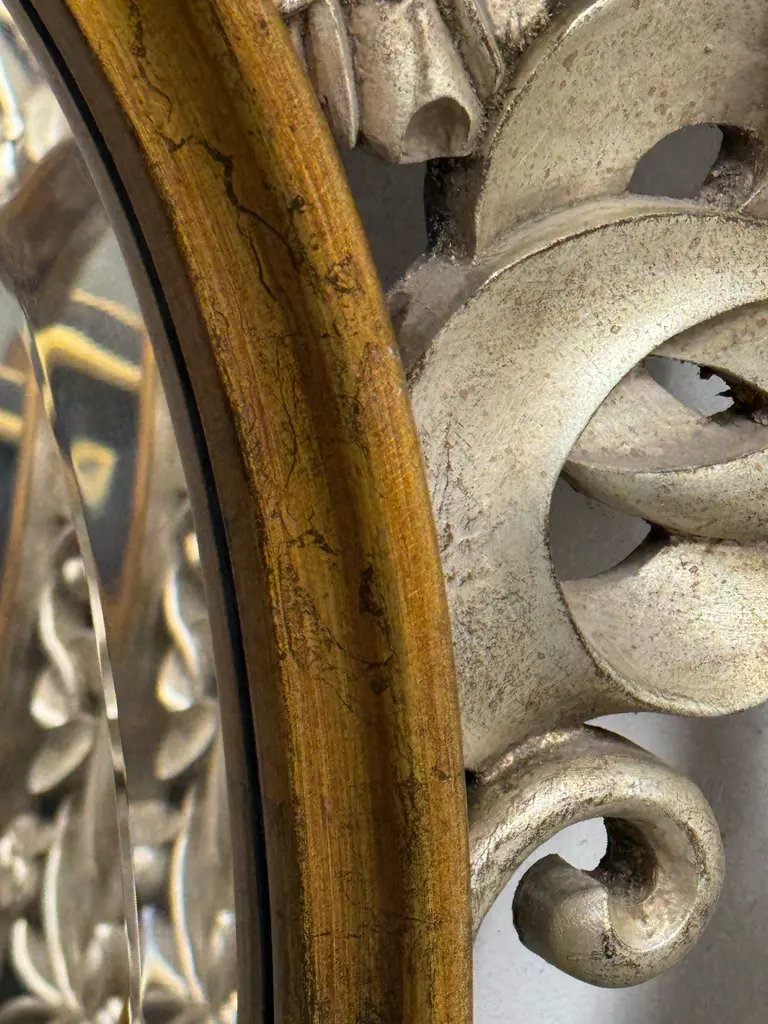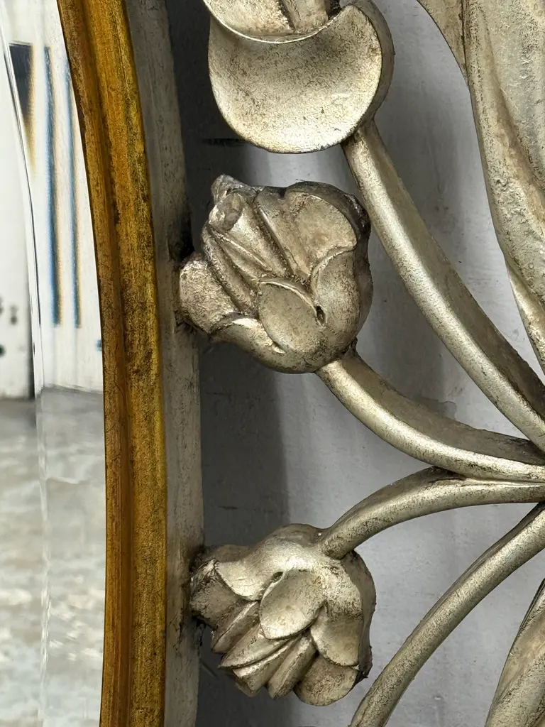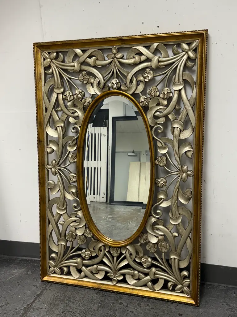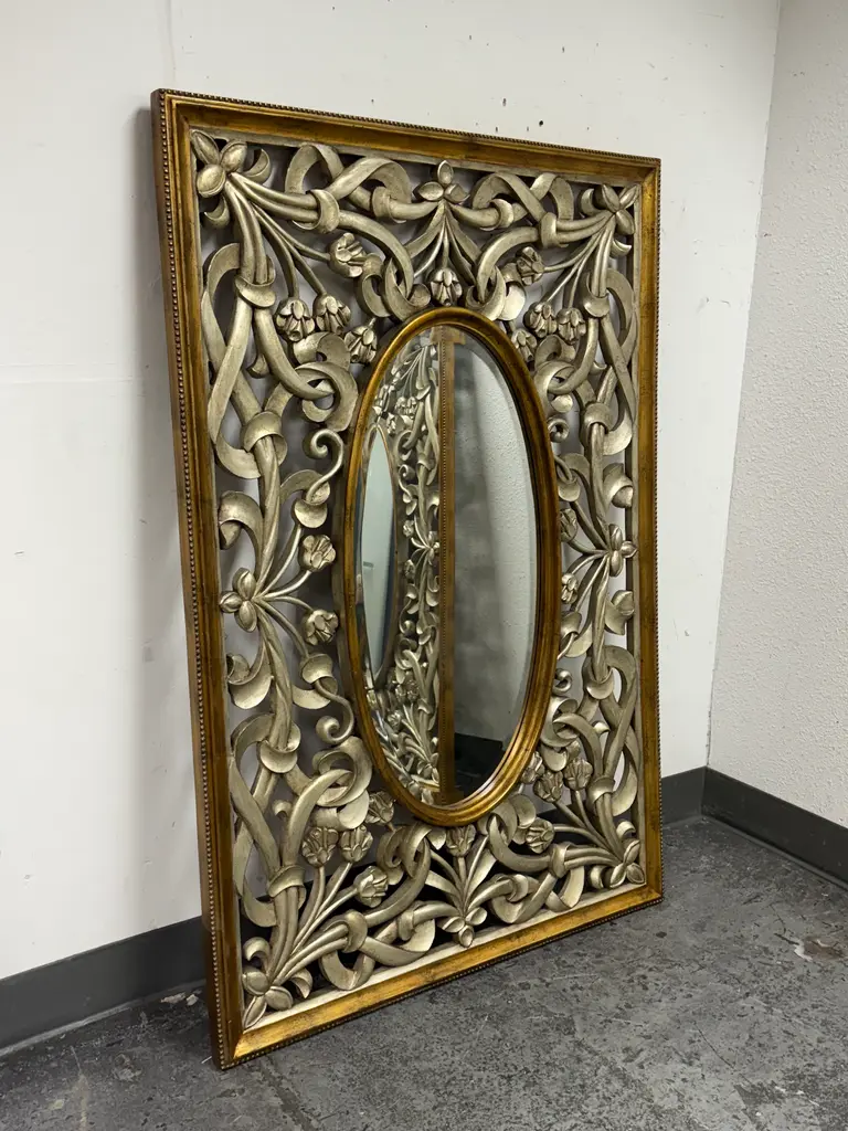 Design Plus Gallery presents the Most Decorative Mirror with a Trellis Like Style + Oval Looking Glass Inset. The unique mirror looks like it was inspired from the garden of your dreams. It has a silver and gold finish of interlocking patterns of flowers + symbols. The outer edge of the frame is golden and also around the centered oval mirror. Is in good condition for its usage, visible and minimal wear. *Note - Identical Mirror May Also Be Available