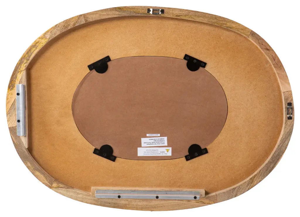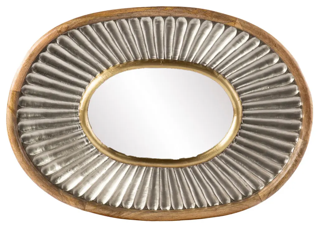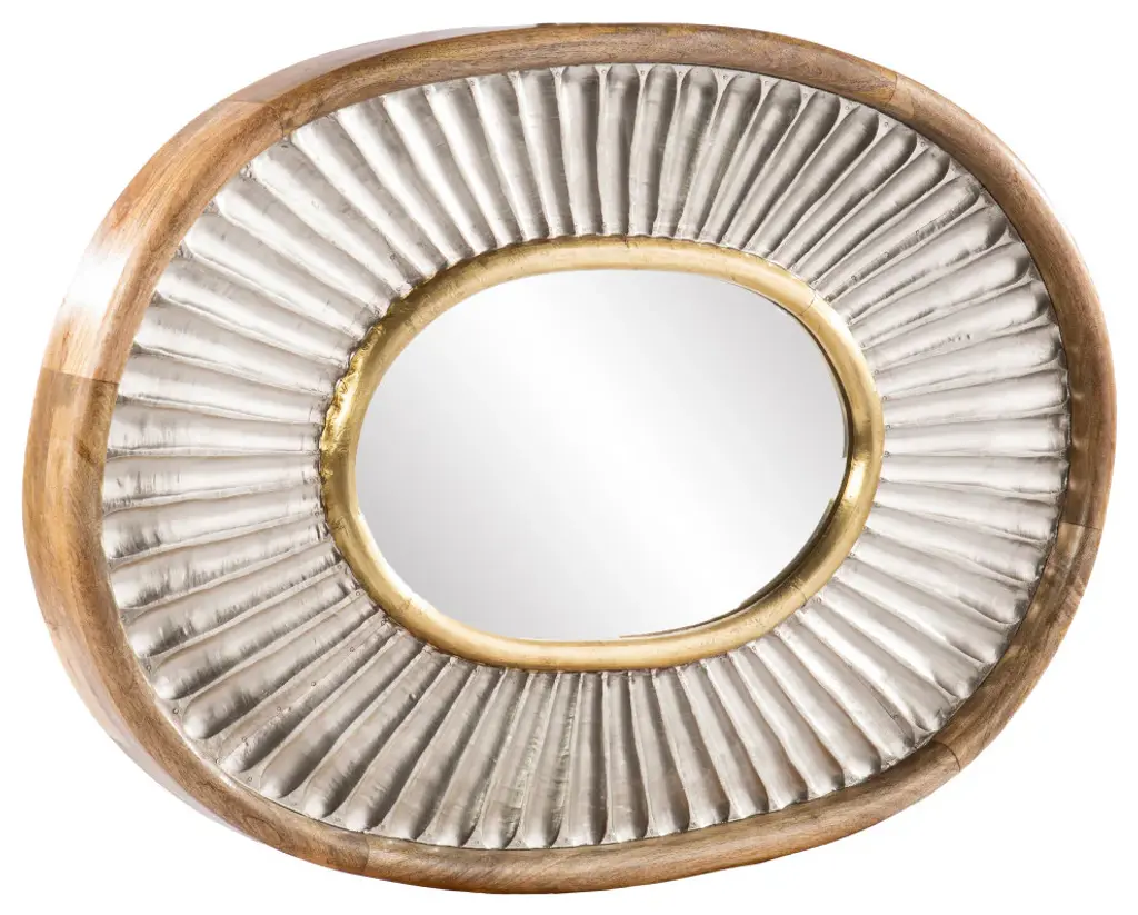 Reflect your distinctive style with this handcrafted wall mirror. Metal ribbing crafts a unique design while the surrounding wood frame adds an organic element. Artisan silver cladding brings depth and texture to your space,creating an eye-catching focal point on your living room or hallway wall. Add modern flair to your home when you hang this decorative wall mirror in your entryway, dining room, or open concept space. Natural and silver finish w/ brass accents. Oval mirror w/ handcrafted frame. Mixed-material construction highlights unique details. Hangs vertically or horizontally. Dust with a soft, dry cloth. Clean mirror with glass cleaner.