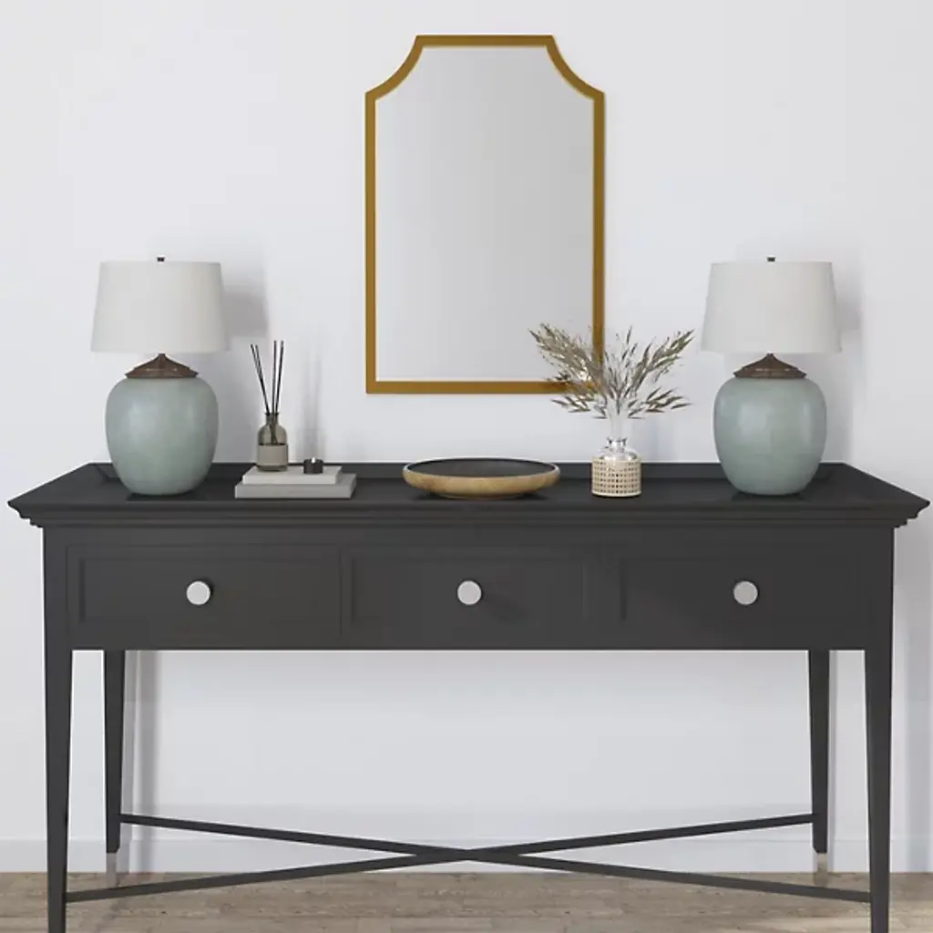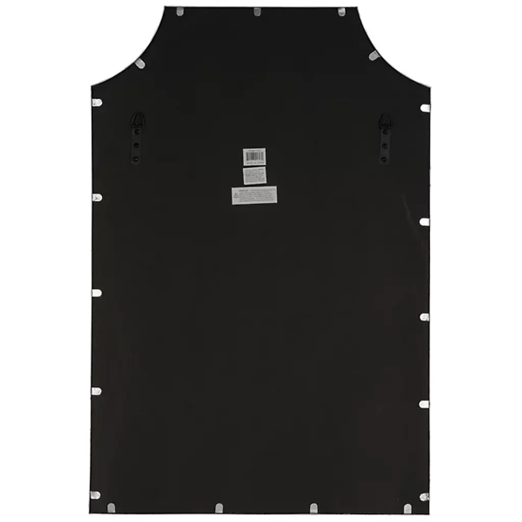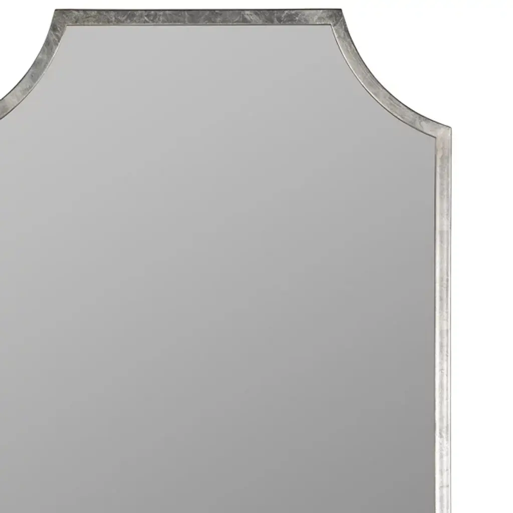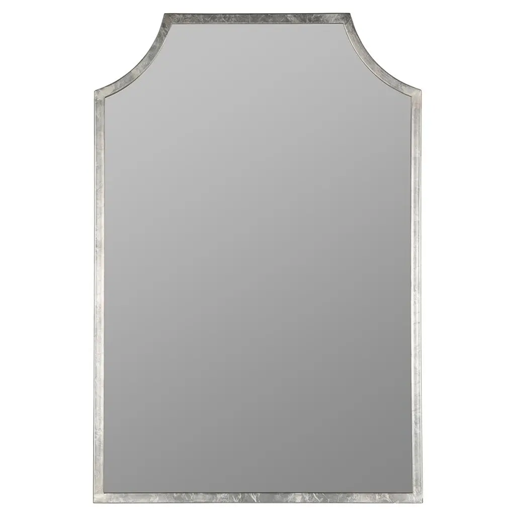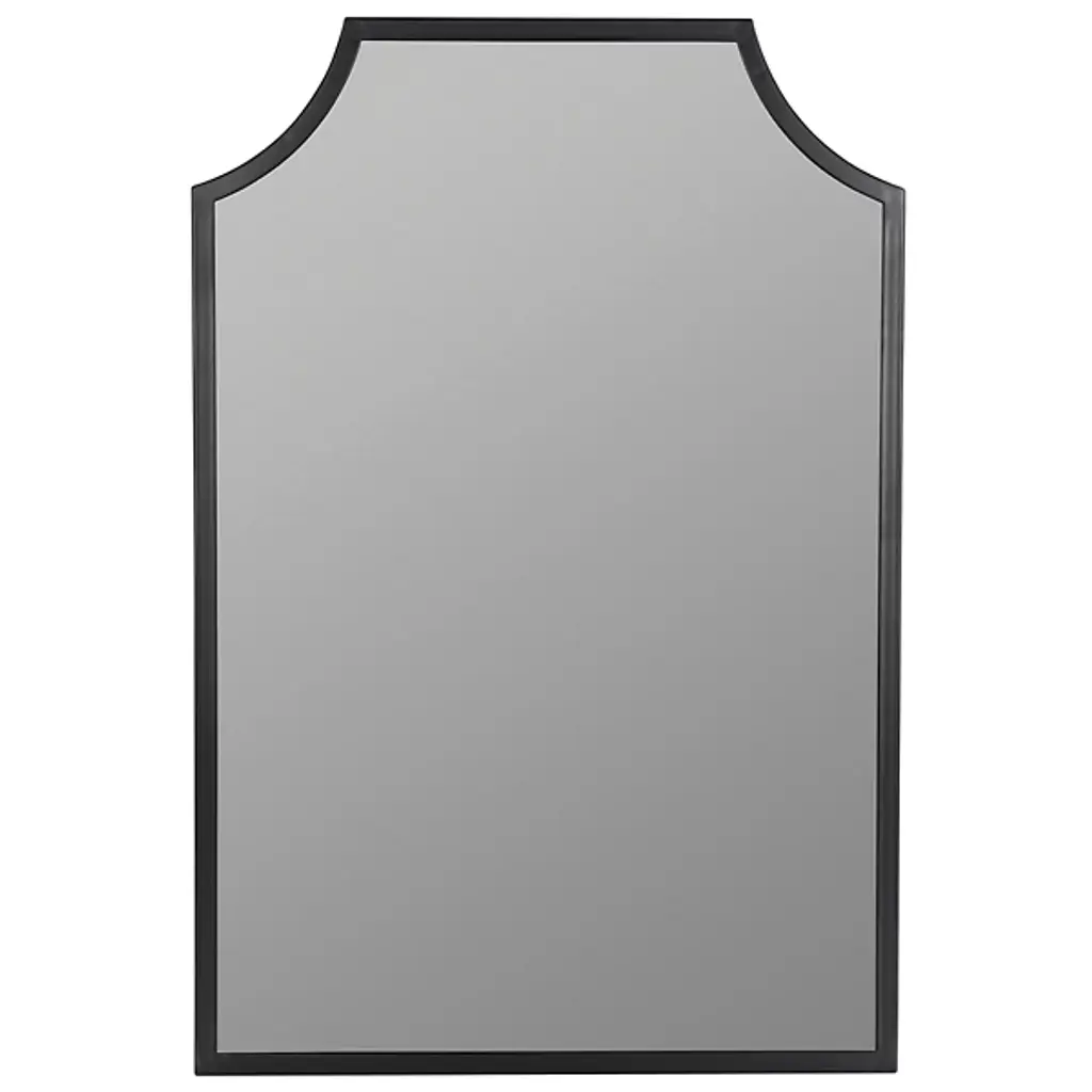 The Simone Wall Mirror from Cooper Classics uses strong lines and precise angles to shape its metal frame. The mirror's top edge curves inward at measured points, creating a distinctive header that sets the tone for the entire piece. Four straight sides provide structure while maintaining proportion with the curved elements. The dark metal outline defines boundaries with understated confidence.