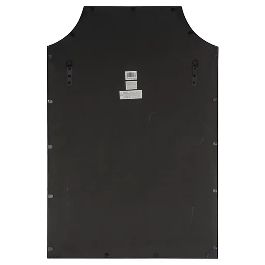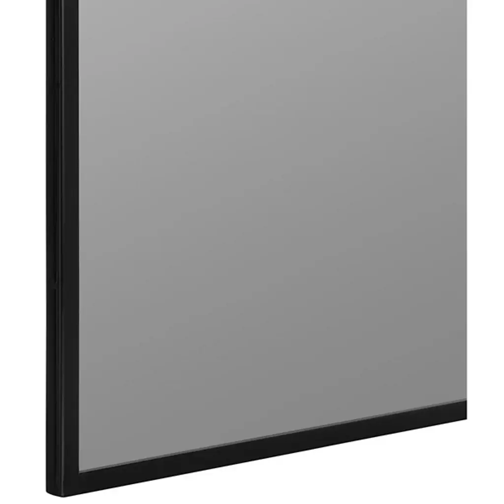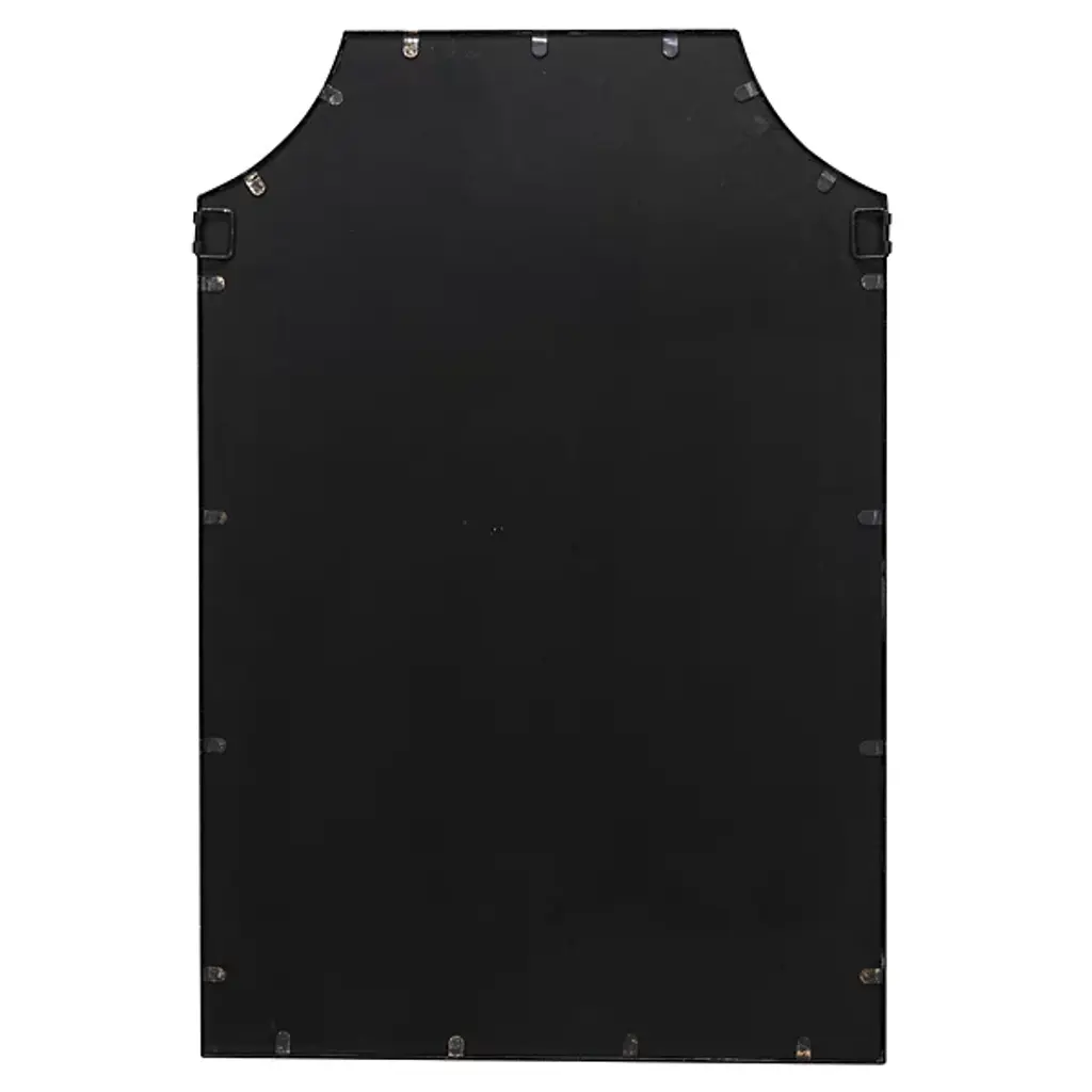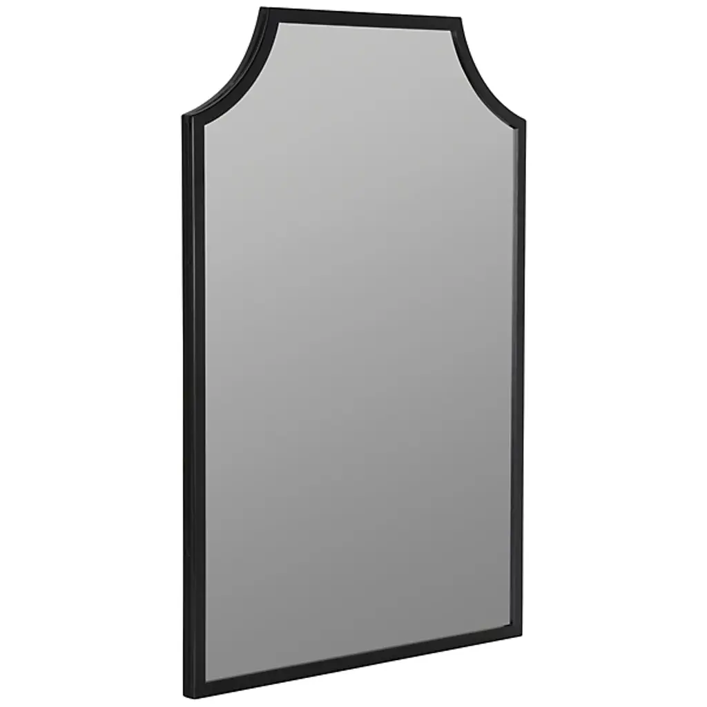 The Simone Wall Mirror from Cooper Classics uses strong lines and precise angles to shape its metal frame. The mirror's top edge curves inward at measured points, creating a distinctive header that sets the tone for the entire piece. Four straight sides provide structure while maintaining proportion with the curved elements. The dark metal outline defines boundaries with understated confidence.