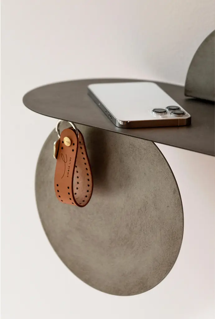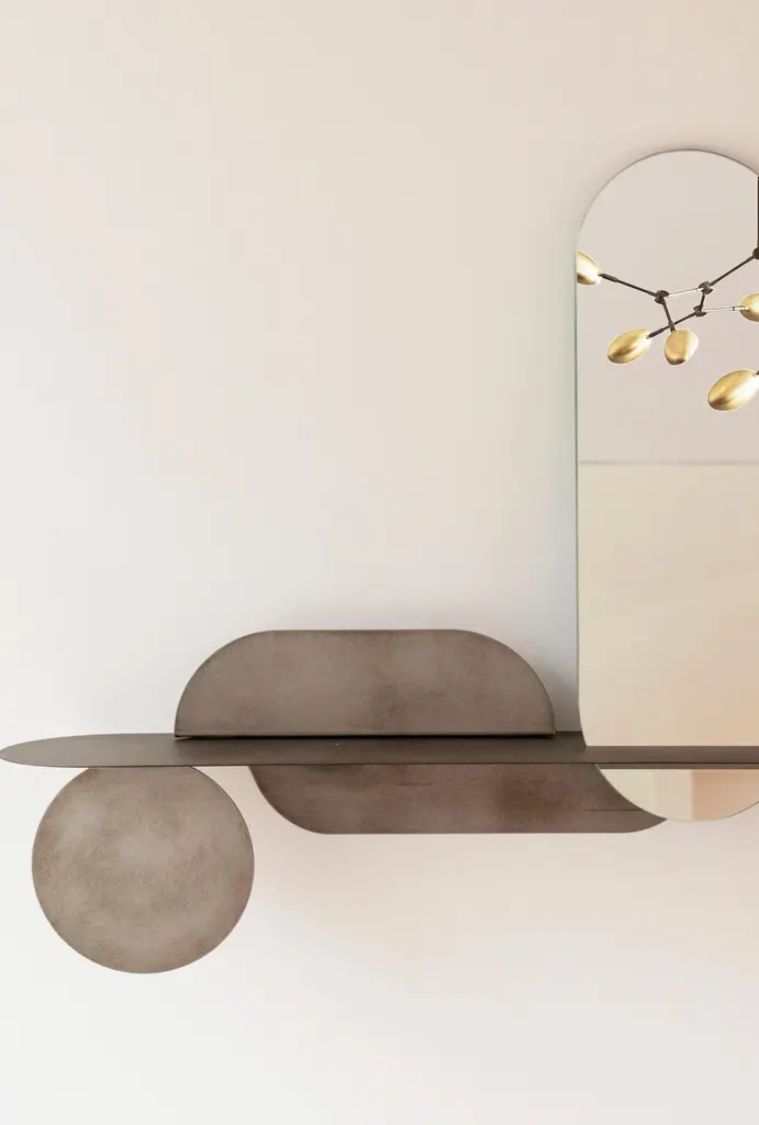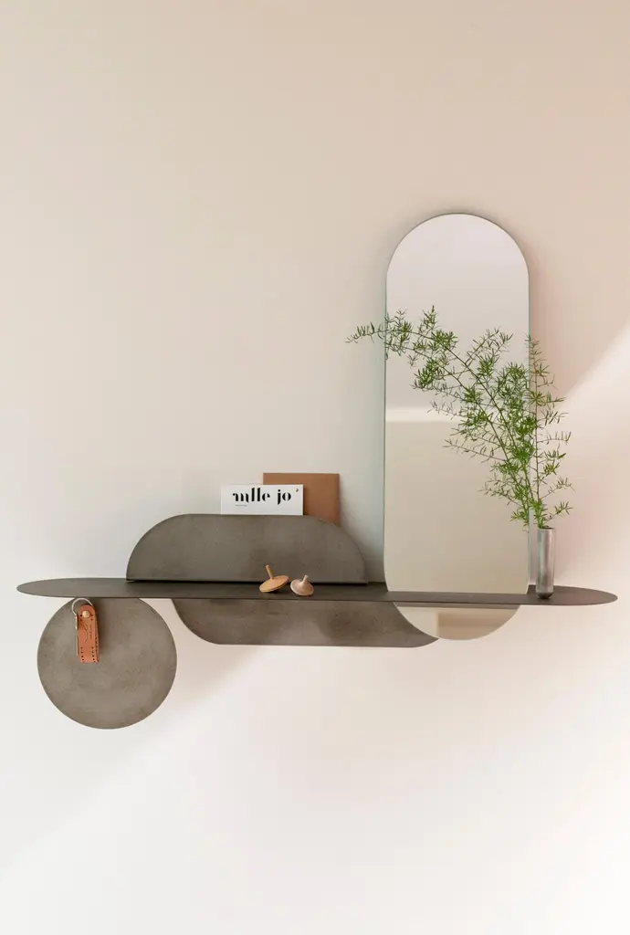 Simply Foggy Shelf With Mirror by Mademoiselle JoDimensions: L 87 x W 20 cm.Materials: Matte foggy steel and mirror.Available in two versions and two colors. Please contact us.Behind SIMPLY is actually a much more sophisticated object than its name suggests.Made of folded metal, SIMPLY is a thin and light shelf that can be easily attached to any type of support. The modularity of the shelf lies in the magnetization of the different elements that make it up and allow all possible variations according to the desires or needs of each person.The shelf can be placed in any room of the house to hold books, mail, make-up products, jewellery, keys, etc.The designer has designed it in two versions: a set of four pieces or a set of three pieces with a mirror; and made it available in two colours: powderedwhite for the SIMPLY White or foggy light steel for the SIMPLY Foggy version.Trained as a stylist at La Cambre, I have worked for 25 years to create trends, colours and fabrics for the world of lingerie. Architecture has always been my passion and as such, object design has become an obvious path for me.My approach is based on intuition, with a fascination for the material and the intention to offer something beautiful and different. My vision delicately intertwines heritage and technology, aiming to offer creations at the right price, designed to last and be transmitted, while trying to produce as local as possible and to highlight our know-how.A responsible commitment for a sustainable product.We offer products produced with great care in Belgium and Europe. Useful creations that make you smile, creations you pass on, objects that will have multiple usages in their different lives following the imagination of their owner.