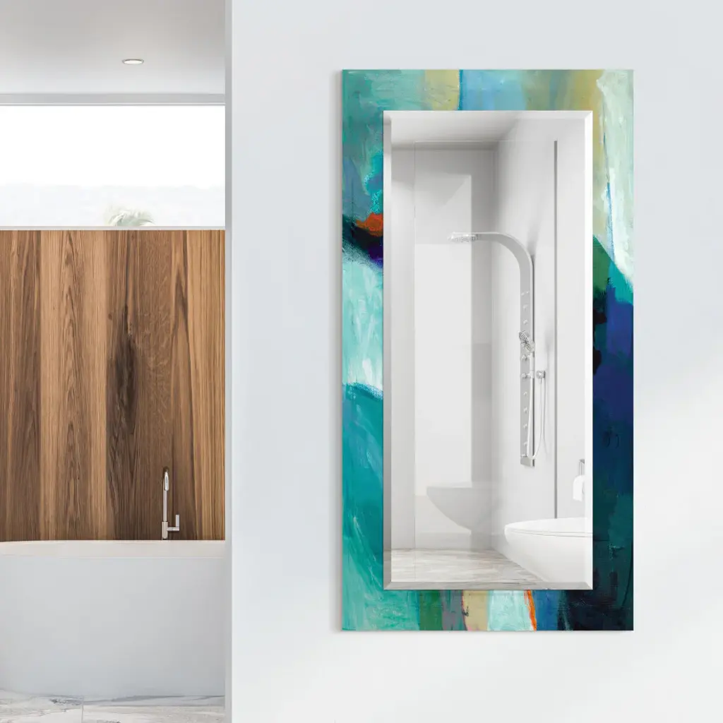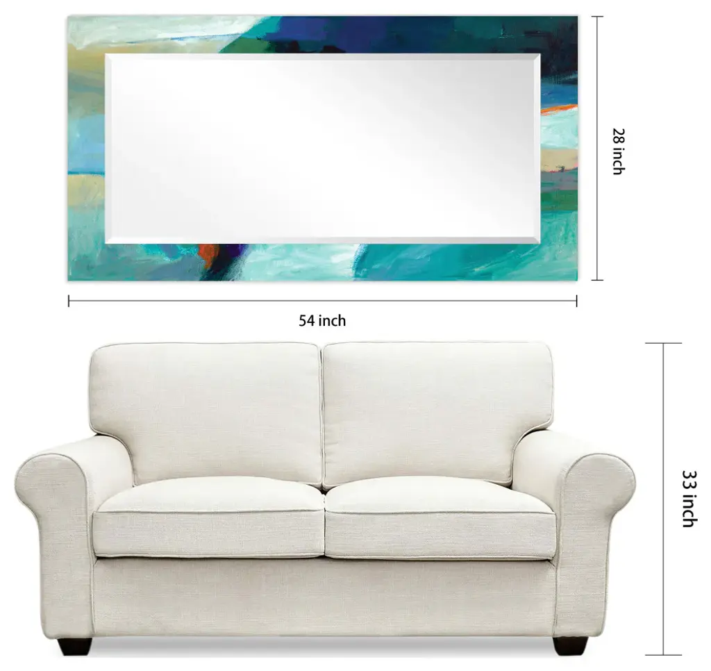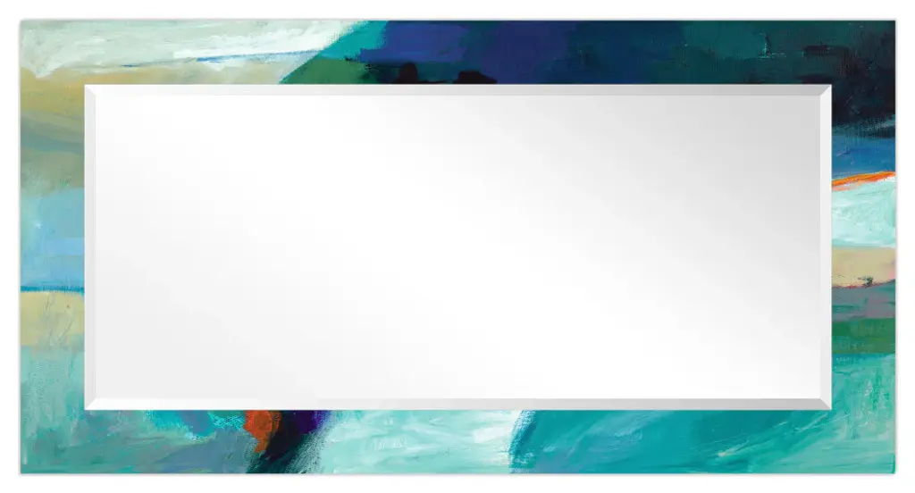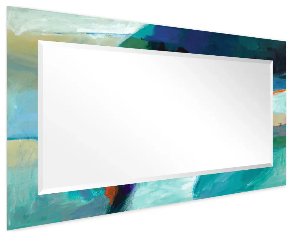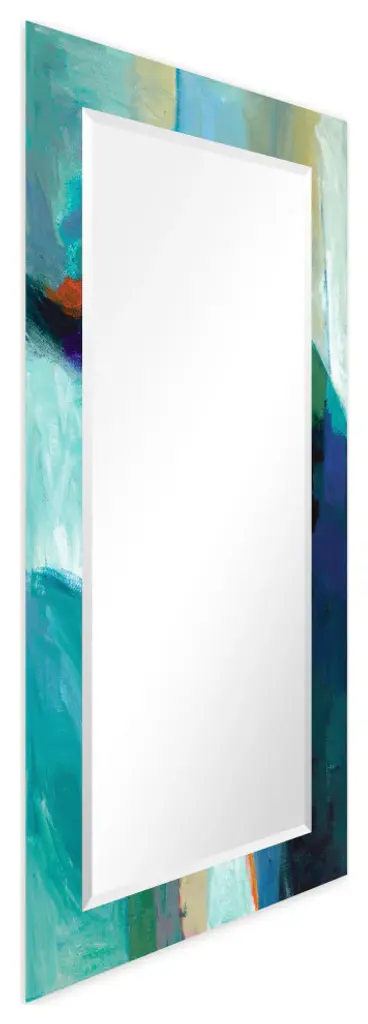 Empire Art Direct"™s collection of printed, frame-less, free floating, tempered glass was inspired by the French technique of Verre Eglomise in which artist''s literally painted the back of clear glass so that when viewed from the front the painting is brought to life under the depth of the glass. This incredible piece takes that same tempered glass and displays a beveled mirror, centered in front of a beautiful green and blue abstract. 4 strong steel hangers are attached to the back of the mirror for a quick and easy vertical or horizontal installation.