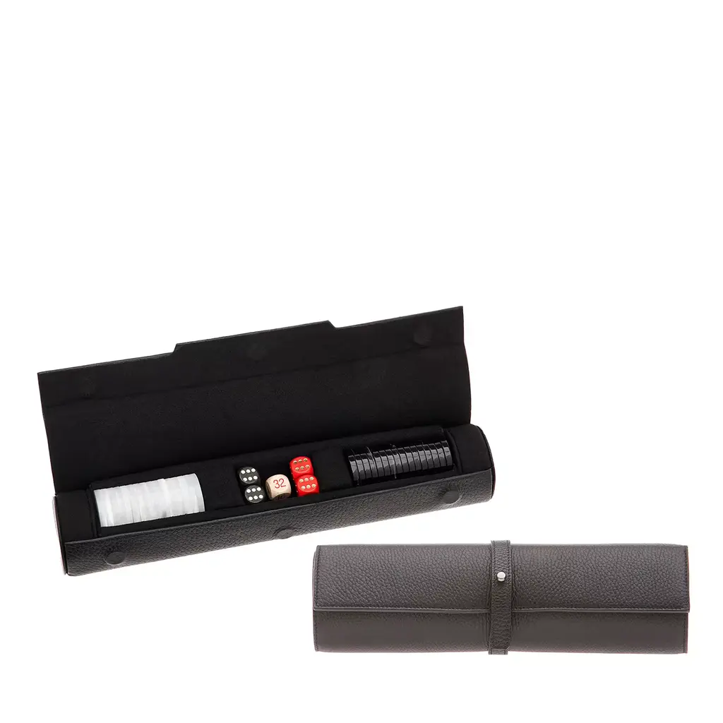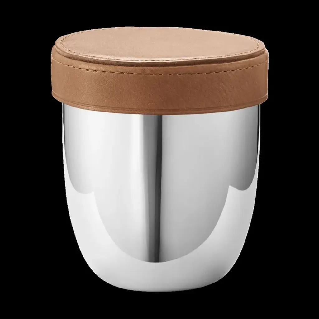 Solve the eternal problem of what to buy for someone who has everything! This stylish dice set with stainless steel cup is perfect for someone who likes to play games at home or when traveling. A great accessory for a study or games room, the curved cup is a pleasure to hold and the leather cap fits tightly for shaking and transport. Aurélien Barbry strongly believes that functionality should always be as important as beauty when designing successful products. His aesthetic is realized perfectly in the Sky collection for Georg Jensen where bar accessories and homeware are given striking sculptural shapes with no compromise on their practicality. The cup is made from mirror-polished stainless steel with a leather cover. It comes with five dice.