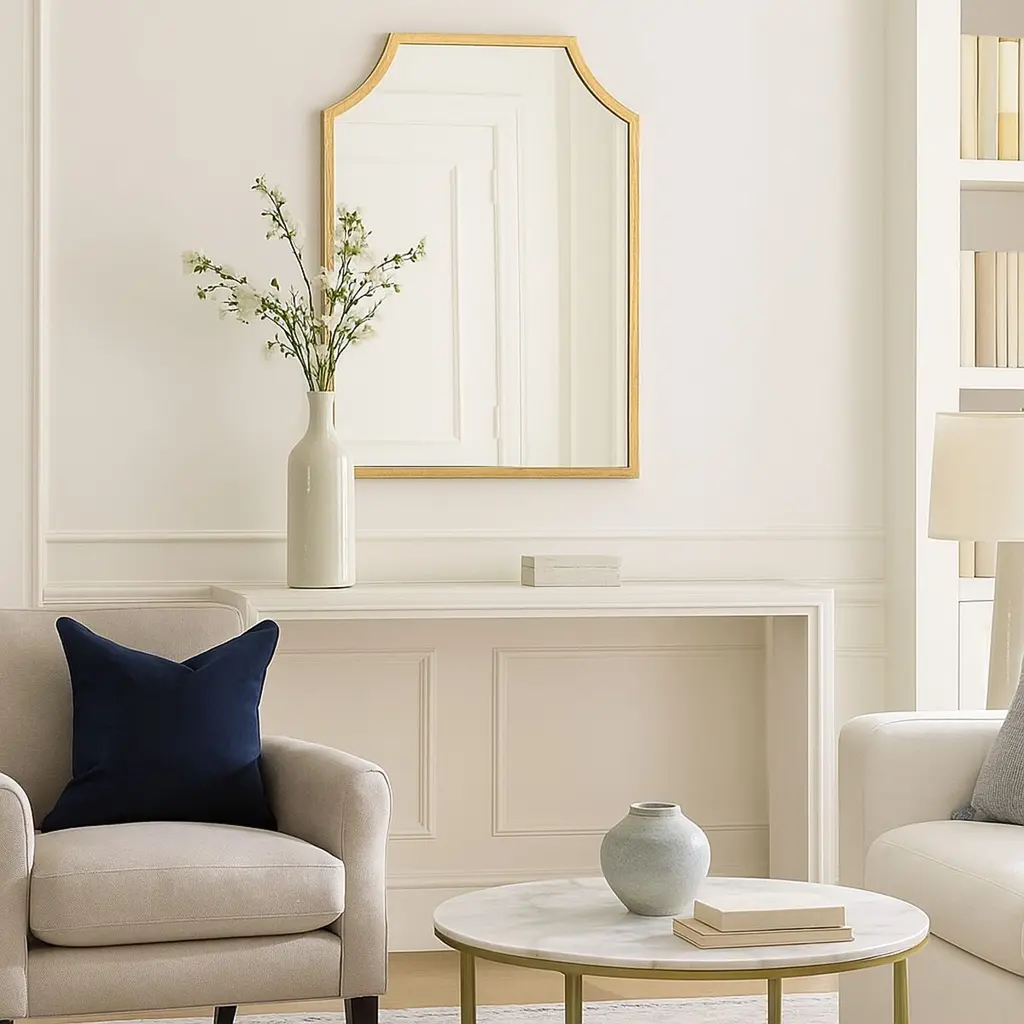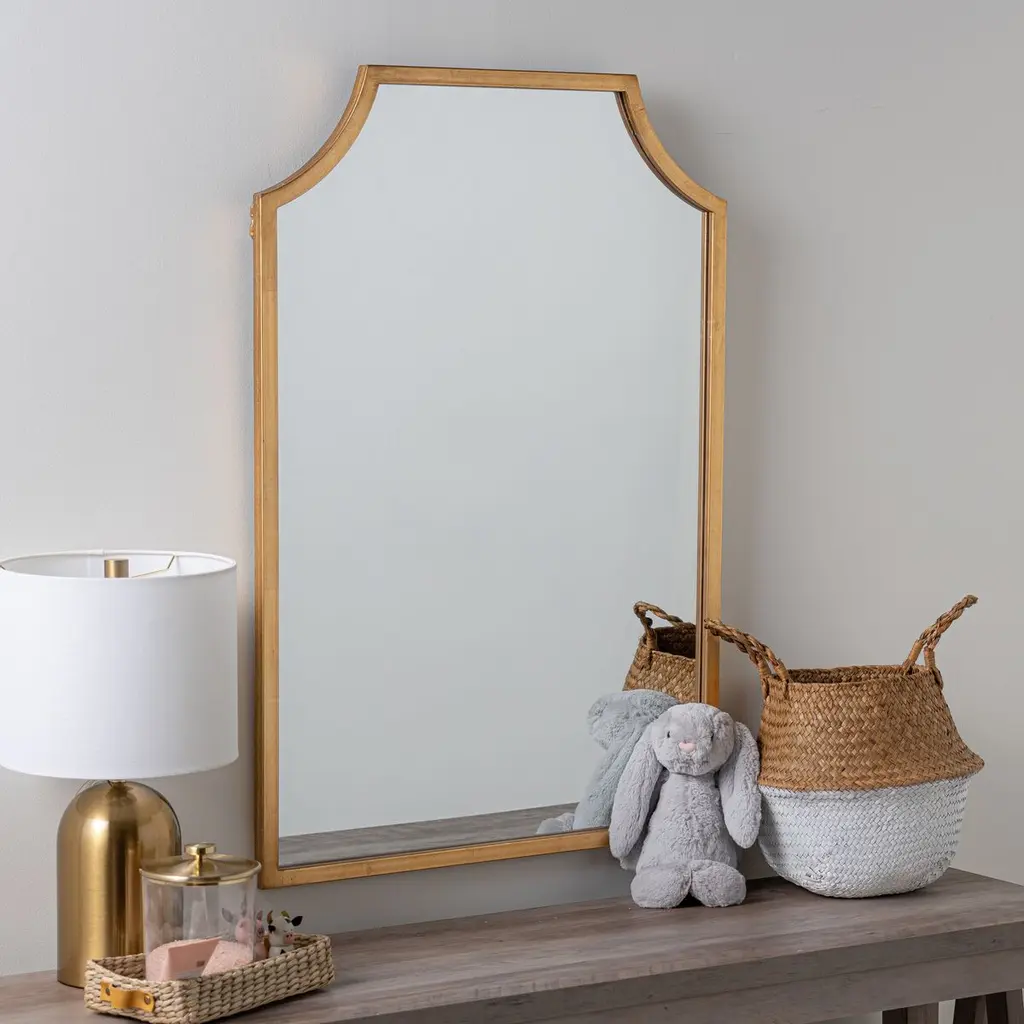 The golden frame accentuates the timeless elegance of this wall mirror's silhouette. Standing three feet high, the mirror is equally at home in a minimalist entry and a maximalist living room.