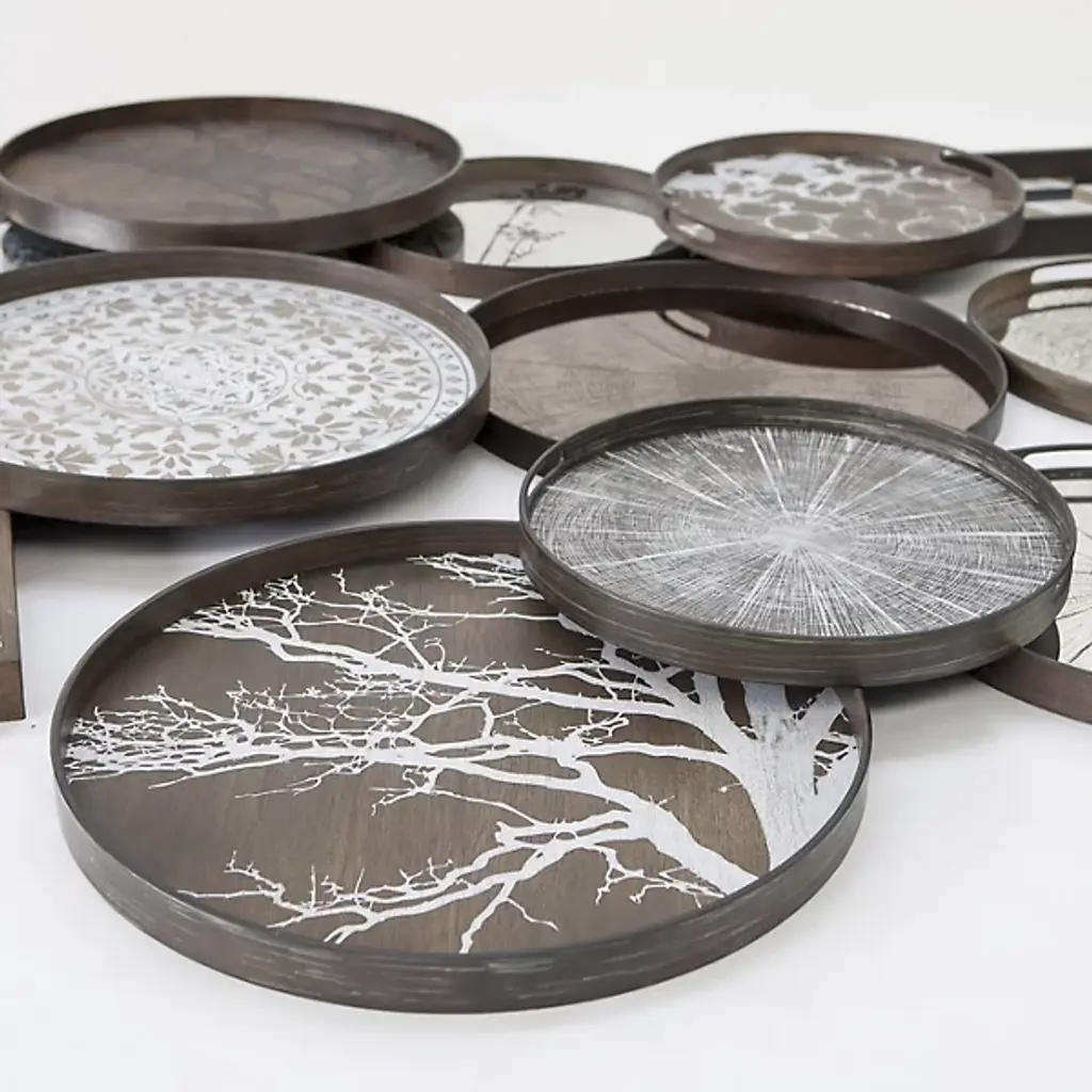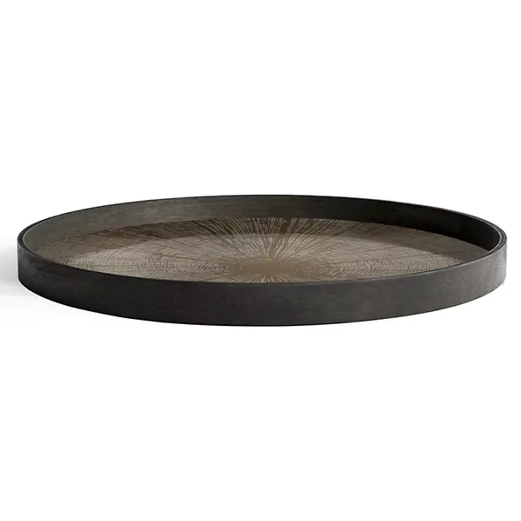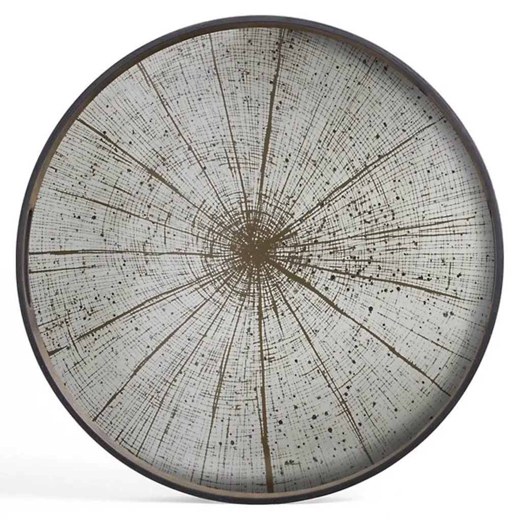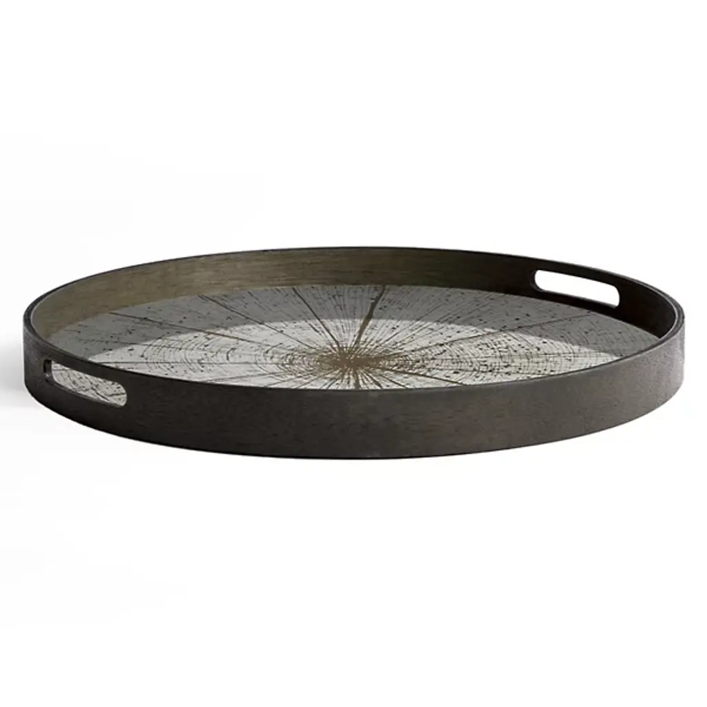 Display your treasures with contemporary flair using the Slice Mirror Tray from Ethnicraft. Circular in form, this accent piece features linear depictions that slice the mirror surface into stylized segments reminiscent of a pie graph. The rimmed edge provides stability, while carvings at the sides make handholds for easy lifting.