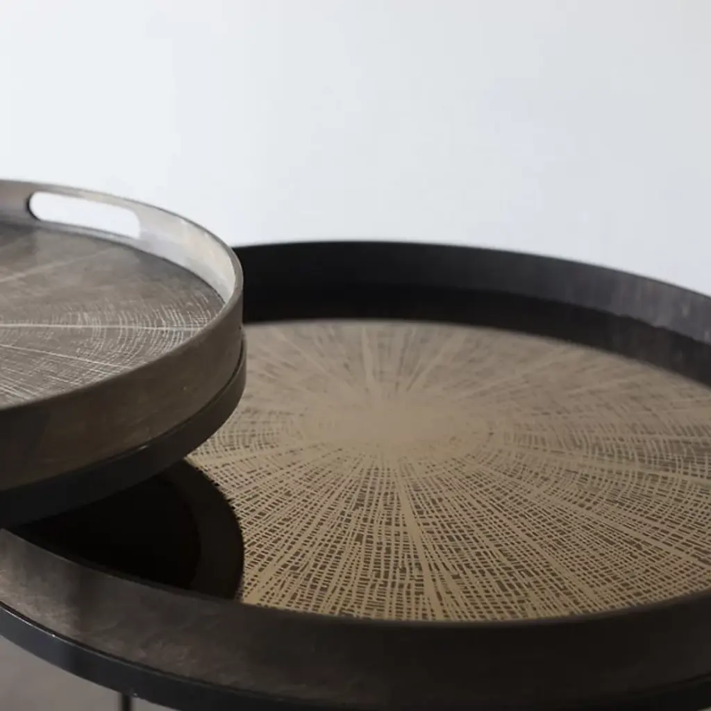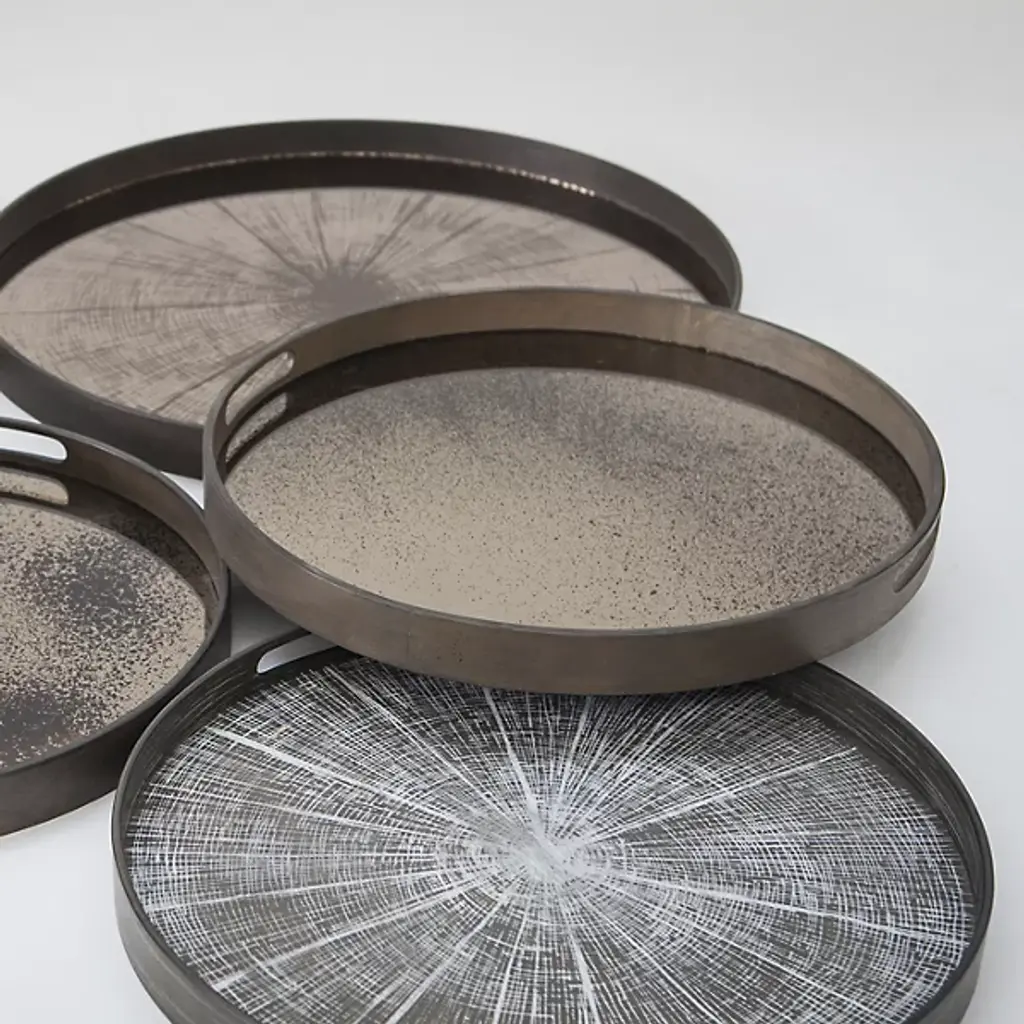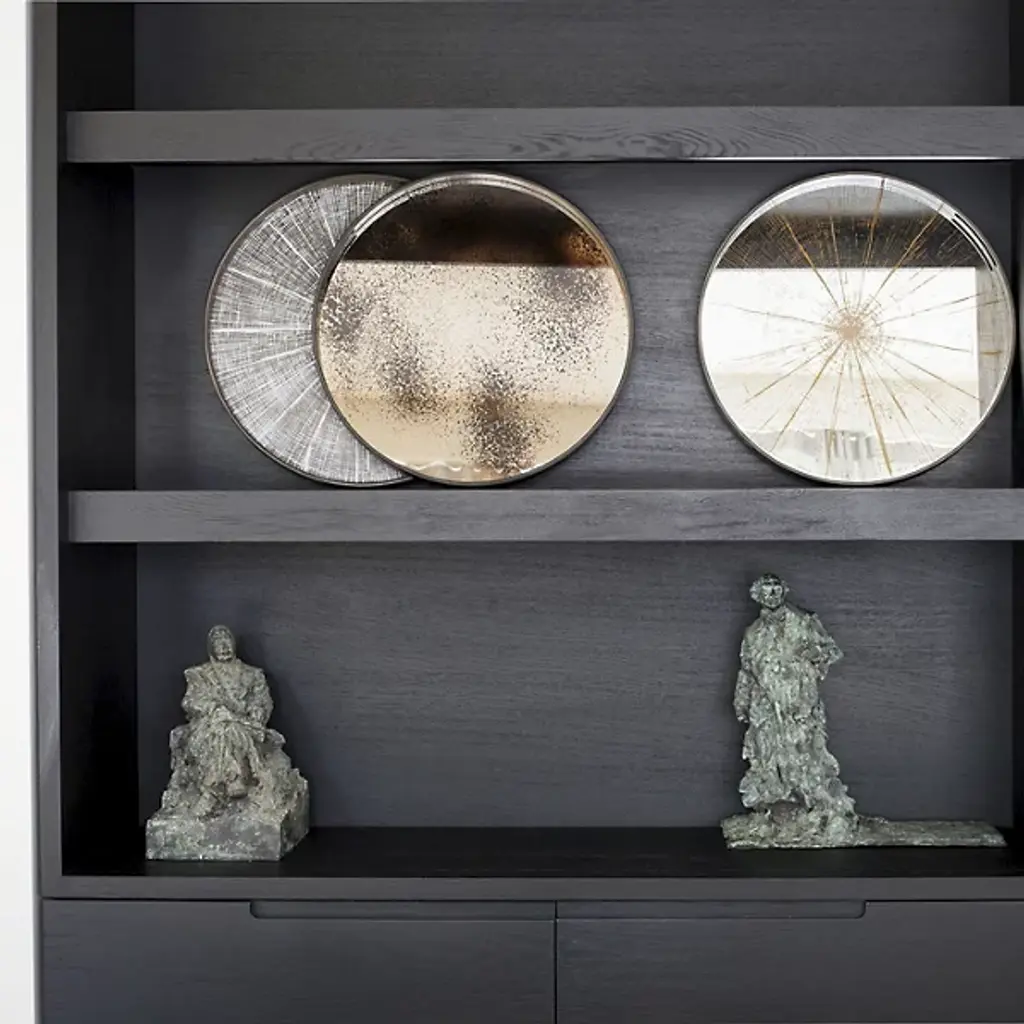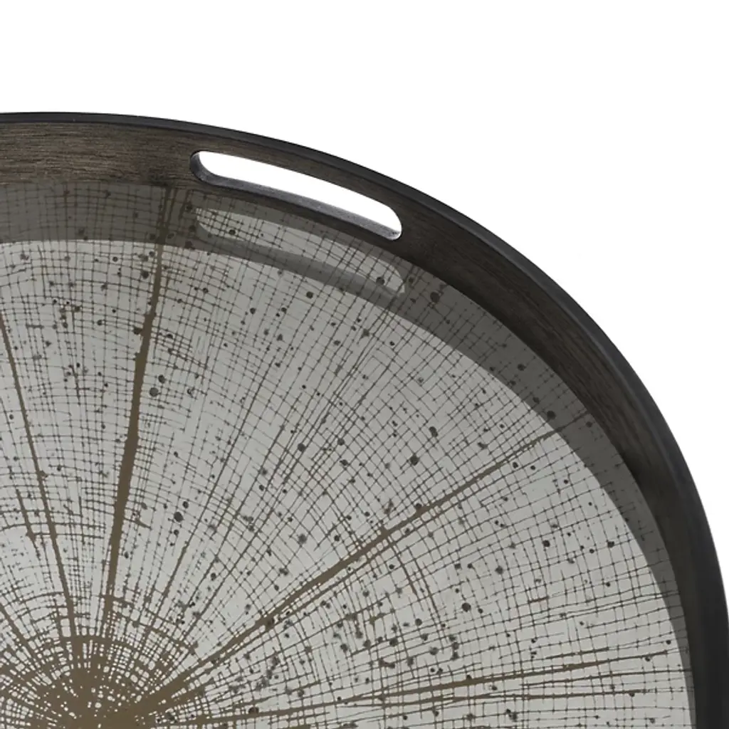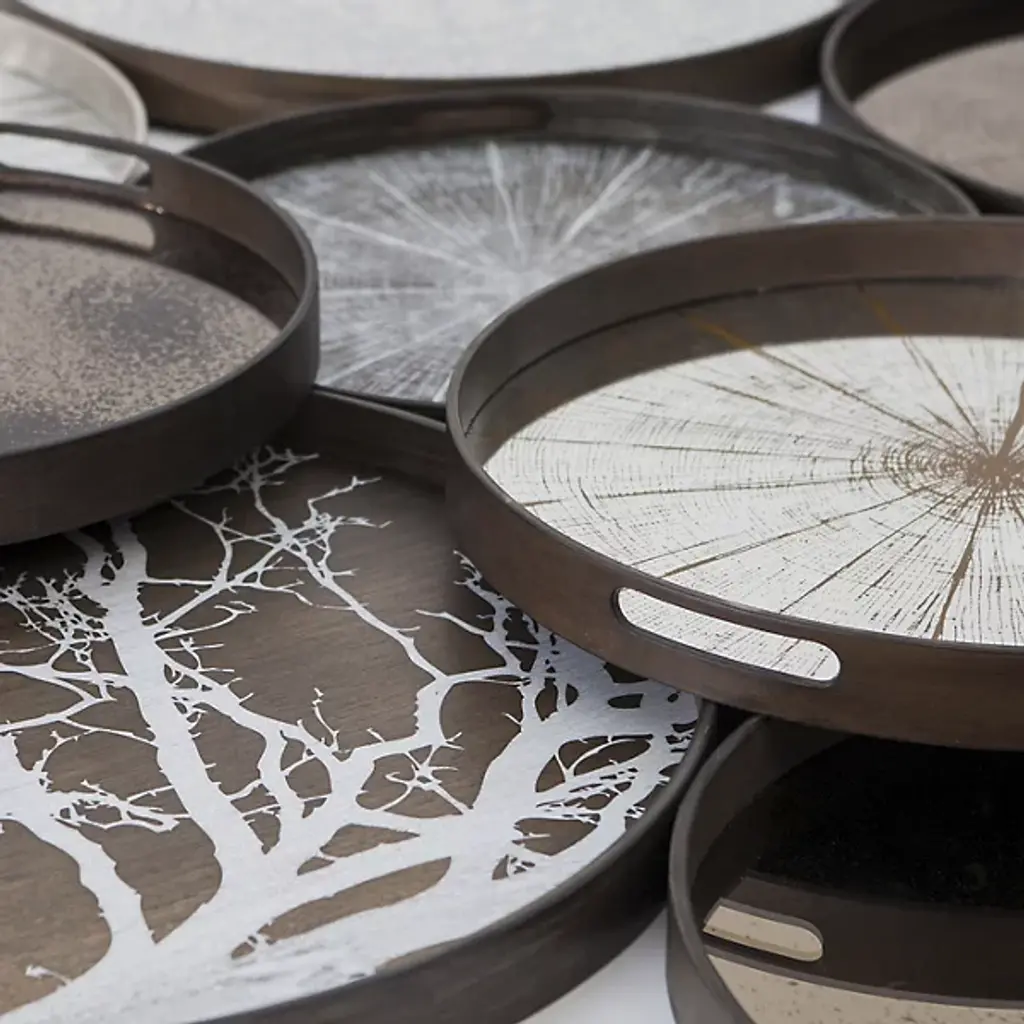 Display your treasures with contemporary flair using the Slice Mirror Tray from Ethnicraft. Circular in form, this accent piece features linear depictions that slice the mirror surface into stylized segments reminiscent of a pie graph. The rimmed edge provides stability, while carvings at the sides make handholds for easy lifting.