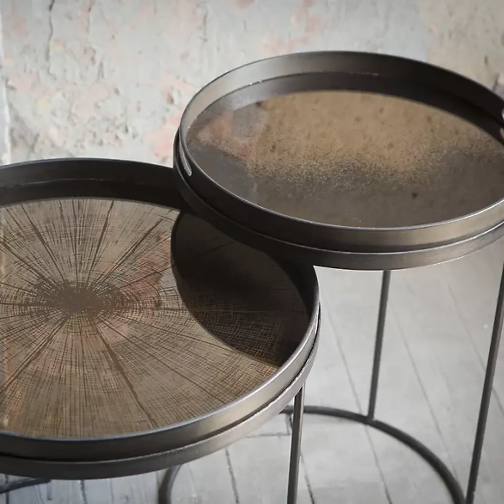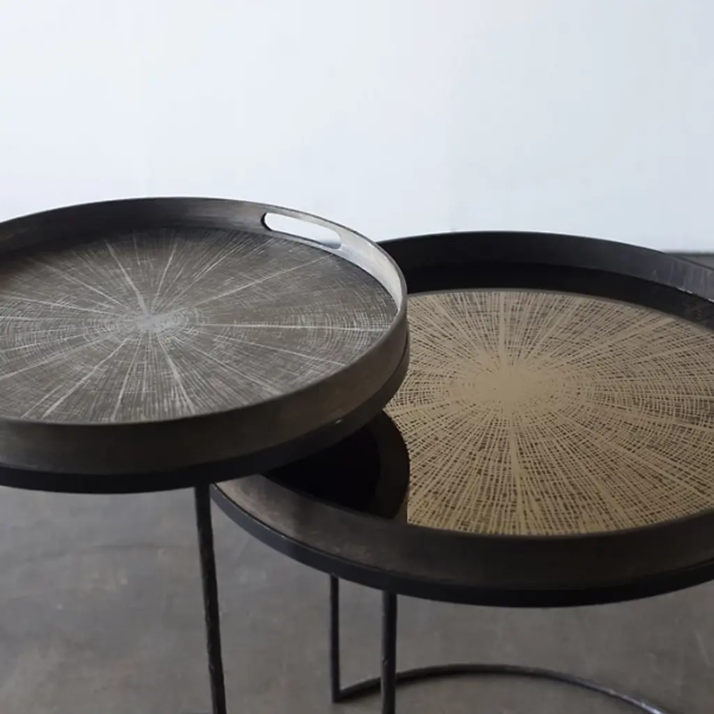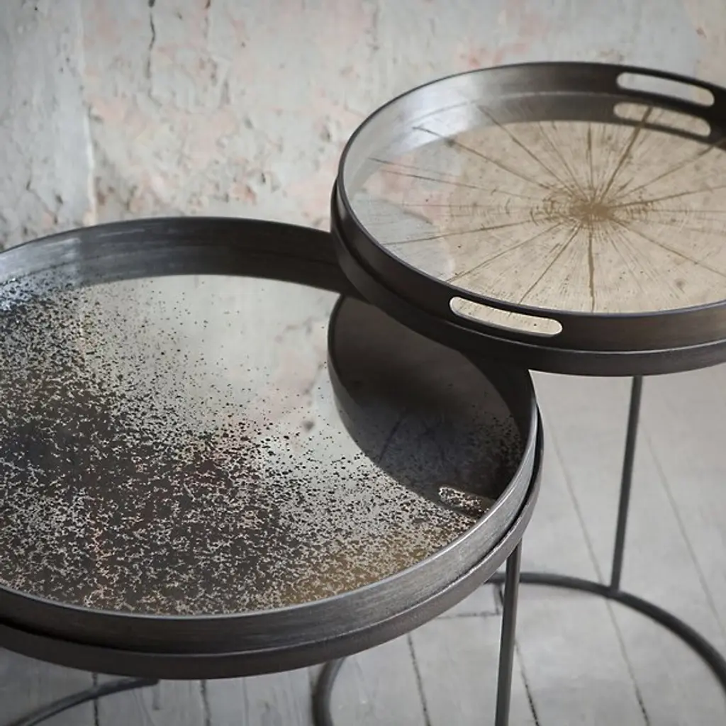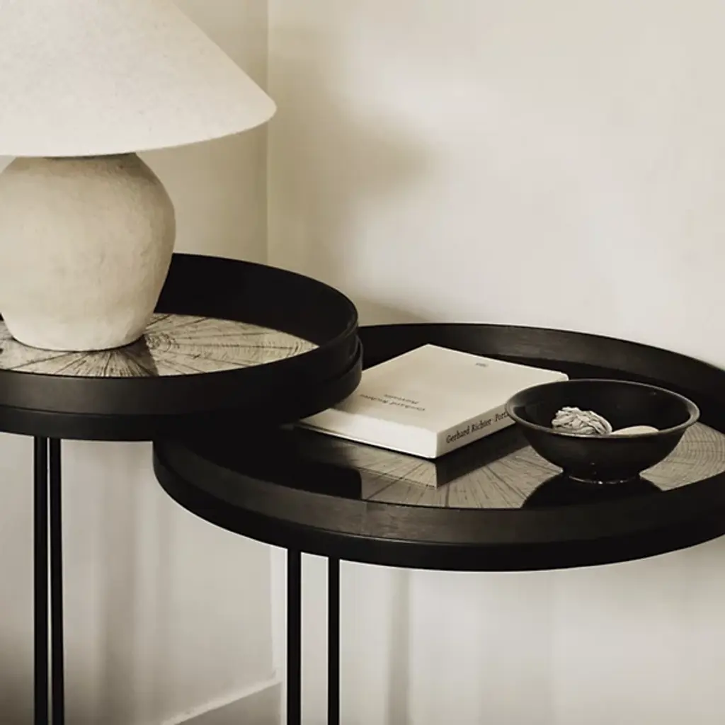 Display your treasures with contemporary flair using the Slice Mirror Tray from Ethnicraft. Circular in form, this accent piece features linear depictions that slice the mirror surface into stylized segments reminiscent of a pie graph. The rimmed edge provides stability, while carvings at the sides make handholds for easy lifting.