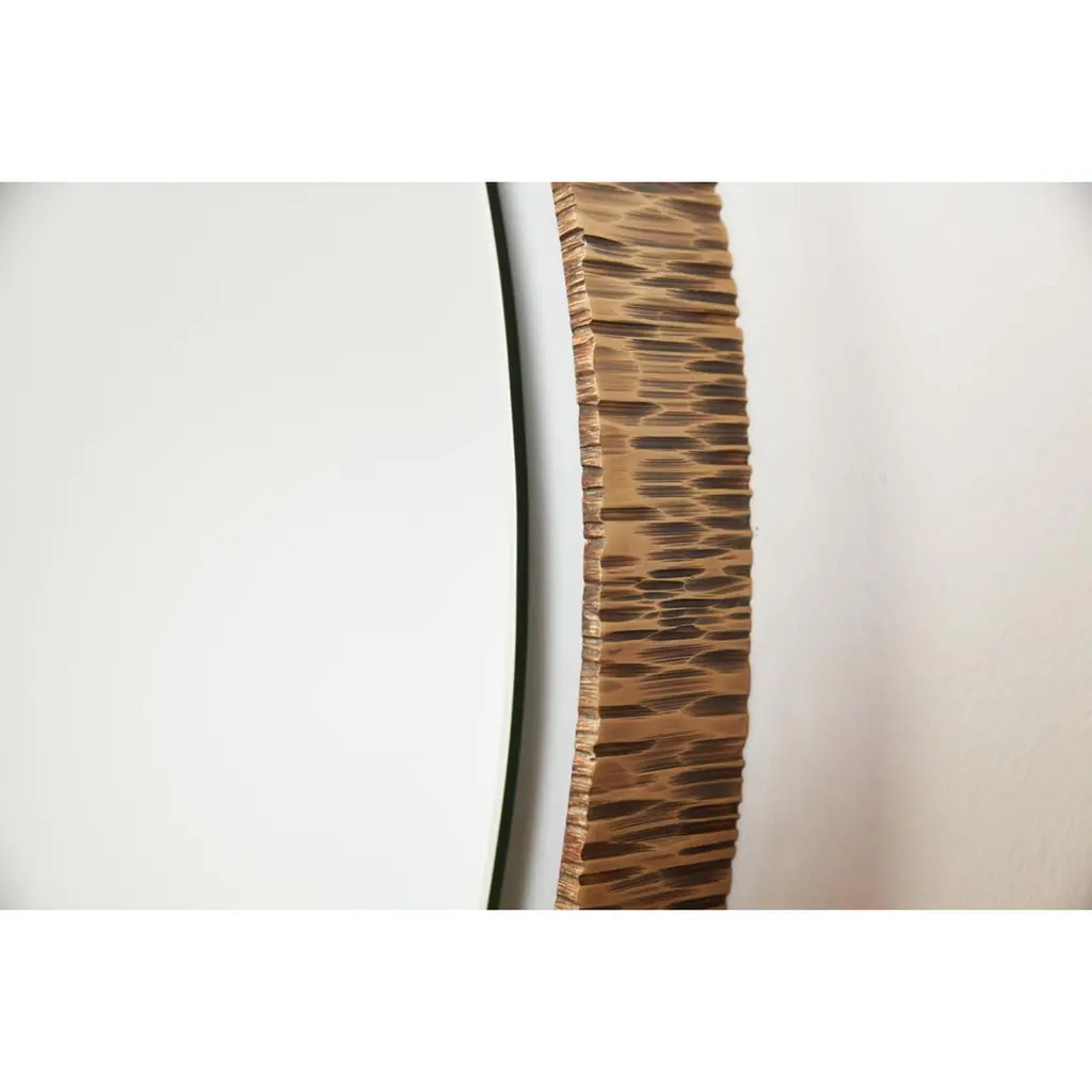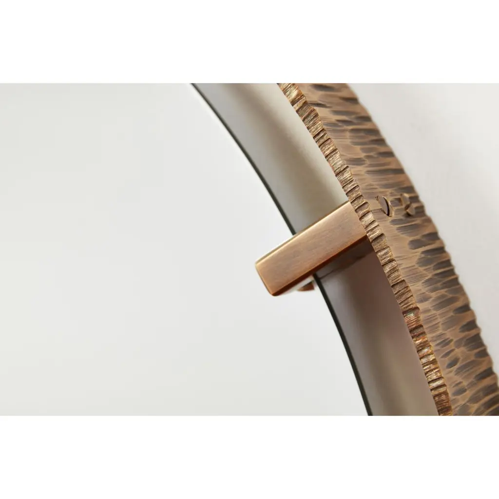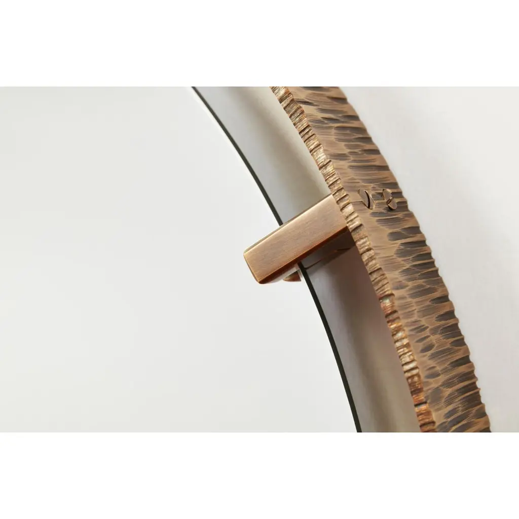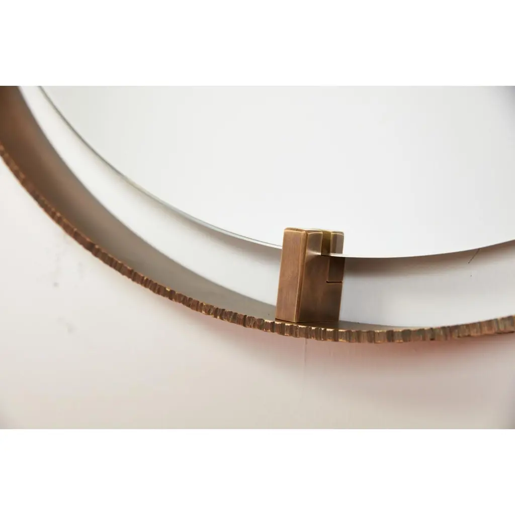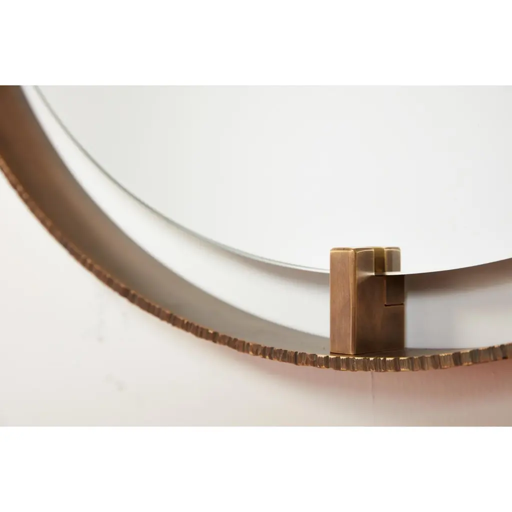 Small Circular Gauged Edge Mirror by William EmmersonDimensions: Ø 78,7 x D 5,1 cm.Materials: Brass and mirror.Also available in large (Ø 122 x D 5,1 cm). Please contact us. Introducing "Gilded Imperfections," an exquisite luxury mirror that seamlessly blends opulence with raw, imperfect beauty. Crafted from polished brass, it exudes timeless elegance, while deliberate gouges disrupt its flawless surface, embracing vulnerability and celebrating the beauty found in imperfections. The contrast between luxurious brass and intentional markings prompts contemplation on the duality of existence and the transient nature of beauty. As viewers engage with it, the mirror becomes a metaphorical portal for introspection, highlighting the depth and texture created by light and shadow. "Gilded Imperfections" challenges society's obsession with flawless aesthetics, embracing authenticity and uniqueness, and inviting viewers to appreciate their own scars as sources of profound beauty.Extraordinary "gouge" mirror designed by William Emmerson The mirror's brass frame has deliberate gouges and imperfections which are carefully etched into the thick solid brass frame. The attention to detail and craftsmanship is as impressive as any piece of artwork.William Emmerson, founder and principal of William Emmerson Inc. is a world-renowned British designer, sculptor, an innovator. He attributes the birth of this multidisciplinary company, known for its unique juxtaposition of the modern and vintage worlds, to his early childhood in London where he grew up watching his father carve and create wooden sculptures.A versatile early career in Los Angeles, weaving eight years of art direction for film and videos and four years of working with master craftsmen to build furniture, cabinetry, has characterized his exclusive and unique compositions.