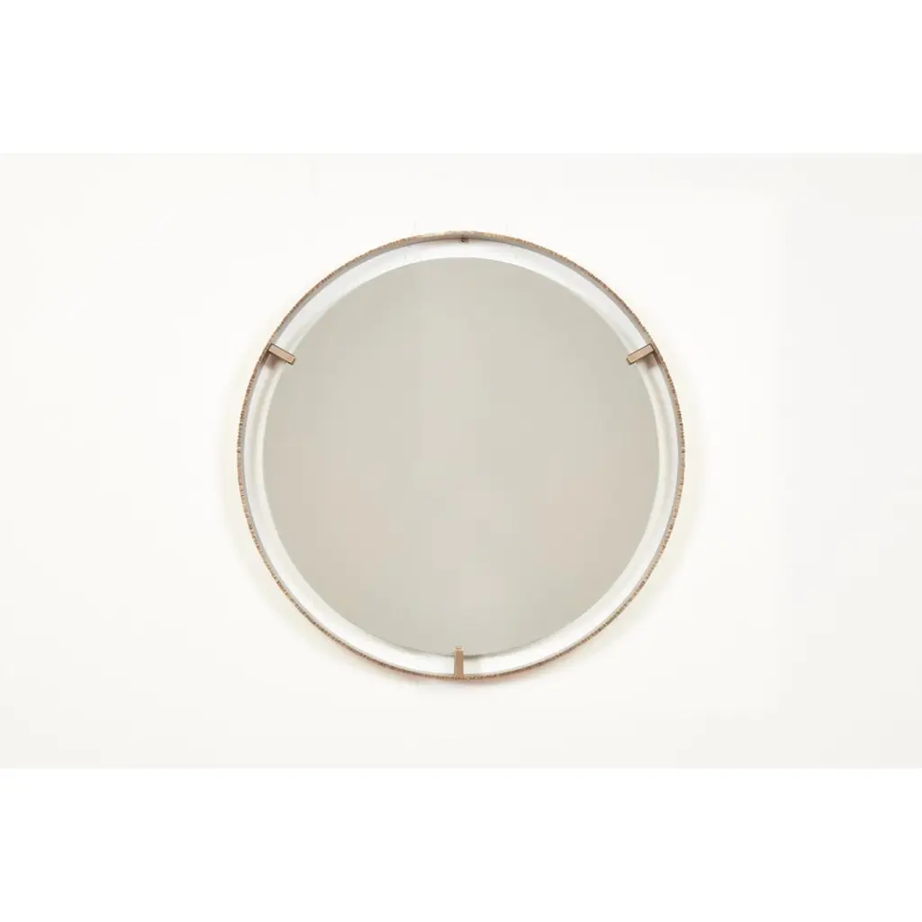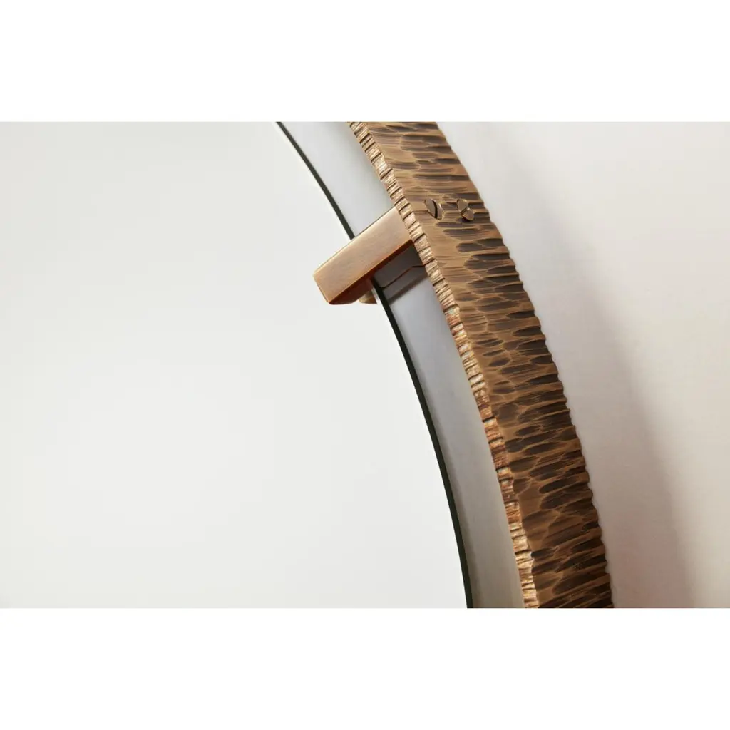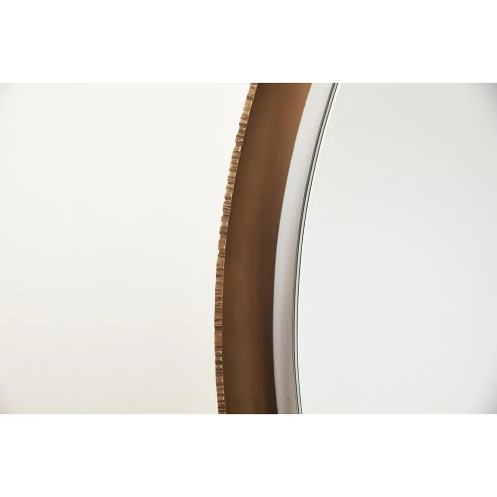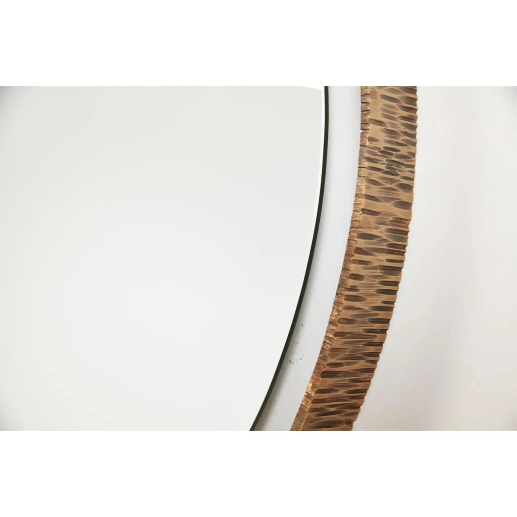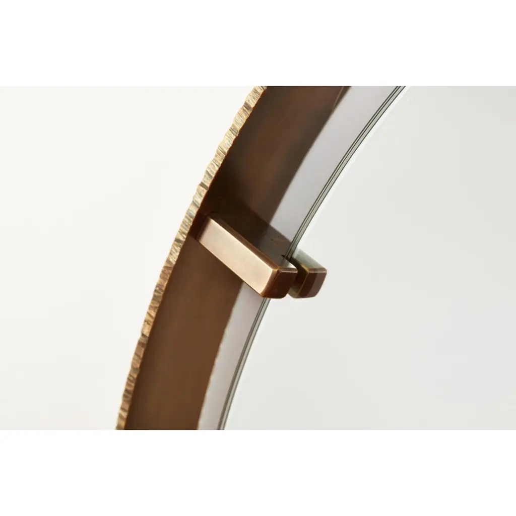Small Circular Gauged Edge Mirror by William EmmersonDimensions: Ø 78,7 x D 5,1 cm.Materials: Brass and mirror.Also available in large (Ø 122 x D 5,1 cm). Please contact us. Introducing "Gilded Imperfections," an exquisite luxury mirror that seamlessly blends opulence with raw, imperfect beauty. Crafted from polished brass, it exudes timeless elegance, while deliberate gouges disrupt its flawless surface, embracing vulnerability and celebrating the beauty found in imperfections. The contrast between luxurious brass and intentional markings prompts contemplation on the duality of existence and the transient nature of beauty. As viewers engage with it, the mirror becomes a metaphorical portal for introspection, highlighting the depth and texture created by light and shadow. "Gilded Imperfections" challenges society's obsession with flawless aesthetics, embracing authenticity and uniqueness, and inviting viewers to appreciate their own scars as sources of profound beauty.Extraordinary "gouge" mirror designed by William Emmerson The mirror's brass frame has deliberate gouges and imperfections which are carefully etched into the thick solid brass frame. The attention to detail and craftsmanship is as impressive as any piece of artwork.William Emmerson, founder and principal of William Emmerson Inc. is a world-renowned British designer, sculptor, an innovator. He attributes the birth of this multidisciplinary company, known for its unique juxtaposition of the modern and vintage worlds, to his early childhood in London where he grew up watching his father carve and create wooden sculptures.A versatile early career in Los Angeles, weaving eight years of art direction for film and videos and four years of working with master craftsmen to build furniture, cabinetry, has characterized his exclusive and unique compositions.