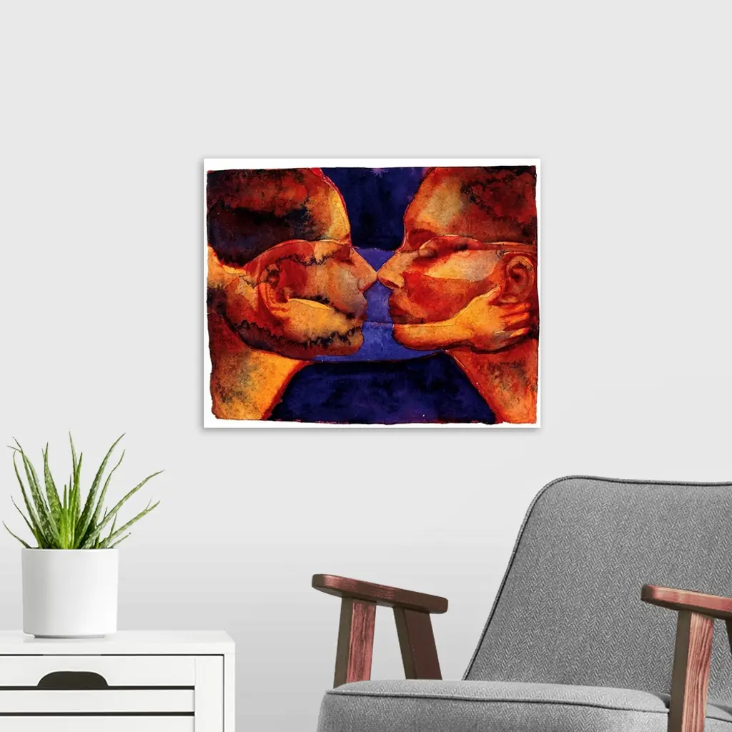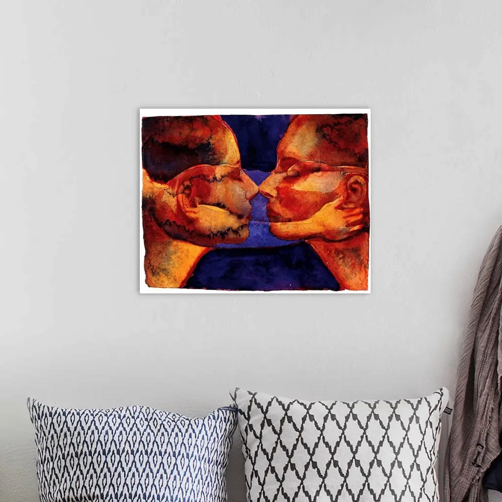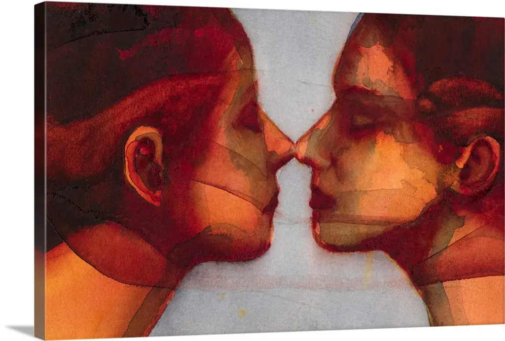 Contemporary watercolor painting of two deep orange toned faces coming close together to kiss.