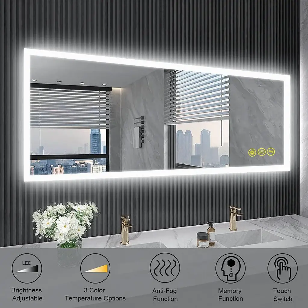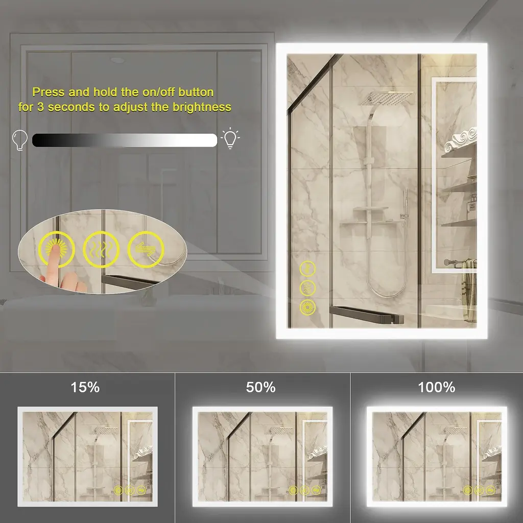 LED bathroom mirror is modernly designed with frameless frosted edges, not only gently shining on your beautiful face, but also adding artful details to your space.【Unique Design】 :1.2" wide frosted edge with led backlit is sleek and simple, and the frameless design is well compatible with all your decoration style spaces.【Excellent LED】 :The LED Lighted bathroom mirror uses an industry-leading 90+ CRI LED strip for superior brightness and low energy, LED strip is covered by PVC, and LED pixels can't be seen from the sides, delivering soft and comfortable light. All electrical parts are completely covered, waterproof, and IP44 rated, which can be safely used in bathrooms.【Anti Fog】 : Defogger is separately controlled by a touch switch. Turn it on/off according to your needs. Low power consumption, safe, and energy-saving.【Care Instructions】 :Easy-to-clean surface with basic glass cleaner for hassle-free maintenance.【Easy To Install】 :The wall-mounted vanity mirror is designed very practically, and supplied with a plug and a 5feet cord that can be plugged into a standard outlet or cut the plug hardwire to the junction box directly. Come with a mounting hardware kit.