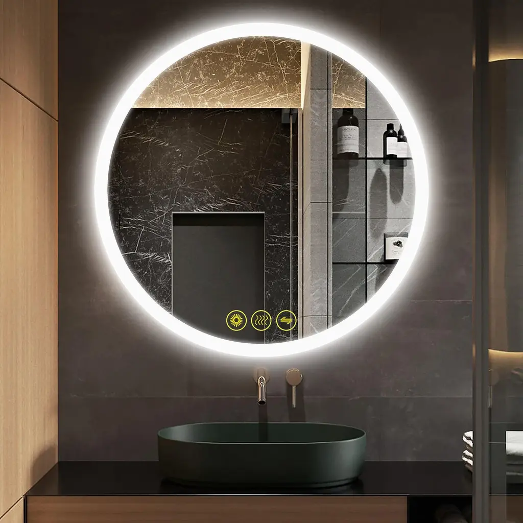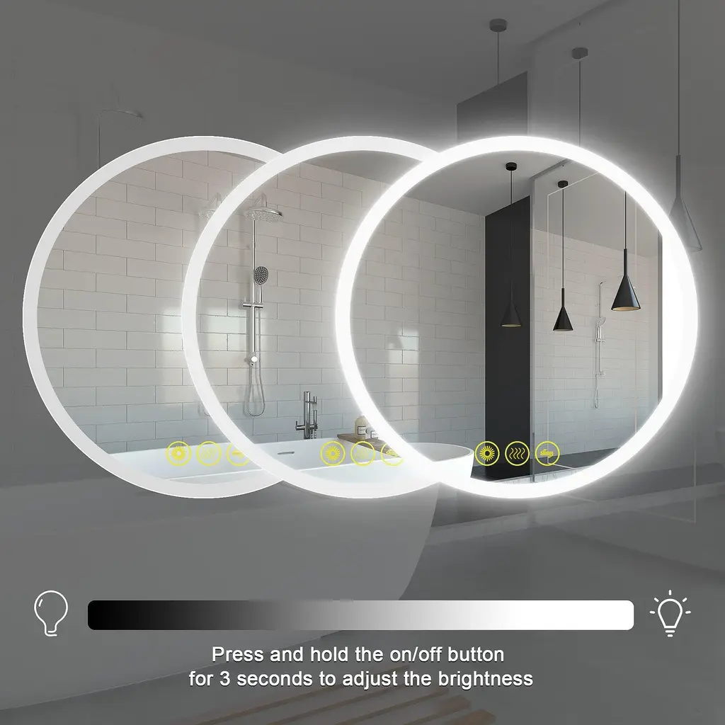 This modern mirror has frame-less frosted edges and integrated LED lights that will add artful details to your space. An innovative defogger keeps the glass fog-free all the time. The high-quality LED light has a long lifespan, so it's more durable and provides fantastic clarity every time.【Unique Design】 :This round led mirror has front light and backlight, making your bathroom bright. This mirror uses a high-density 240leds/m light band with super bright LED lights. CRI 90+ brings high-definition imaging.【Memory Dimming Button】 :Press and hold the touch light button to adjust the brightness you want. The full range of dimming, led bathroom mirrors will remember your last use. Support wall switch control on / off. Click the button to change the LED temperature to warm (3000k) / daylight (4500k) / white light (6400k).【Anti Fog】 : The demister is independently controlled by the touch switch. Turn it on / off as needed. Low power consumption, safety, and energy saving.【Care Instructions】 :Easy-to-clean surface with basic glass cleaner for hassle-free maintenance.【Easy To Install】 :The wall-mounted vanity mirror is designed very practically, supplied with a plug and a 5-foot cord that can be plugged into a standard outlet or cut the plug hardwire to the junction box directly. Come with a mounting hardware kit.