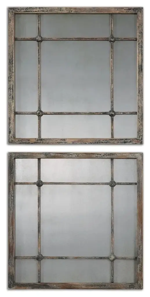 Heavily distressed, slate blue frame with aged ivory accents, antiqued mirrors. 19'''' x 19'''' x 1'''' - Glass Measurements: 17. 75'''' x 17. 75'''' Properly weighted hanging hardware is attached. Mirror has a state of the art back coating to protect against moisture and discoloration. Fir Heirloom Quality - Expertly hand crafted and hand finished Due to the hand crafted nature of this piece, each piece may have subtle differences.