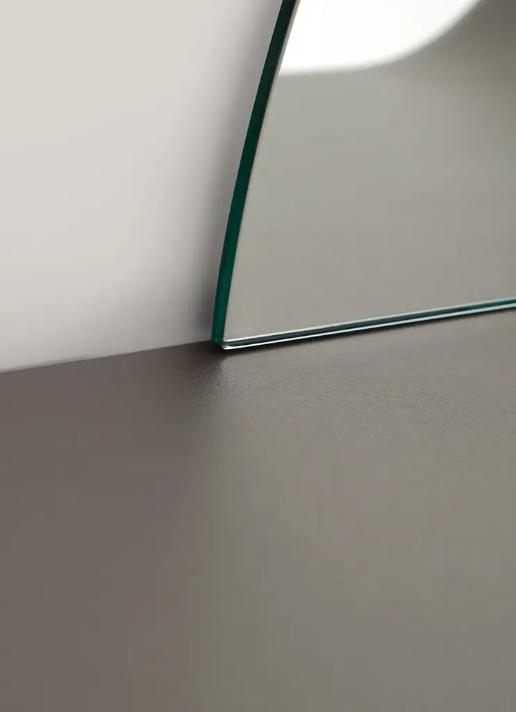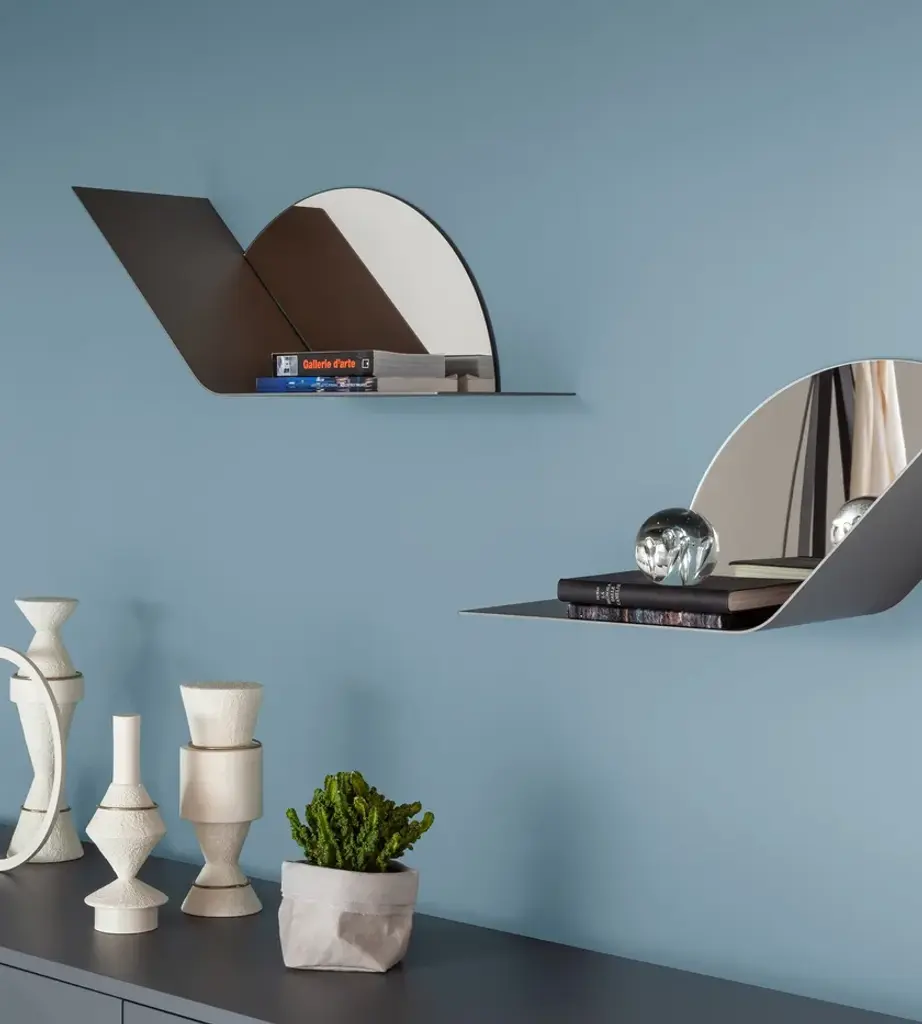 SNAIL is a mirror with shelf in calendered, epoxy powder-coated metal in a champagne or burnished metal finish. Snail inspired by the shelled gastropod shape. A metal structure that is ideal for storing books and vases and a mirror to create unusual, dynamic arrangements. It may be oriented either to the right or left as required and will certainly be a wall decoration talking point. The Enjoy Collection is Morica Design’s most sparkling, dynamic collection. The items are lively, inspired by nature, and find their soul in the pastel shades that blend and play with the wood in an original, fresh manner. The distinctive feature of Enjoy Collection is the use of color, declined in functional furnishings and contemporary mood. Modern and refined products made with high quality materials and handcrafted in Italy.