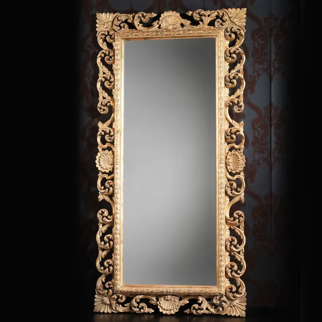 Every detail about this wall mirror tells about a glorious past that gets here homaged by indulging in precious finishes and ornate patterns. A piece of unmistakable Florentine style, the rectangular mirrored glass panel is set in a wooden frame painstakingly carved to give reveal an opulent openwork pattern. Aged-gold metal leaf enriches this unique piece.