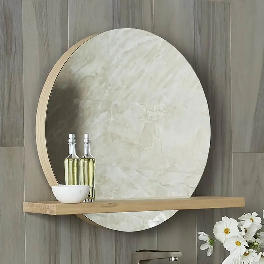 Solace Mirror''s 2" thick frame and soothing oak projects a quiet strength and sense of continuity. Make it a true focal point by adding the optional shelf, boosting the functionality and the wow factor. (Available with or without shelf.)Product Features:-Coordinates seamlessly with the Solace Oak Vanity Base-Transitional style circular mirror-Clean and contemporary design-Mirror available with or without a shelf-Non-beveled mirrored glass-Low-VOC water-resistant finish-Wall-mounted installation-Mirror installation: French cleat included for easy installation-Shelf Installation: Wall mounted, includes two wall anchors-Covered under Native Trails limited lifetime warranty