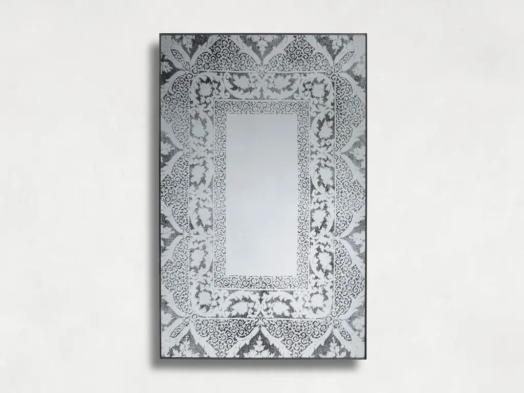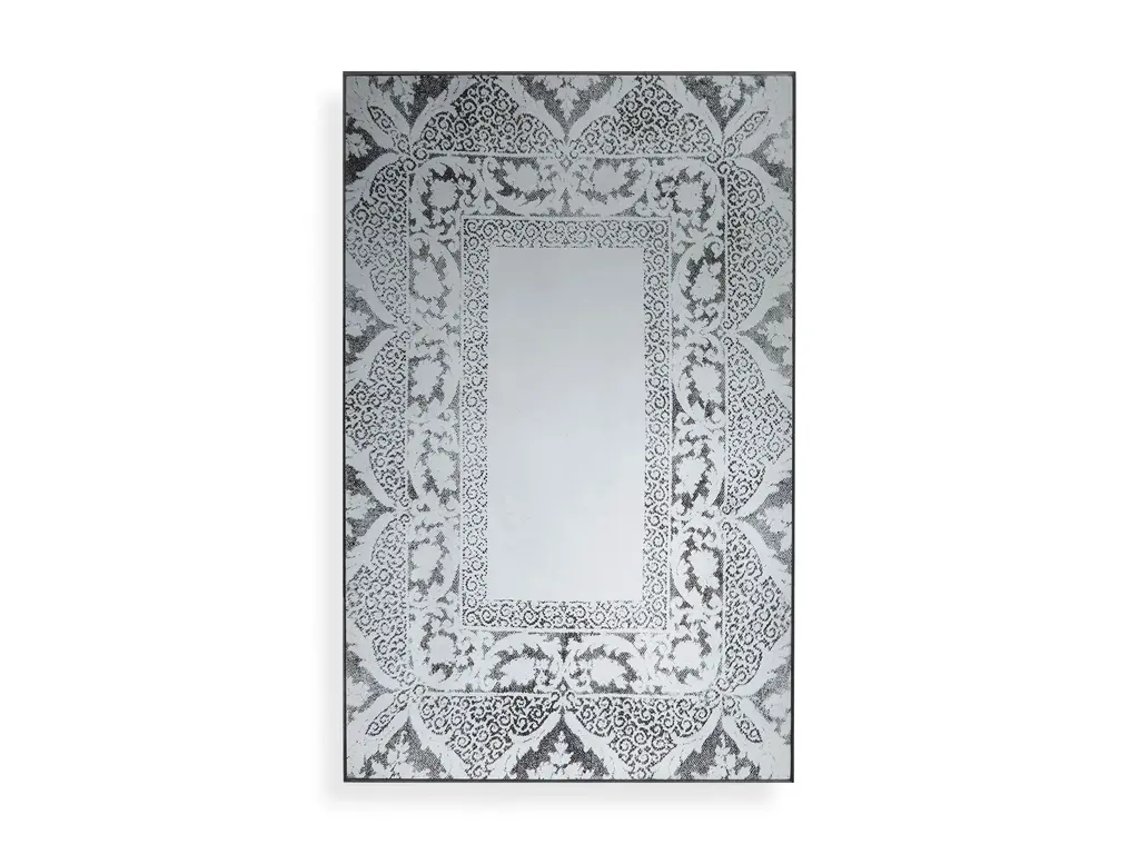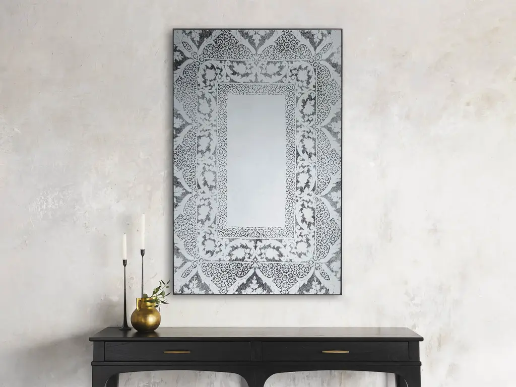 Designed by American artisans, our Solange mirror is marvelously decorated by hand with an intricate lace motif. Real Victorian lace is delicately applied to the mirror’s glass, adding depth and elegance to its stunning antiqued aesthetic.