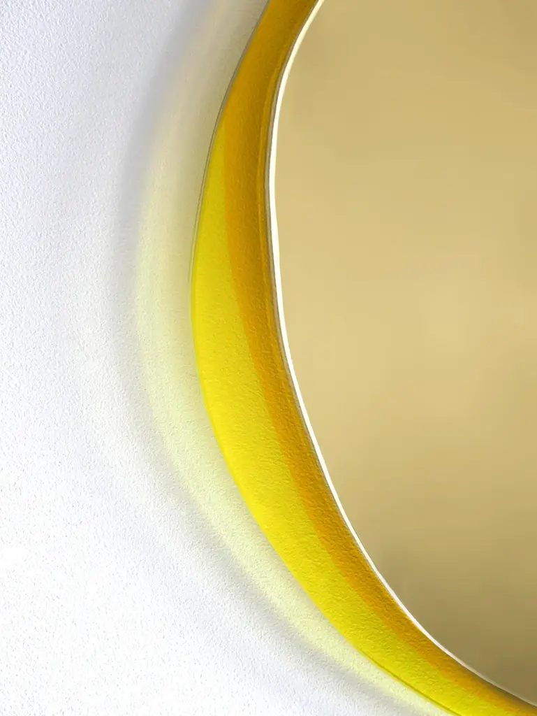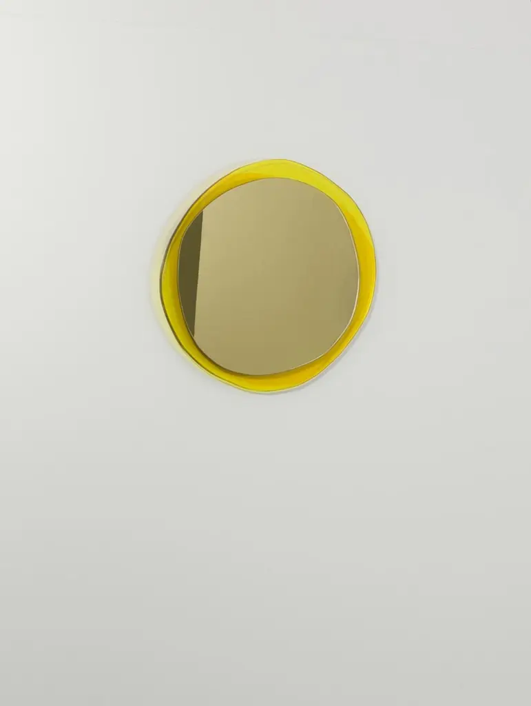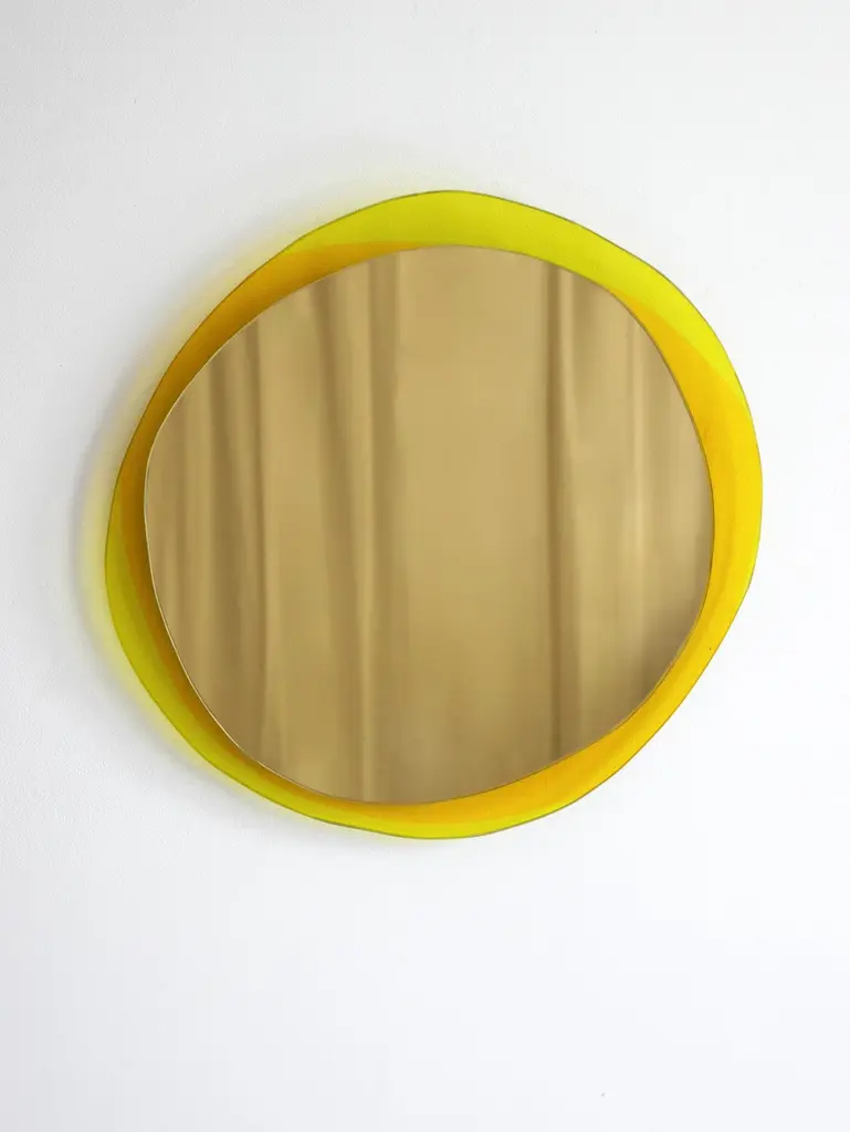 Solar Small Hand-Sculpted mirror, Laurene GuarneriLimited edition.Handmade.Materials: Gold colored mirror, gold and orange colored laminated glass.Dimensions: 40 x 40 cmLaurène Guarneri is a designer based in Paris.Graduated in master's degree from Ensapc (Fine Arts of Paris), she decided to create her brand of mirror design.All pieces are inspired by the fleeting and poetic moments of everyday life. She designs and realizes her creations in her atelier in the Orfevrerie, Saint-Denis, close to Paris.