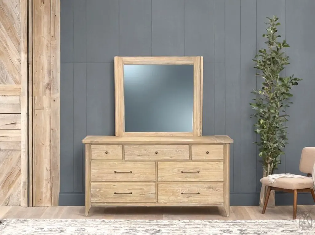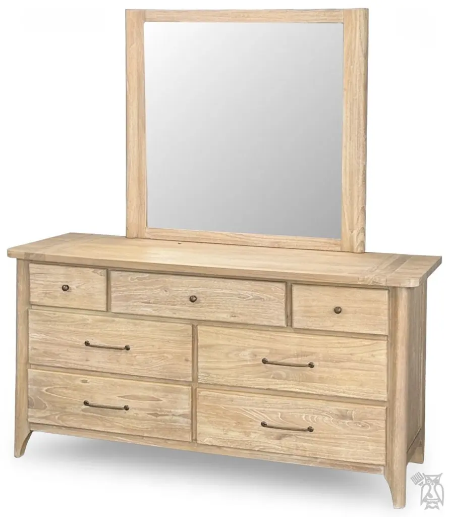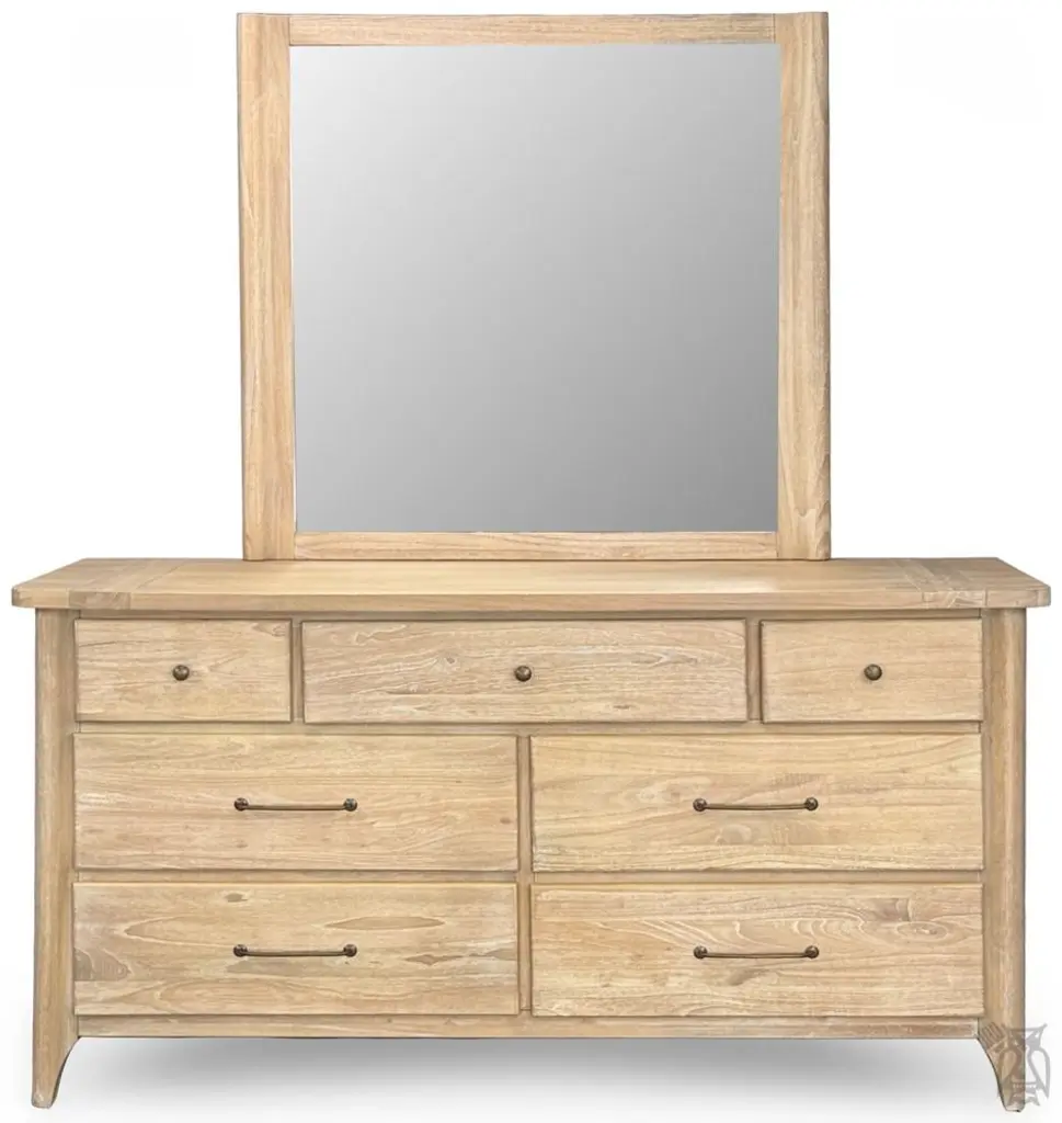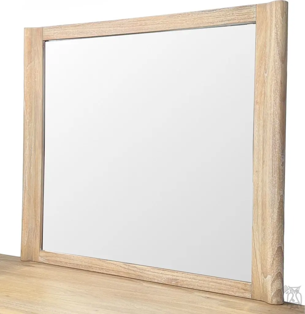 Solid Mindi Wood Aria Mirror in Washed Finish. This American-shaker collection hints at contemporary and rustic blended together. The mirror features a 1" bevel on the mirrored glass and also includes support brackets to attach to the back of the matching dresser. The top of the mirror features bronze iron detail. The beautiful Washed finish not only adds durability to this Solid Mindi Wood collection but also adds richness and warmth to the room. All of these pieces are finished with a 17-step process which includes hand-applied oil to maximize grain quality and uniqueness in each piece. Aged bronze pull hardware completes this collection. The Aria collection features: Certified Lumber-Harvested from forests at managed tree plantations All Wood Furniture-Creates a healthy environment by reducing the amount of chemicals used during manufacturing Mortise & Tenon construction throughout English dovetailed drawers Case goods are dust proofed Drawers operate on full-extension heavy glides Adjustable foot levelers on all pieces Dressers & Chests have oversized drawers Case pieces feature Corner Blocked Construction throughout Drawer interiors have three coats of clear finish and are hand sanded in between each coat for smoothness Solid Mahogany finished bed slats All wood is double-sealed before assembly to ensure correct and consistent moisture content. Pieces are finished with a seventeen-step hand-sanded, hand-rubbed, and hand-stained process producing a deep rich grain quality finish. Dresser solid separately. No particle board. Fully assembled. Manufacturer: Napa Furniture Design.