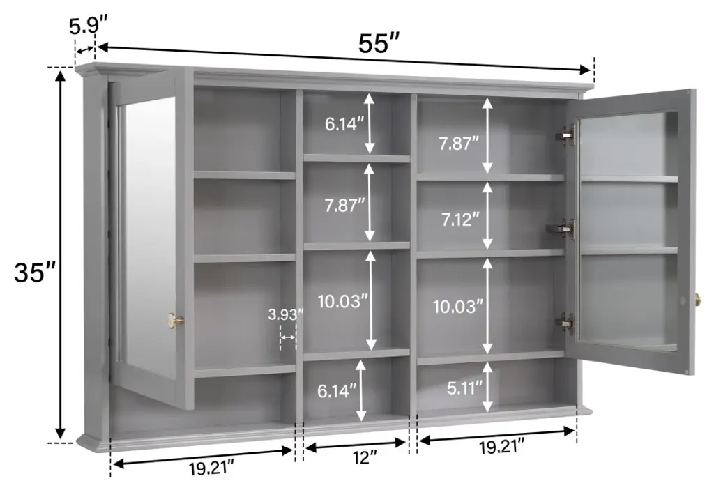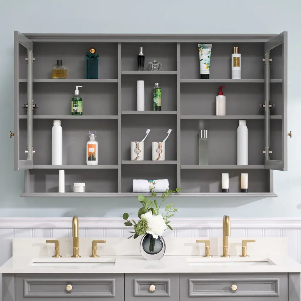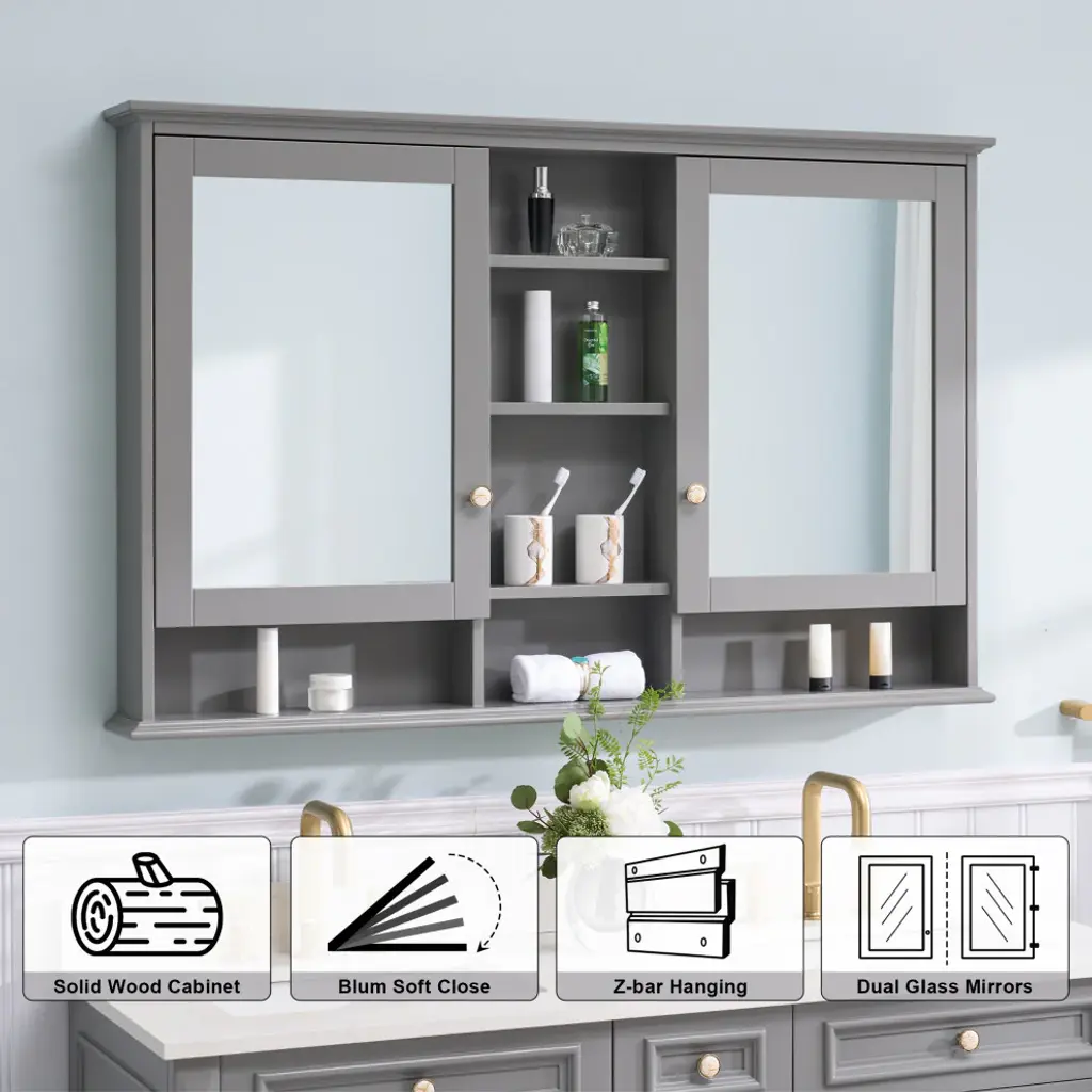 Solid Wood Bathroom Medicine Cabinet With Silver Coated Mirror, Titanium Grey, 55"x35"