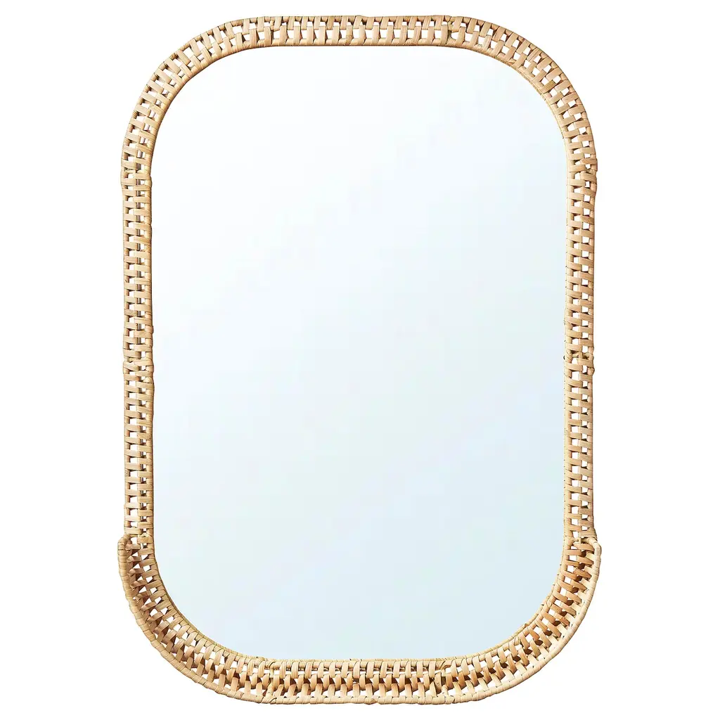 SOMMARBO Mirror - rattan 20 7/8x29 7/8 ". Skilled craftspeople have woven the natural fibers by hand, which makes each mirror unique. The mirror is just as functional as decorative and adds life to an empty wall. On the small shelf you can put keys, rings or a small flower vase. For indoor use only.