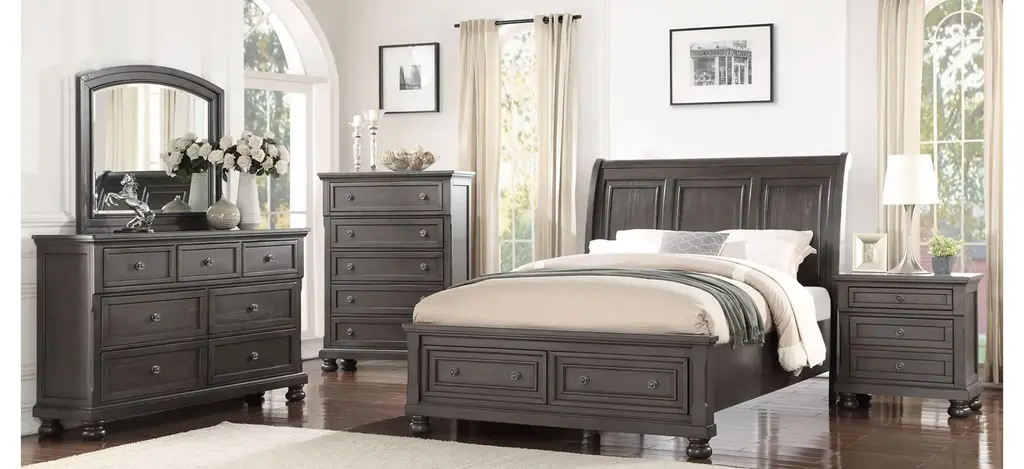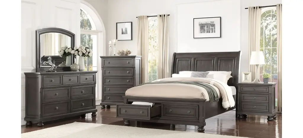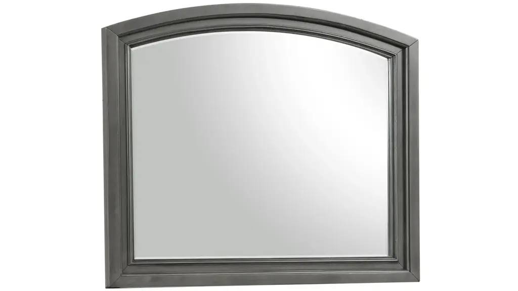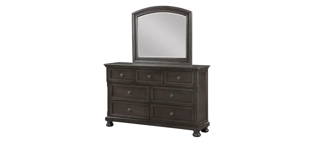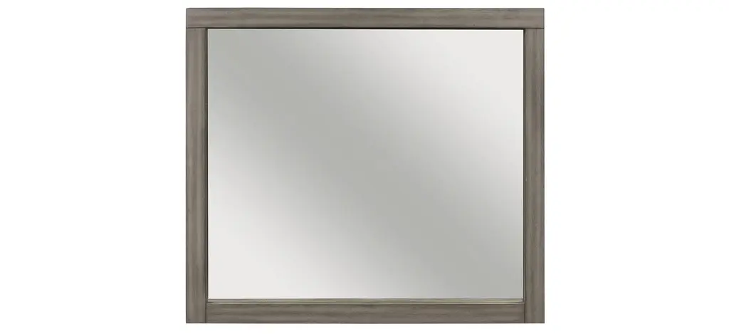 The traditional clean simple lines of Soriah bedroom dresser mirror create a setting sure to please. Pine solids and mindy veneer construction is finished in a warm gray stain which reveals exquisite wood graining. Create your own perfect relaxed surrounding with the beauty of Soriah.