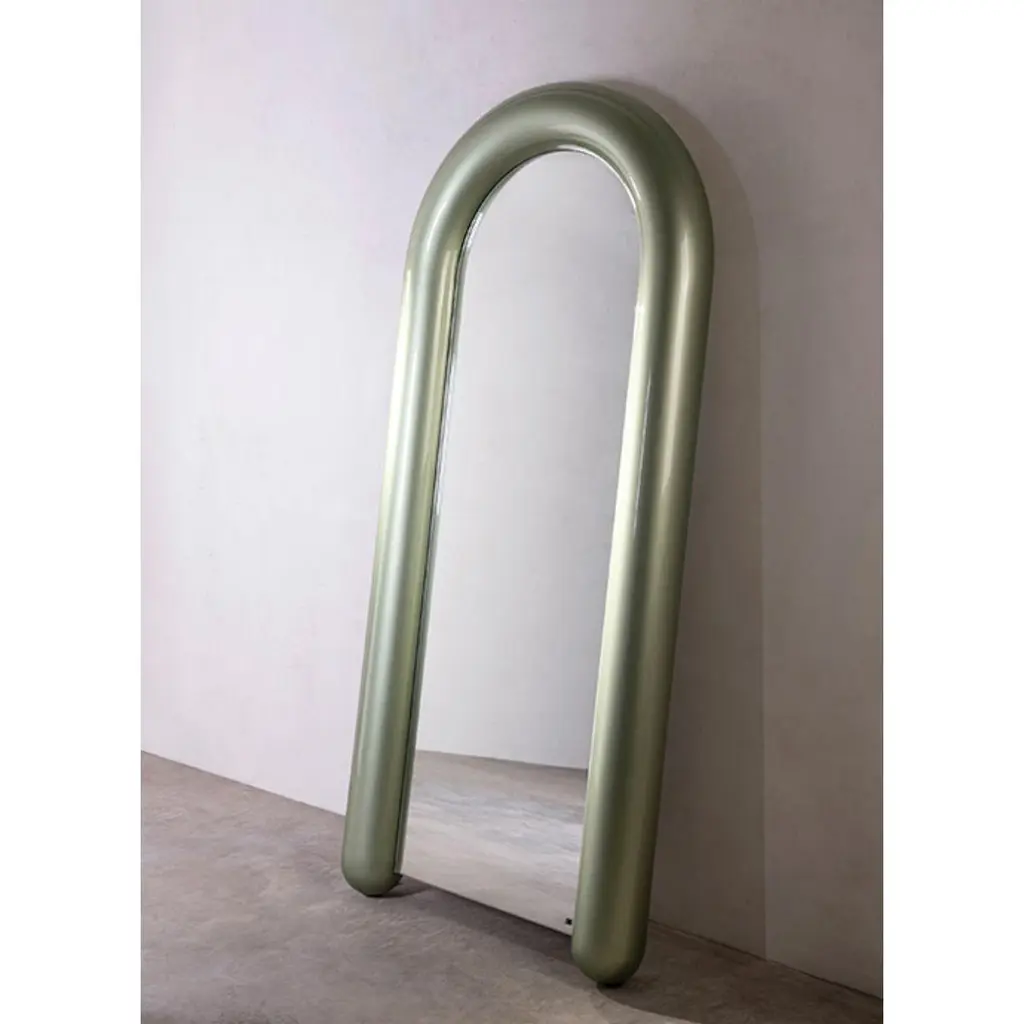 Soufflé mirror by Luca NichettoMaterials: Structure: Menthol NCS 2020 G40Y/Coral NCS 2570 Y70R/Prune NCS 8010 R50B Liquid-painted metal, mirrorDimensions: W91.5 x D16x H200.5 cm With a playful design and an inflated appearance, Soufflé mirror borrows the French expression for ‘blown’ to name itself, emphasising its more evident and distinctive feature.A frame by the puffy and light appearance of a balloon hides inside a wooden structure and contains the arch-shaped surface of the full-length mirror. The tubular fixture, while guaranteeing a variable support point, both on the wall and on the ground, it allows the mirror to assume the ideal position, to adapt accordingly to the environment. Its finishing amplifies the reflectivity, making Soufflé mirror to stand as a functional yetdecorative object.Born in Venice in 1976, he studied there at the IUAV, the Venice University Institute of Architecture, from which he graduated in Industrial Design. In 1999, he started his career designing his first projects for Salviati using Murano glass.He went on to collaborate with Foscarini as a designer and consultant. In 2006, he establishedhis own studio in Venice, which specialised in Industrial Design and design consulting. Five yearslater, in 2011, Nichetto opened a second studio in Stockholm, Sweden, where he now works andresides.Throughout his career, Nichetto has served as Art Director for a number of international design brands.